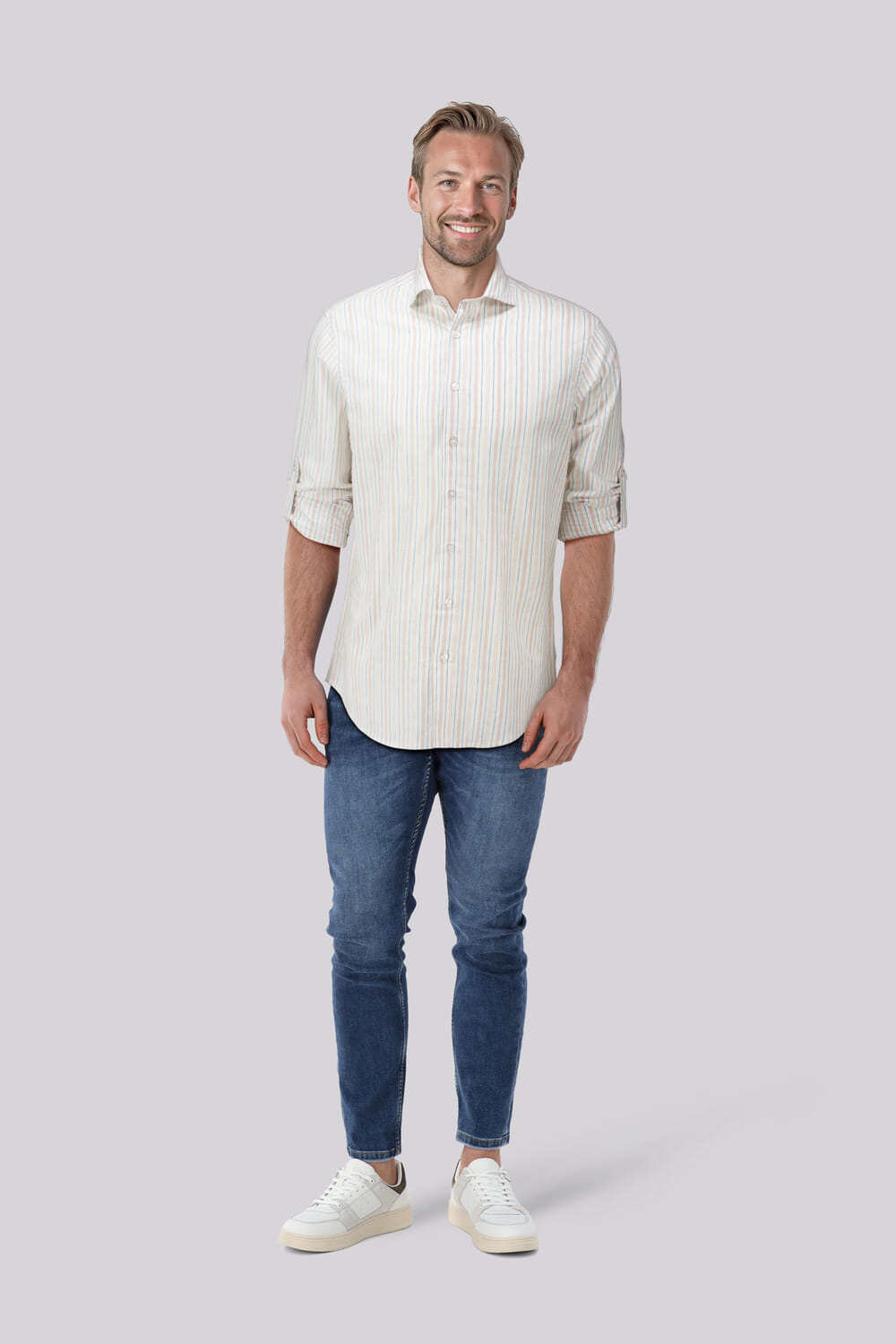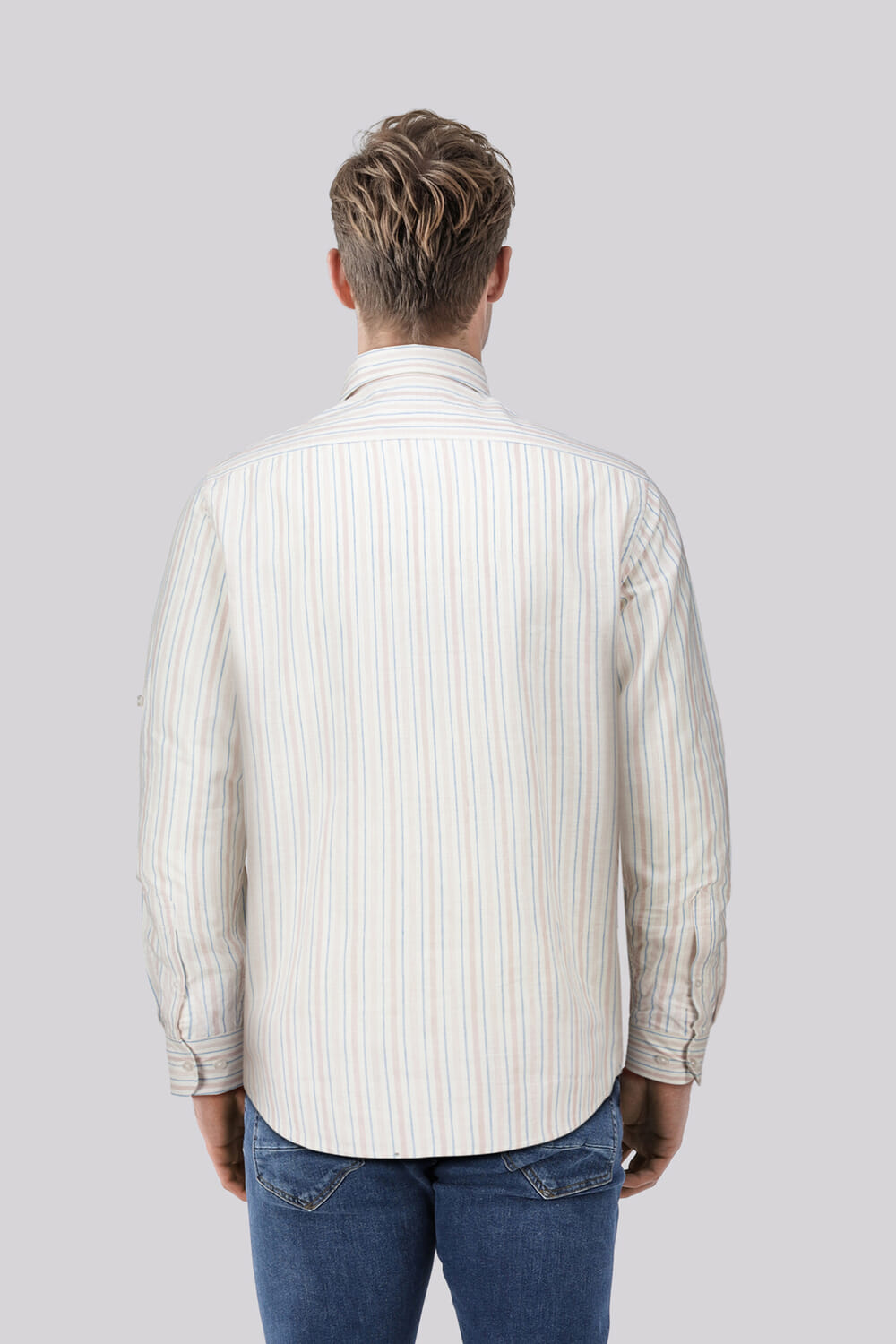 Het Linnen Overhemd van Bomont is een casual herenoverhemd met een opstaande kraag en strepenpatroon. Dit stijlvolle shirt heeft lange mouwen met knopen bij de manchetten en zakken op de voorzijde. Ideaal voor een ontspannen, maar modieuze uitstraling.