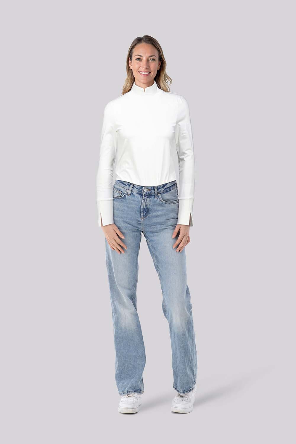 Deze Bomont longsleeve is een elegante dames top met lange mouwen, een col en een opstaande kraag. De getailleerde pasvorm accentueert subtiel het figuur. Het effen ontwerp maakt deze top een veelzijdige toevoeging aan elke garderobe. Ideaal voor zowel casual als formele gelegenheden.