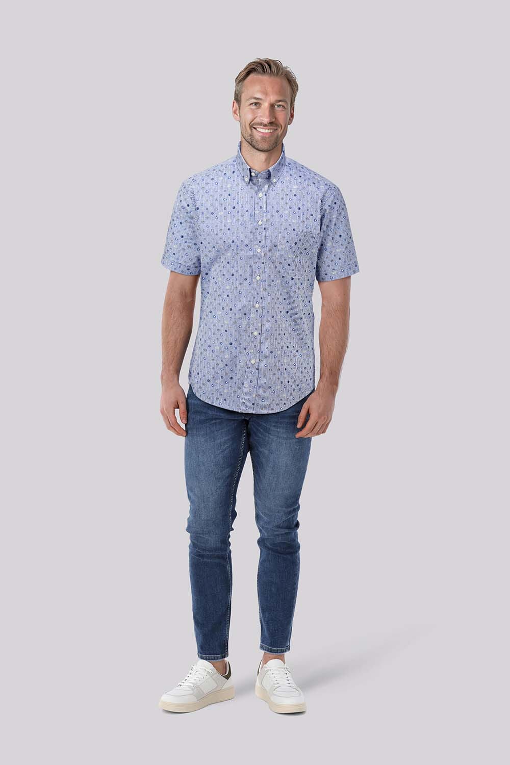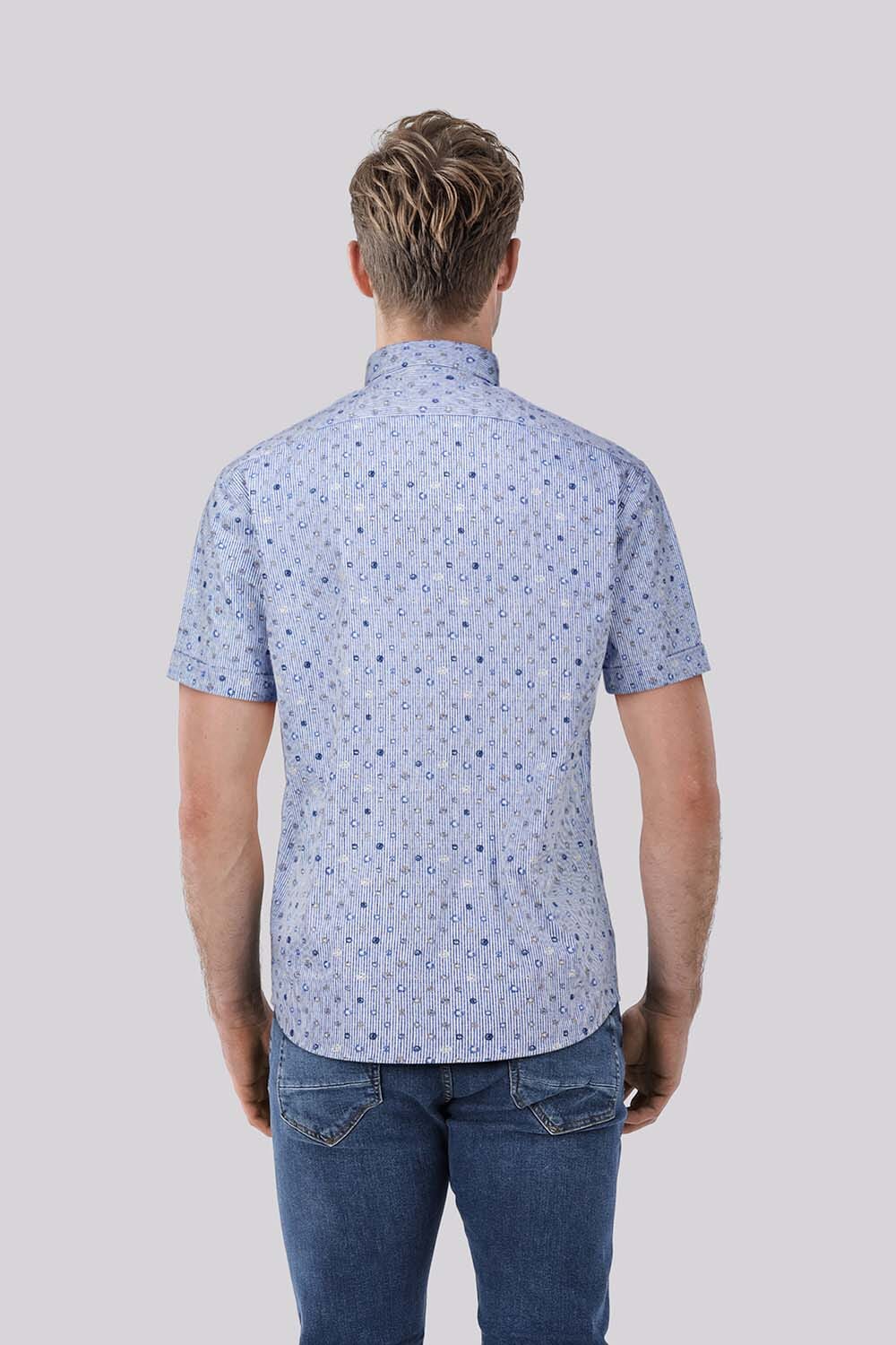Dit overhemd van Bomont is een casual heren overhemd met een button down kraag en korte mouwen. Het unieke patroon combineert effen kleuren met subtiele strepen en een all-over design. Voorzien van knoopsluiting en handige zakken op de voorzijde, ideaal voor een ontspannen gelegenheid.