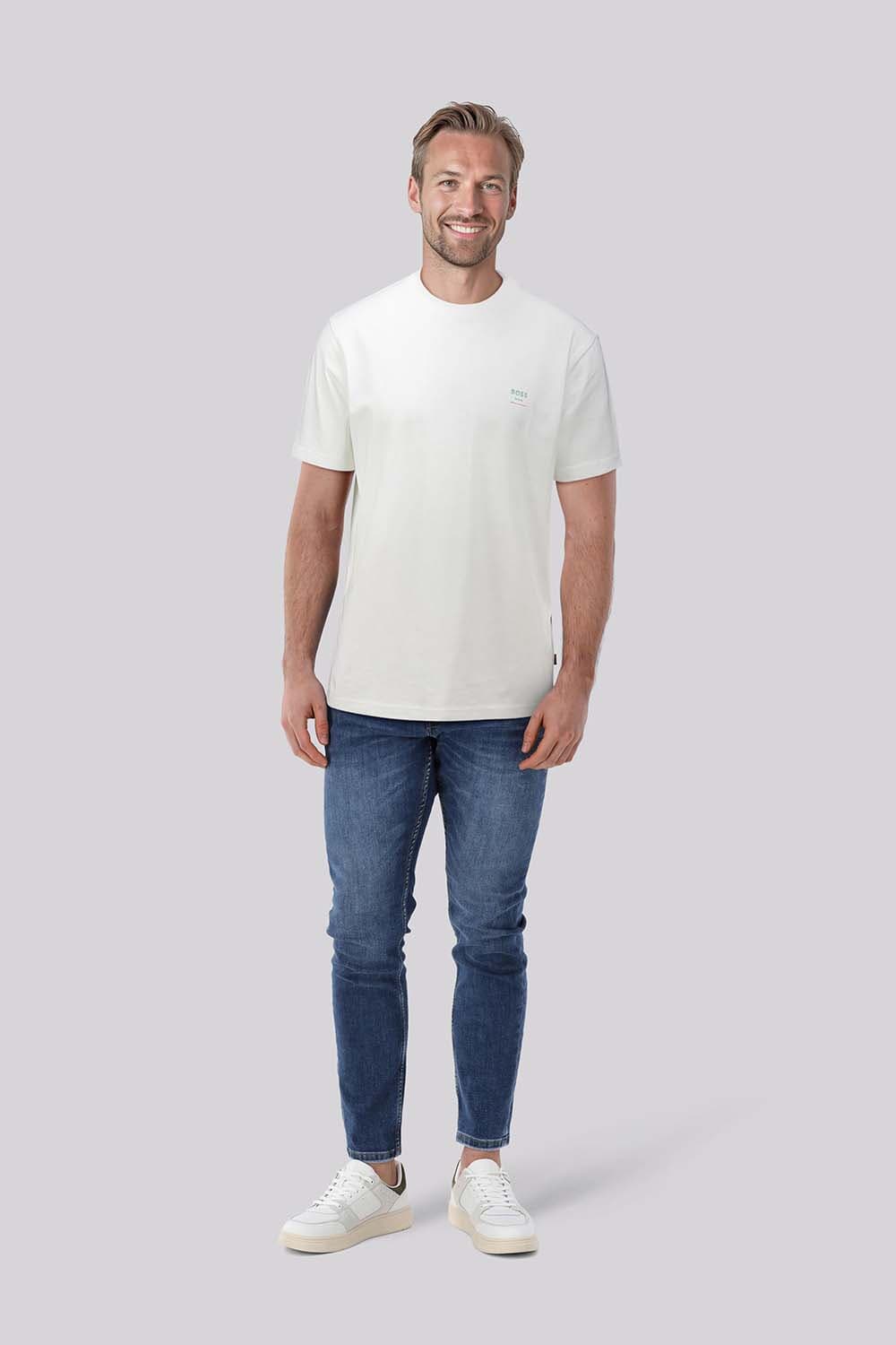 T-Shirt van Boss Orange met ronde hals, korte mouwen en casual pasvorm. Het model is uitgevoerd in lichtblauw en heeft een subtiel logo op de borst, plus een groot, grafisch logo op de rug. Draagt prettig en combineert moeiteloos met jeans of een chino.