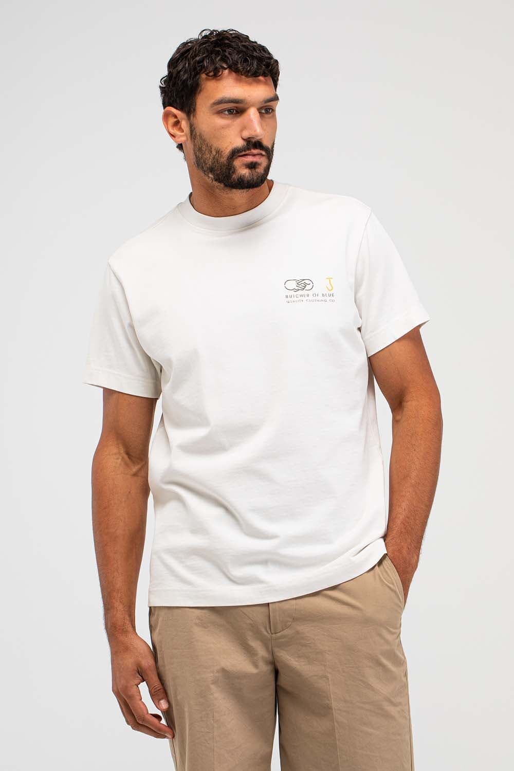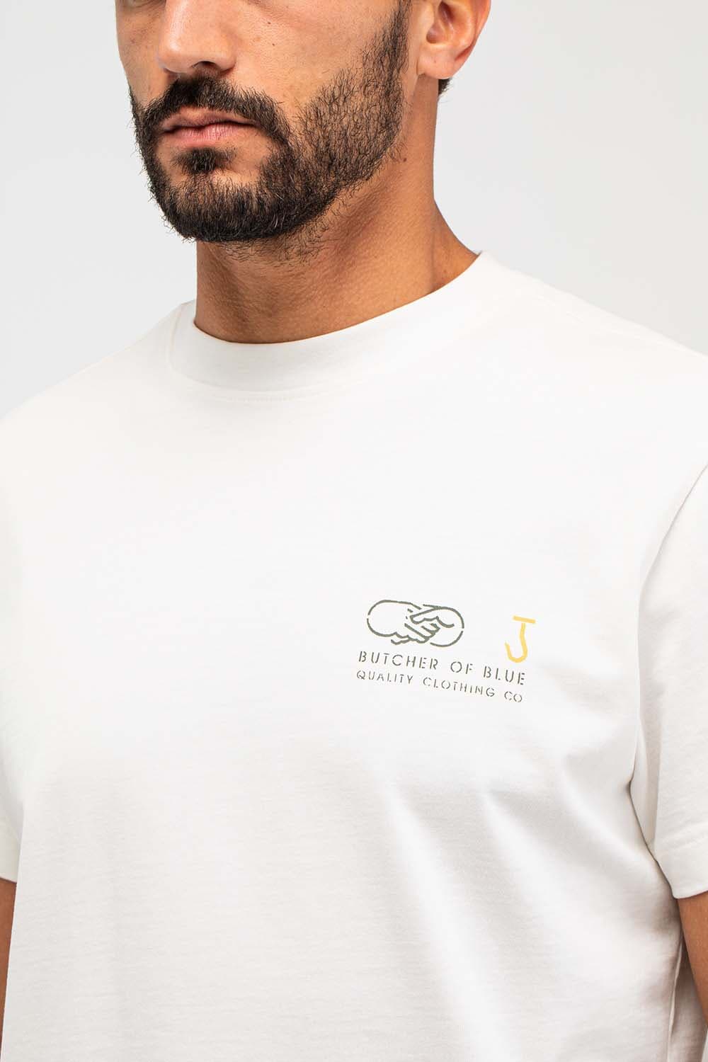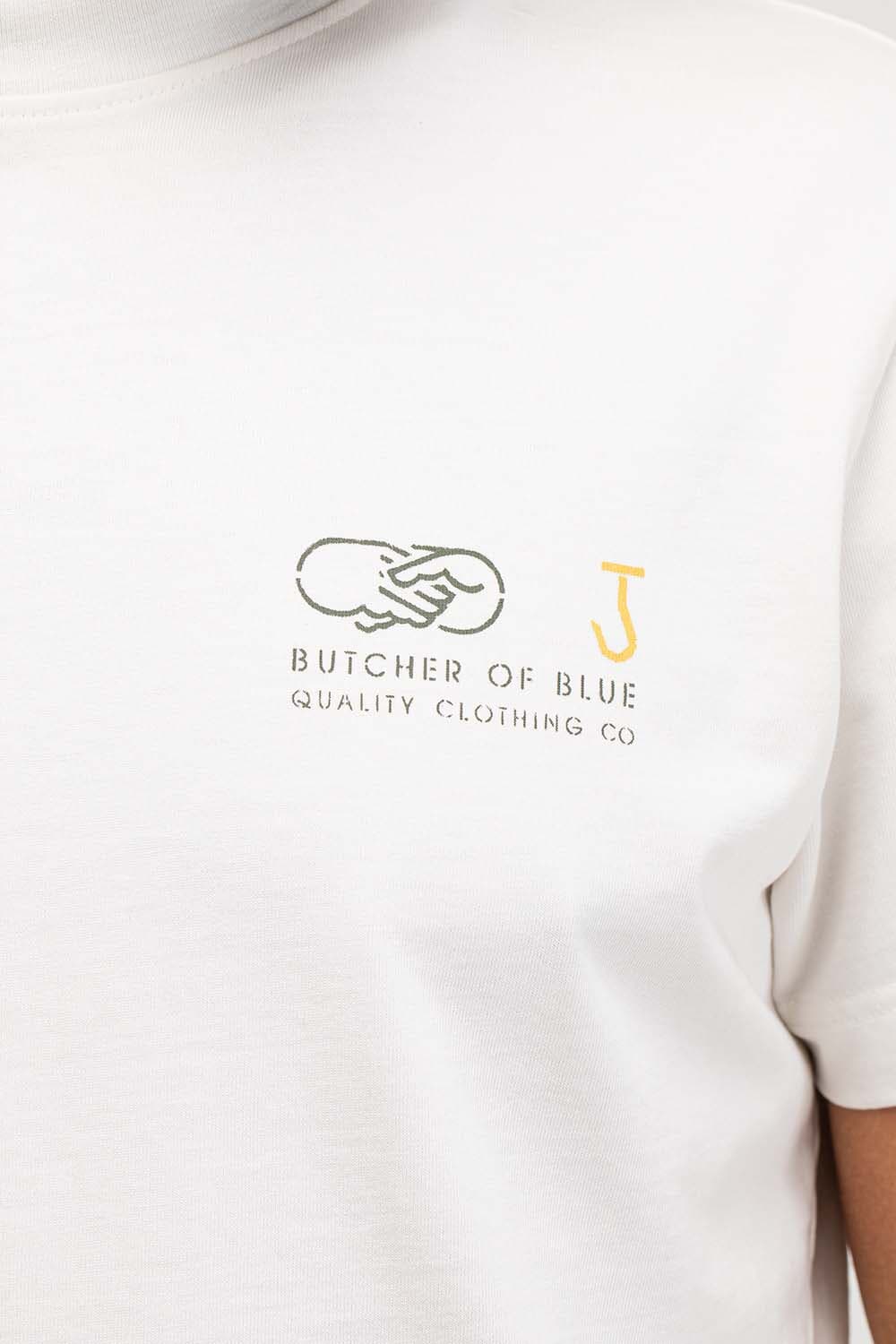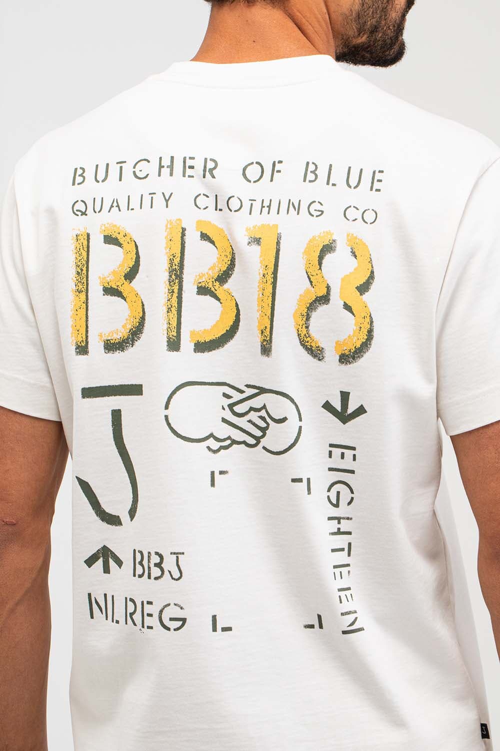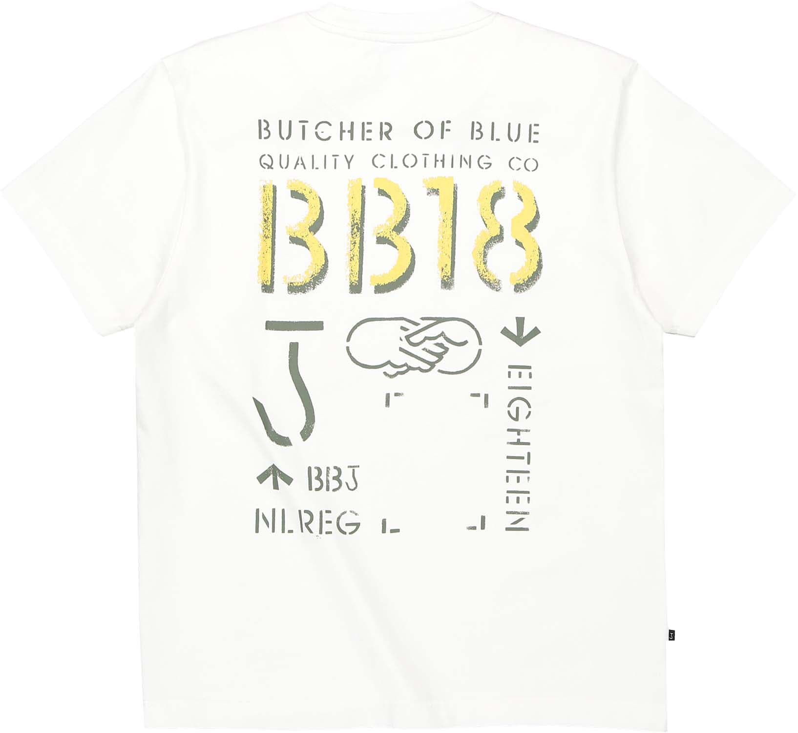 T-shirt van Butcher of Blue met ronde hals, korte mouwen en casual pasvorm. Het logo op de borst is subtiel, terwijl de grote rugprint met BB18, typografie en handdruk-illustratie zorgt voor karakter. Draag met jeans of chino en sneakers voor een relaxte set.
