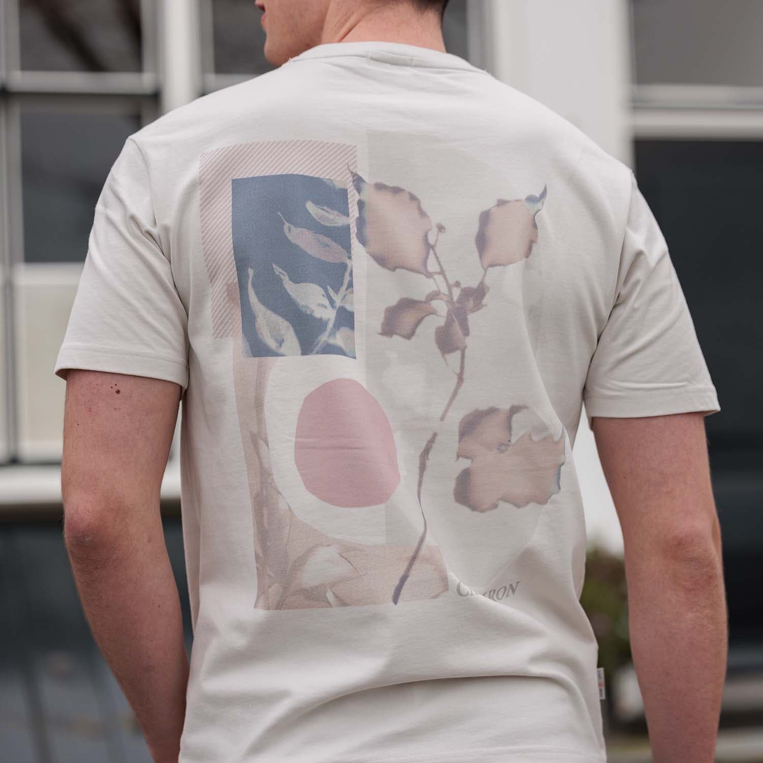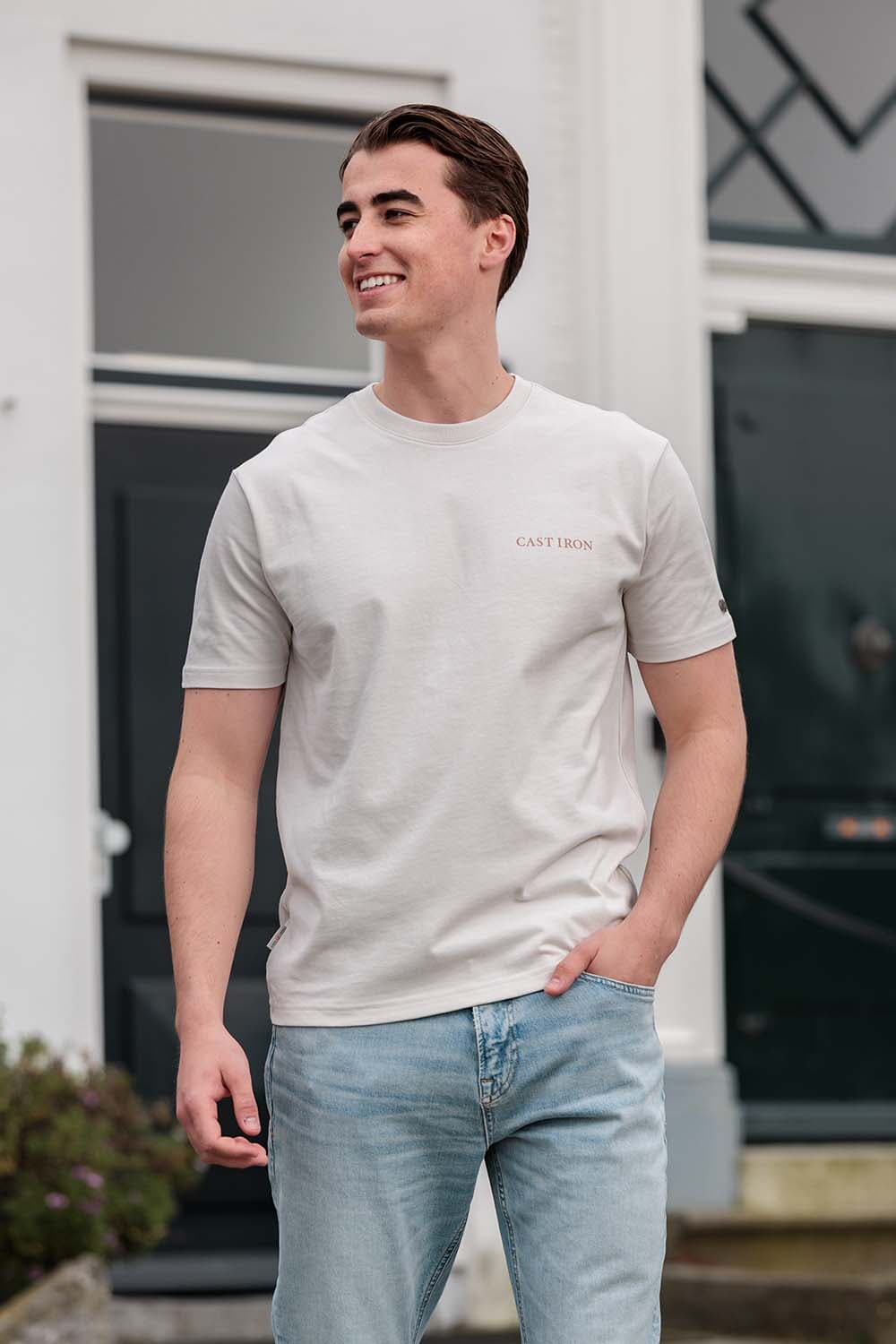 T-shirt van Cast Iron met ronde hals en korte mouwen, uitgevoerd in een rustige, lichtbeige tint. Het model heeft een klein logo op de borst en een grote grafische bloemenprint op de rug. Casual te dragen met jeans of een overshirt.