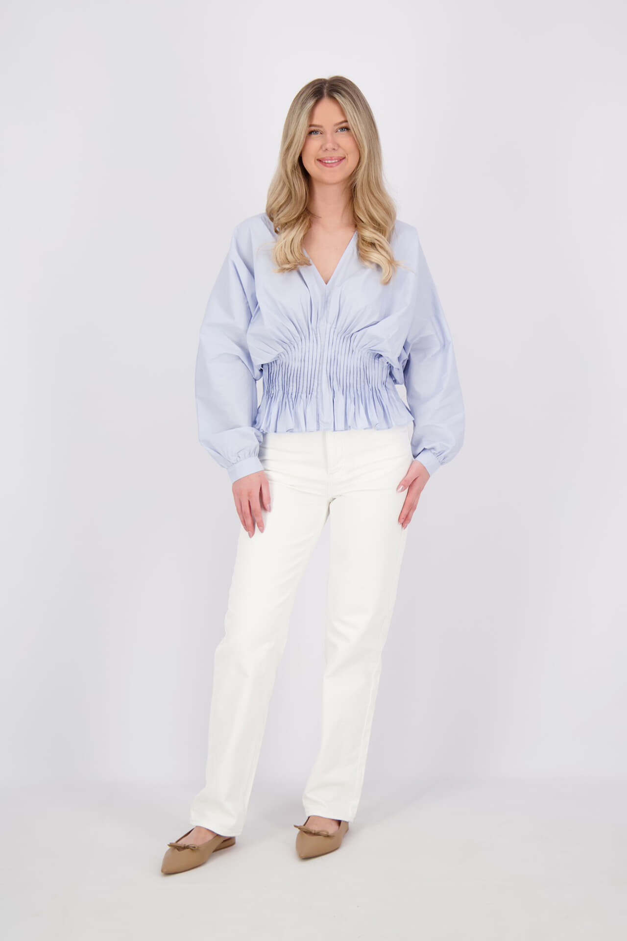 De Blouse Poplin van Copenhagen Muse is een stijlvolle blouse met een getailleerde pasvorm, knopen en lange mouwen. De effen kleur en de V-hals geven een elegante uitstraling, perfect voor elke gelegenheid. Deze blouse voegt een vleugje vrouwelijkheid toe aan elke outfit.
