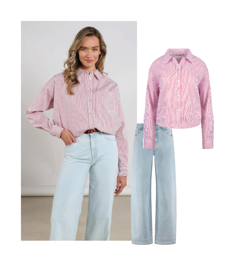 Ontdek een van de meest vrouwelijke en frisse Nukus looks van dit seizoen: een stijlvolle combinatie van de Nukus Blouse Ariana Stripe in rood, de Abby Strass Jeans Light en de Zusss Bloem Studs in goud. Deze outfit is perfect voor dames die houden van een elegante, maar toegankelijke uitstraling. Ideaal voor een dag op kantoor, een lunchafspraak of een casual-chique gelegenheid.