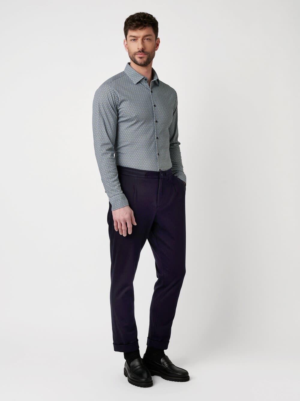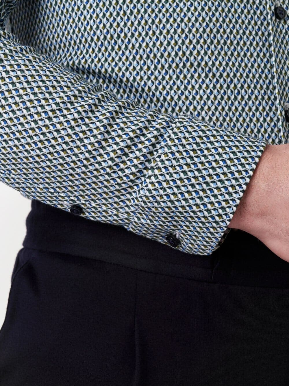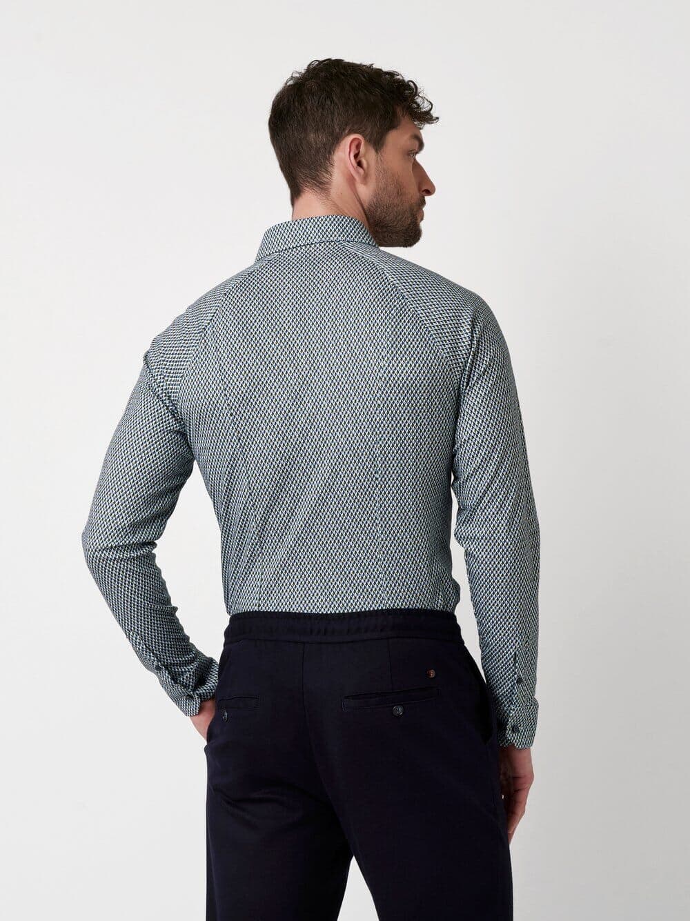 Het Overhemd Kent Casual van Desoto is een stijlvol business overhemd met een spreidkraag en lange mouwen. Het overhemd heeft een unieke 3D-print en is afgewerkt met manchetten met knopen. Praktische zakken op de voorzijde en een sluiting met knopen completeren het geheel.