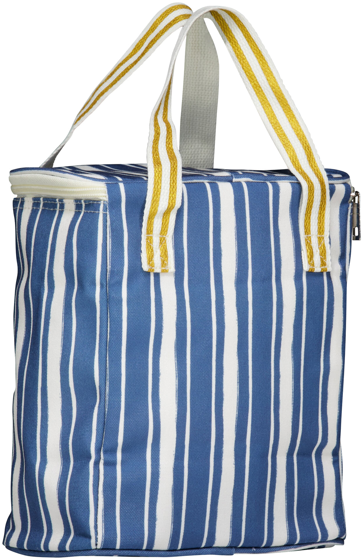 Koeltasje Cin Cin 21x12x25 cm van Dutch Decor is een praktisch item voor tuin. Het casual ontwerp heeft blauwe strepen, een geel Cin Cin-logo, stevige handgrepen met gele strepen en een rits. Handig voor lunch en drankjes, ook als tas bij een picknick.