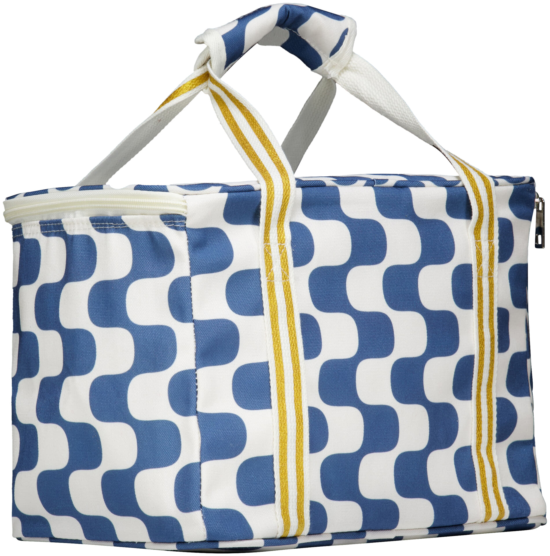 Koeltasje Sante 30x22x20 cm is een casual item voor tuin van Dutch Decor, met grafisch blauw-wit patroon en ritsluiting. Stevige, brede draaghengsels met geel accent liggen prettig in de hand. Handig voor lunch of drankjes. Combineer met een picknickkleed voor een rustige set.