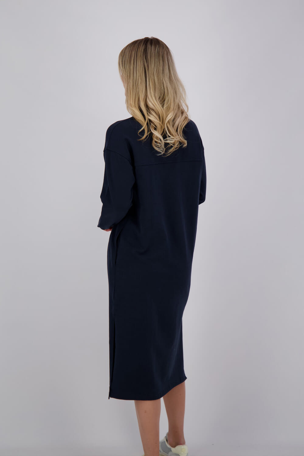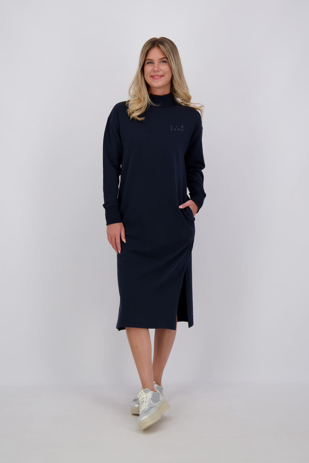 De Sweatjurk Roomie van Elbsand in de categorie dames jurken lange mouw biedt een minimalistisch ontwerp met een opstaande kraag, lange mouwen en ribgebreide mouwboorden. De midi-lengte en de comfortabele pasvorm maken deze jurk ideaal voor elke gelegenheid.