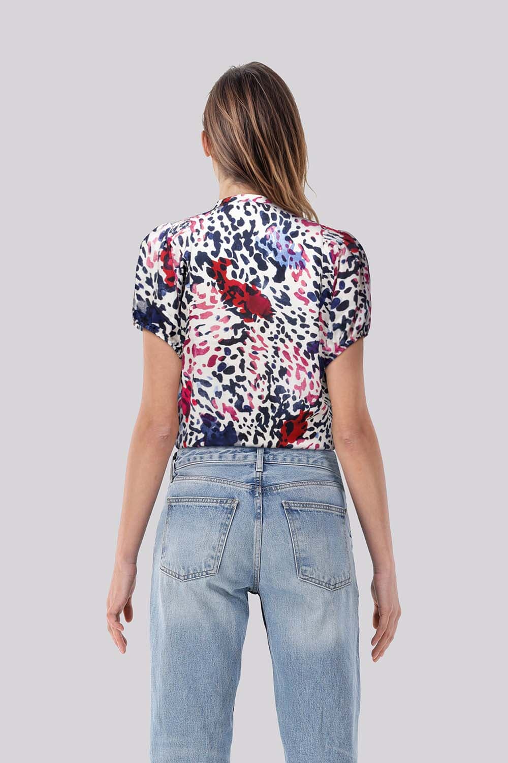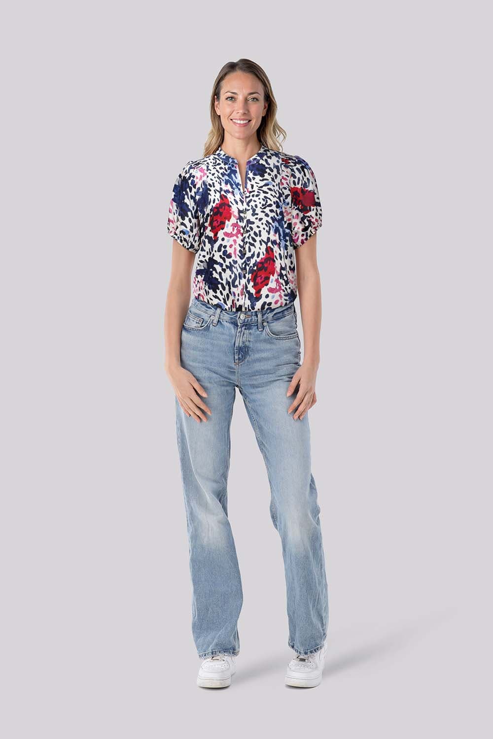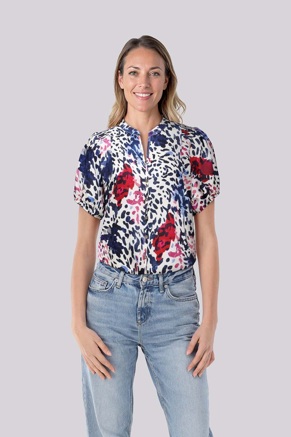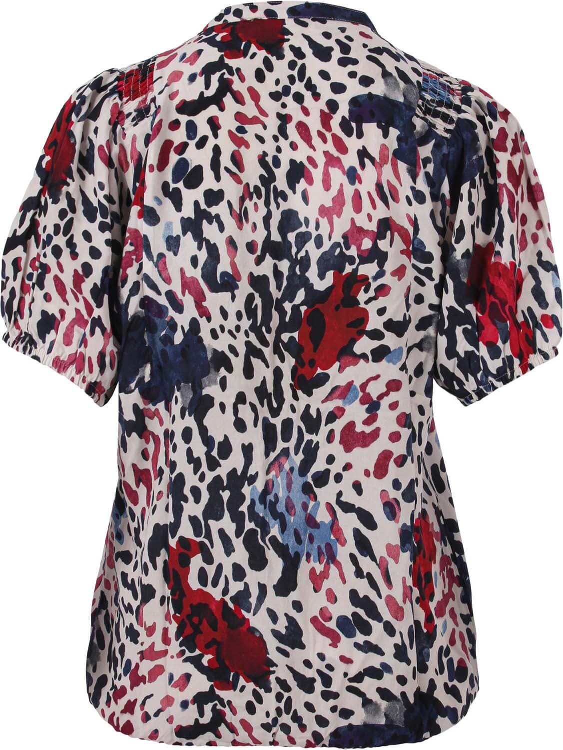 Blouse van Enjoy met een bohemian stijl, ronde hals en korte mouwen. De blouse heeft een panterprintpatroon en knoopsluiting, perfect voor een trendy gelegenheid. De speelse print en het comfortabele ontwerp maken deze blouse een veelzijdige en modieuze keuze voor elke garderobe.