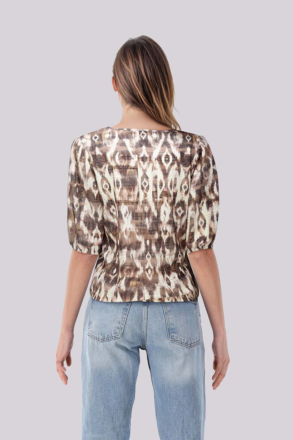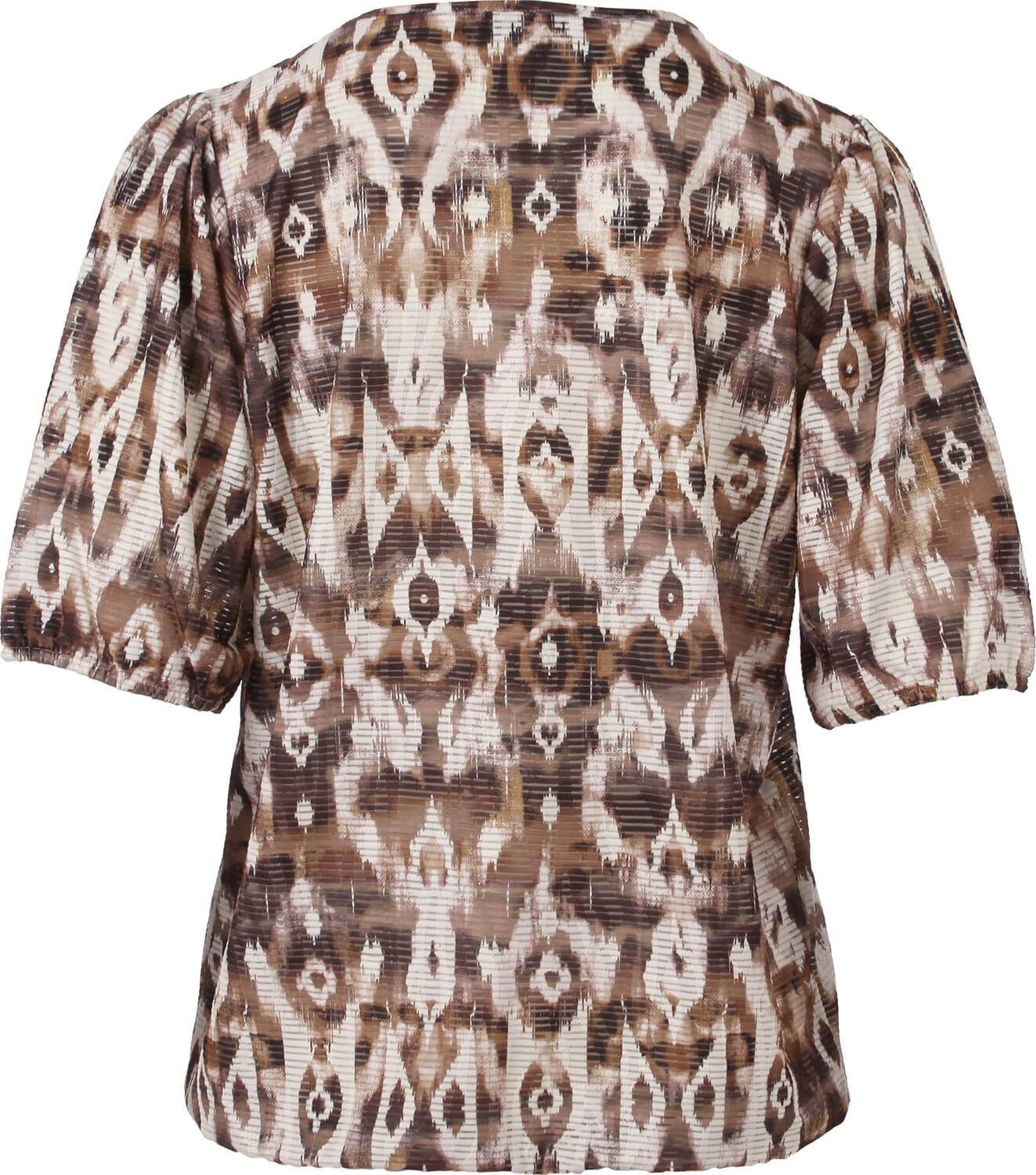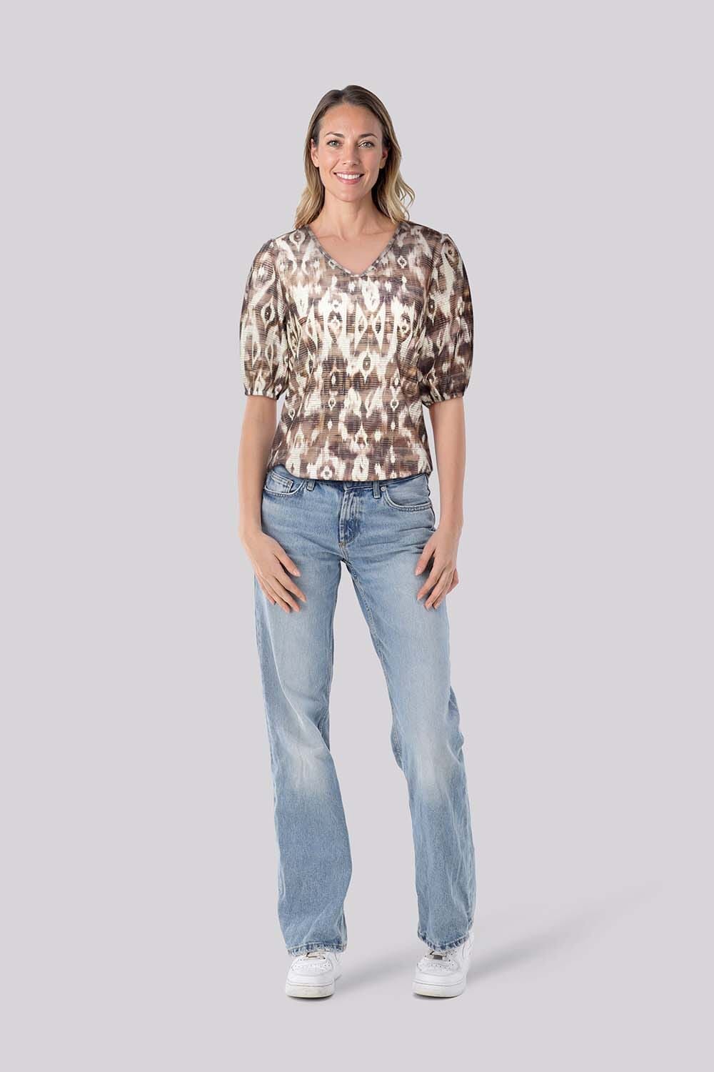 De Blouson V-hals Korte Pofmouw van Enjoy is een casual dames top met een grafisch patroon. De top heeft een V-hals en korte pofmouwen, wat zorgt voor een relaxte pasvorm. Ideaal voor een modieuze en comfortabele uitstraling bij diverse gelegenheden.