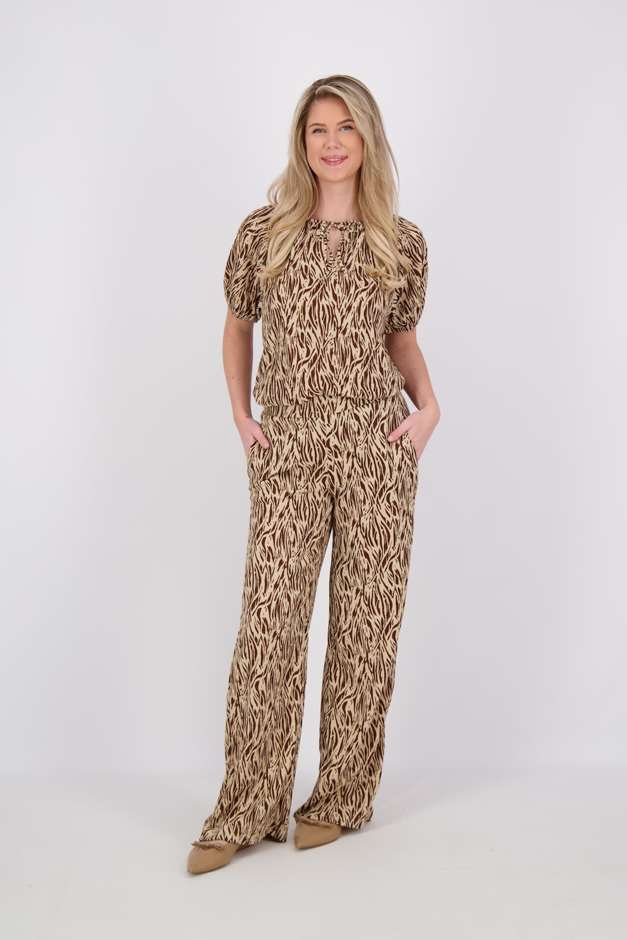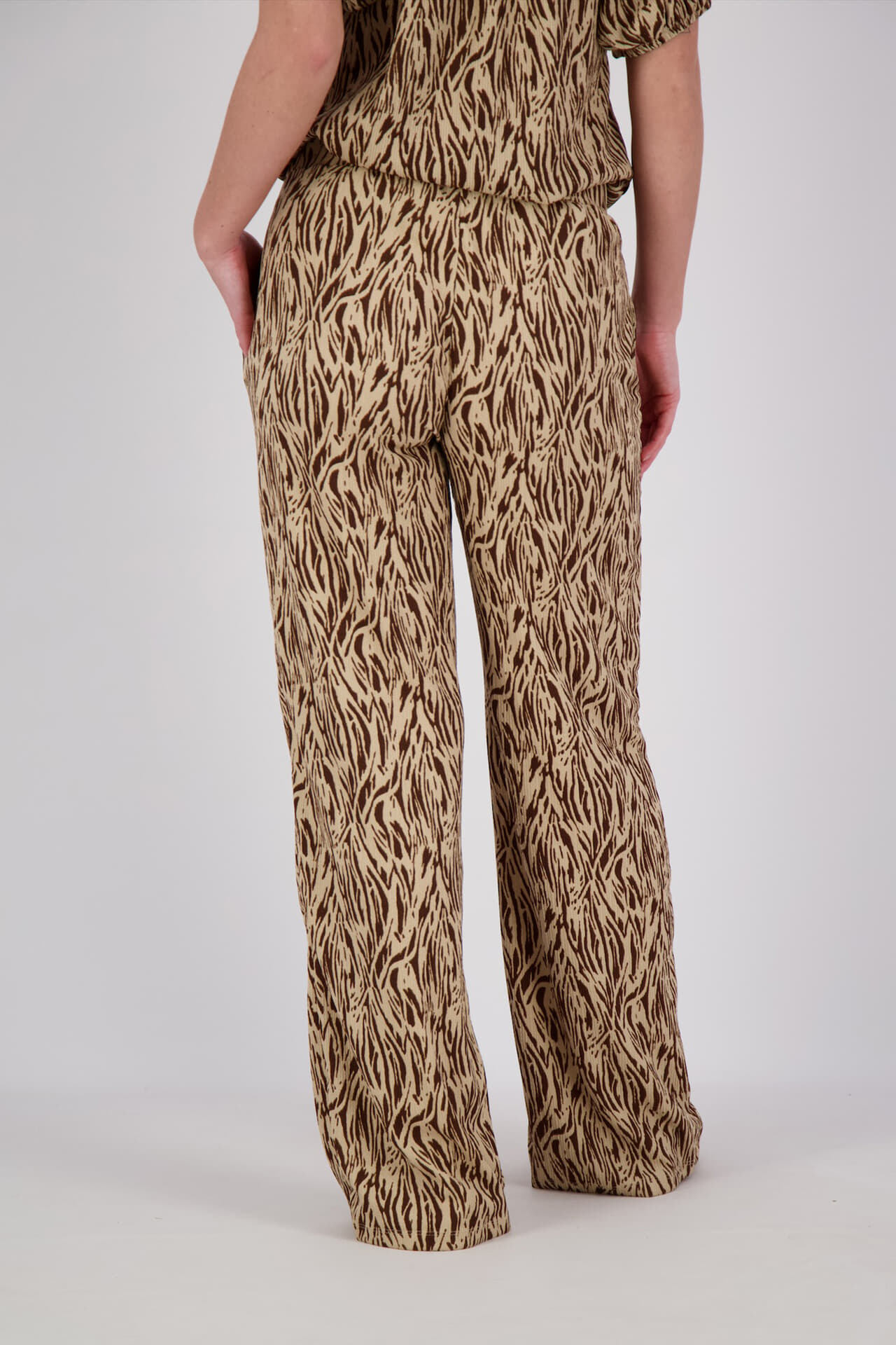 De broek van Enjoy, een dames lange broek, combineert een bohemian stijl met een opvallende dierenprint. Deze bootcut broek straalt flair uit en is ontworpen om comfortabel te dragen. De unieke print geeft een modieuze uitstraling, ideaal voor wie houdt van een vleugje avontuur in de garderobe.