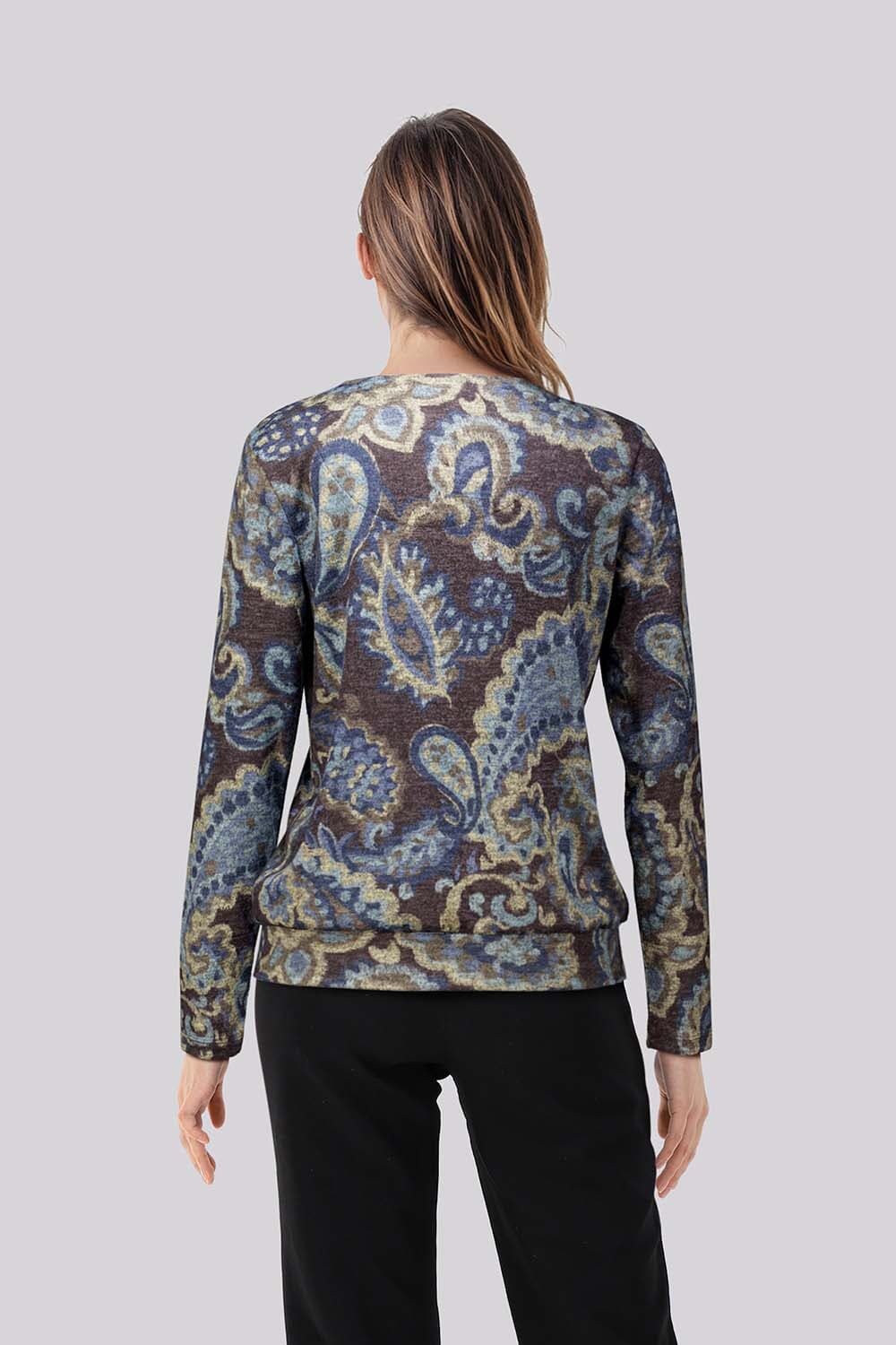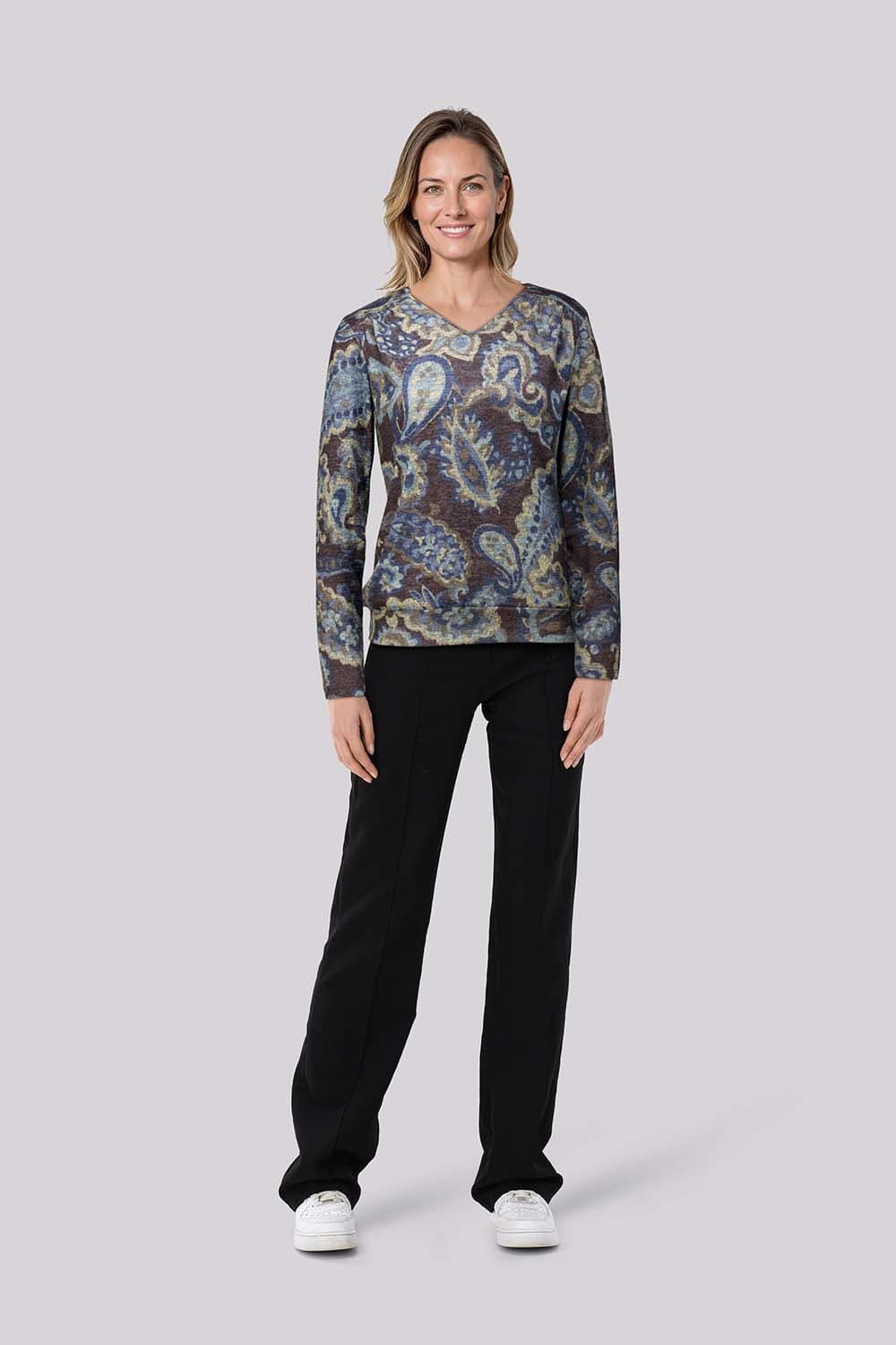 De Sweater van Enjoy is een stijlvolle longsleeve met een bohemian uitstraling. De paisley-print, V-hals en lange mouwen geven het kledingstuk een modieuze en toegankelijke charme. Ideaal voor een casual look met een comfortabele regular fit.