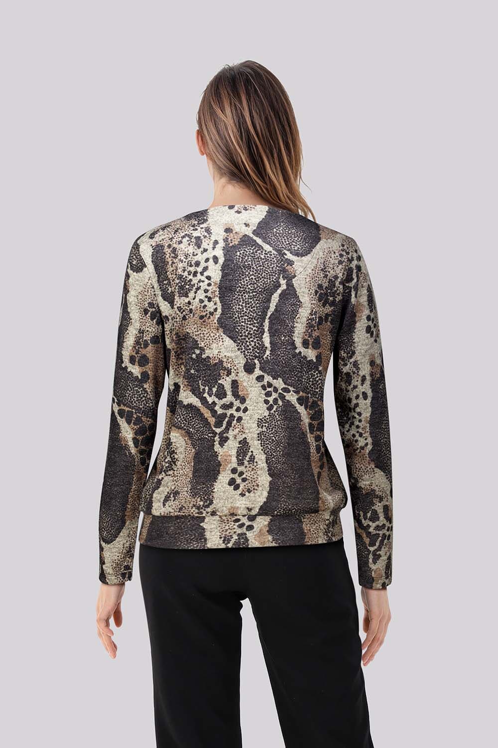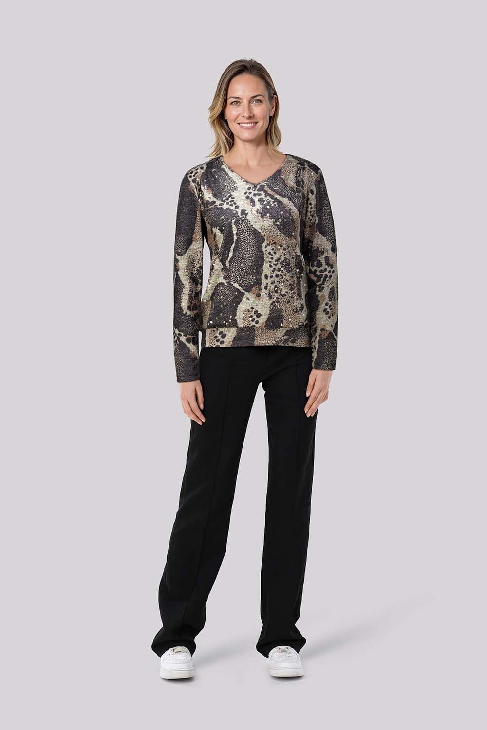 De Sweater van Enjoy is een stijlvolle longsleeve met een casual uitstraling. Het V-hals ontwerp, de regular fit, en de lange mouwen maken dit kledingstuk veelzijdig. De opvallende panterprint voegt een modieuze touch toe aan elke garderobe.
