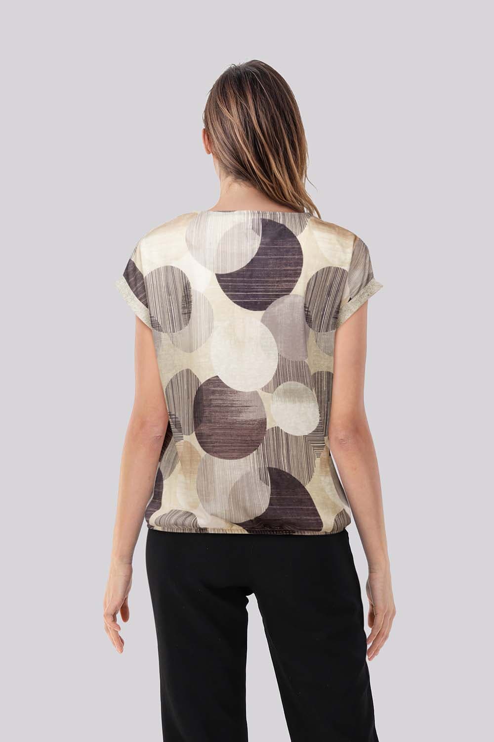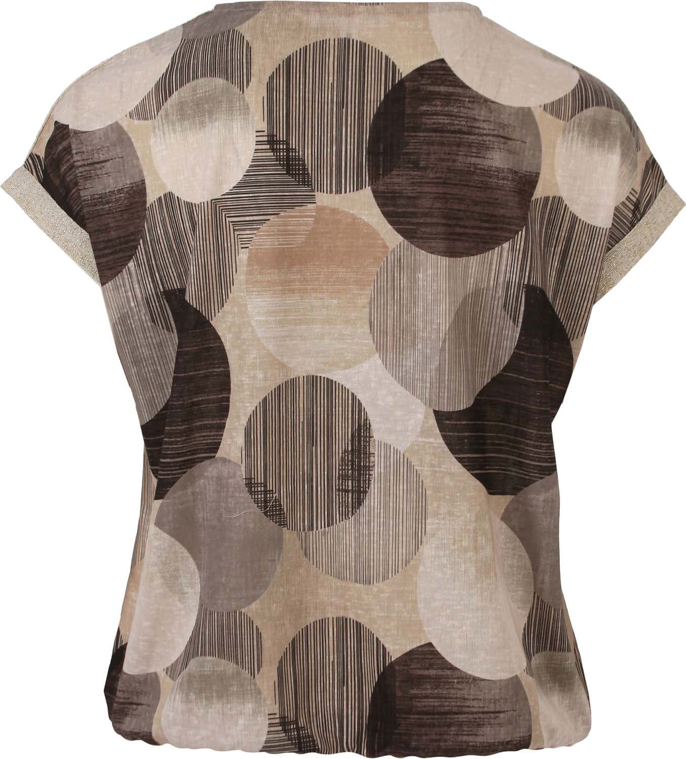 Top korte mouw Top van Enjoy heeft een ronde hals, regular pasvorm en korte mouwen met omslag. De all-over, grafische print met grote cirkels en streepaccenten geeft variatie. Draagt licht en soepel. Combineer met een effen broek of rok voor een rustig geheel.