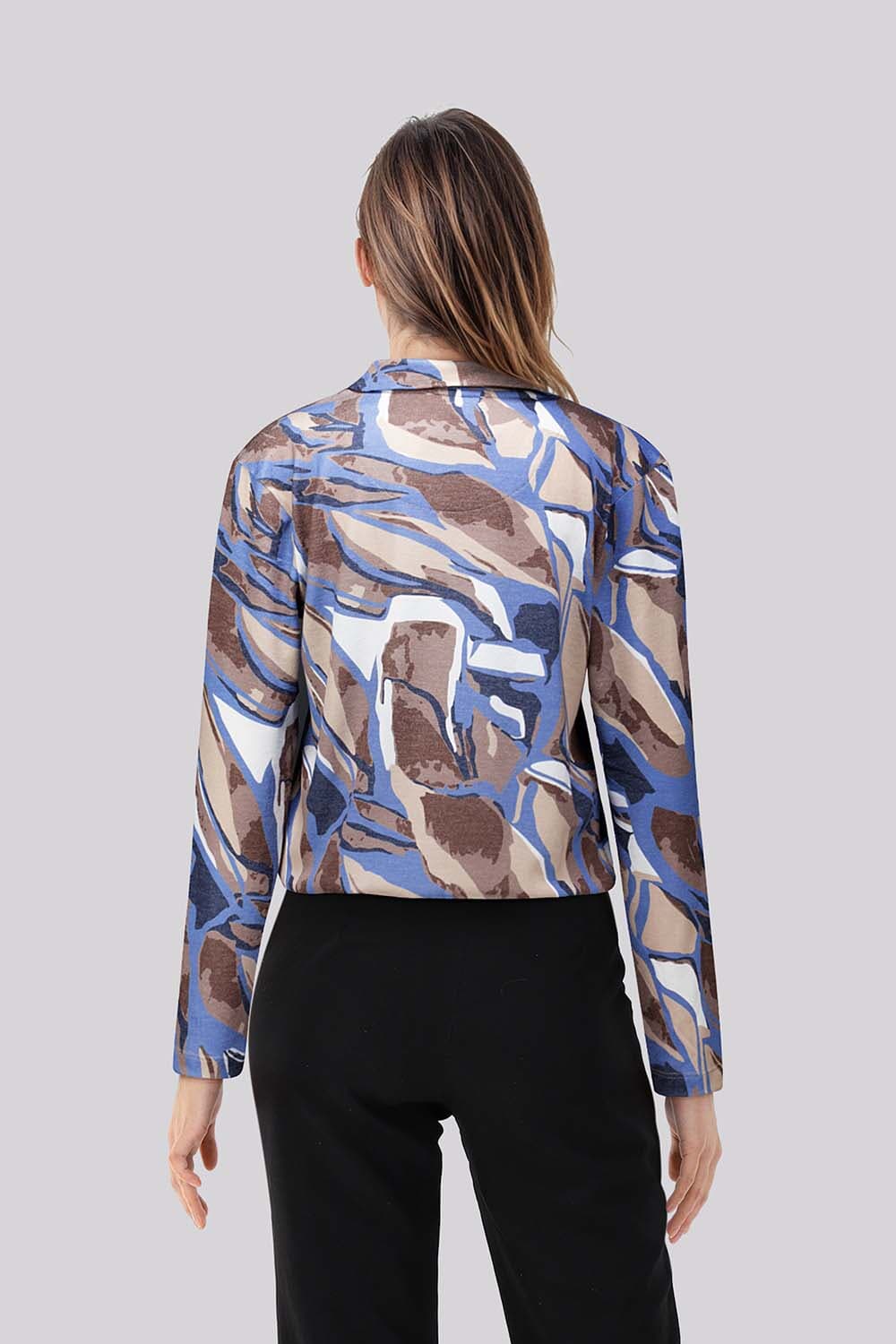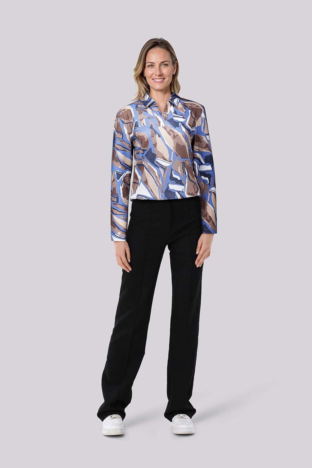 De Enjoy top met lange mouwen combineert een grafisch patroon met een casual stijl. Voorzien van een opstaande kraag en een V-hals, biedt deze top een comfortabele regular fit. Ideaal voor elke casual gelegenheid, brengt deze dames top stijl en gemak samen op inspirerende wijze.