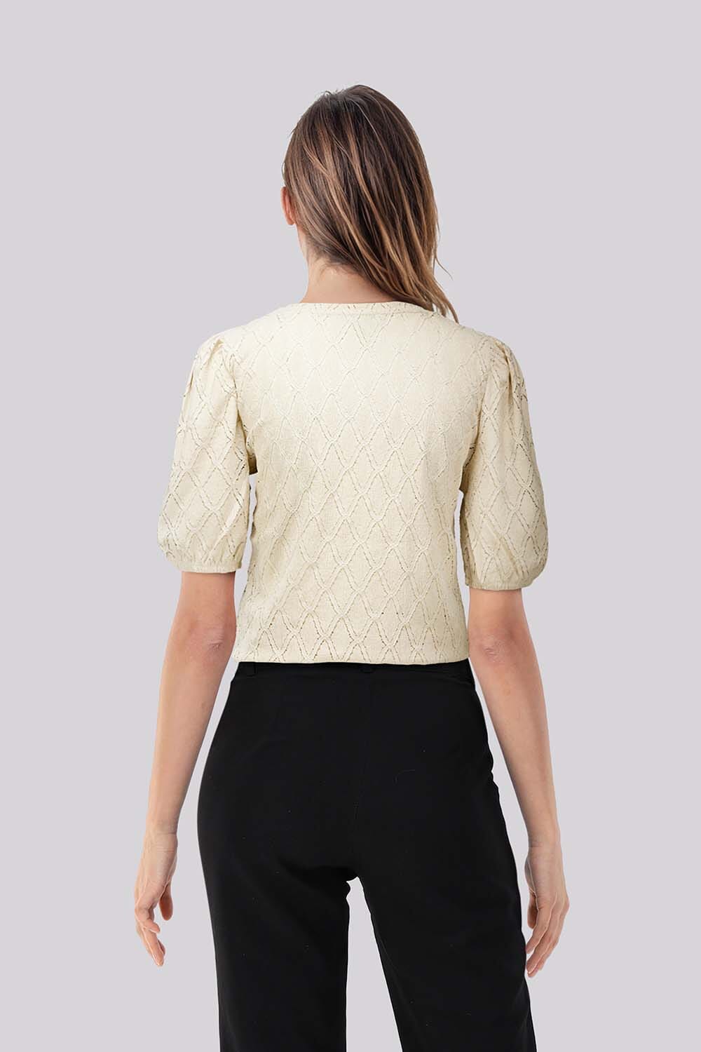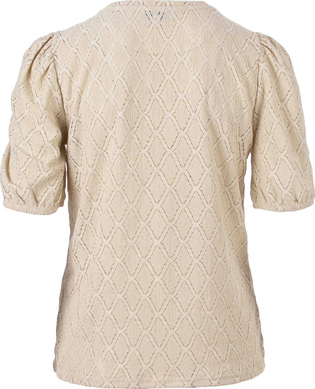 De Top Croche Halve Pofmouw van Enjoy is een stijlvolle toevoeging aan elke garderobe. Deze dames top korte mouw heeft een elegante gaatjespatroon en modieuze pofmouwen van 2/4 lengte, wat het een vrouwelijke uitstraling geeft. Perfect voor elke gelegenheid.