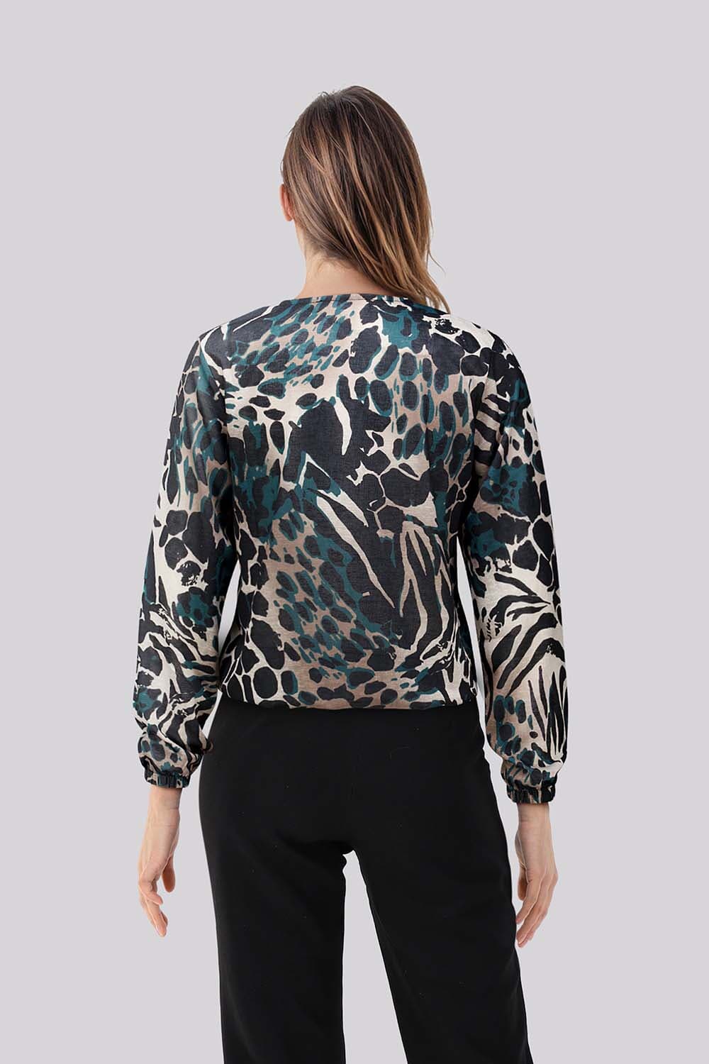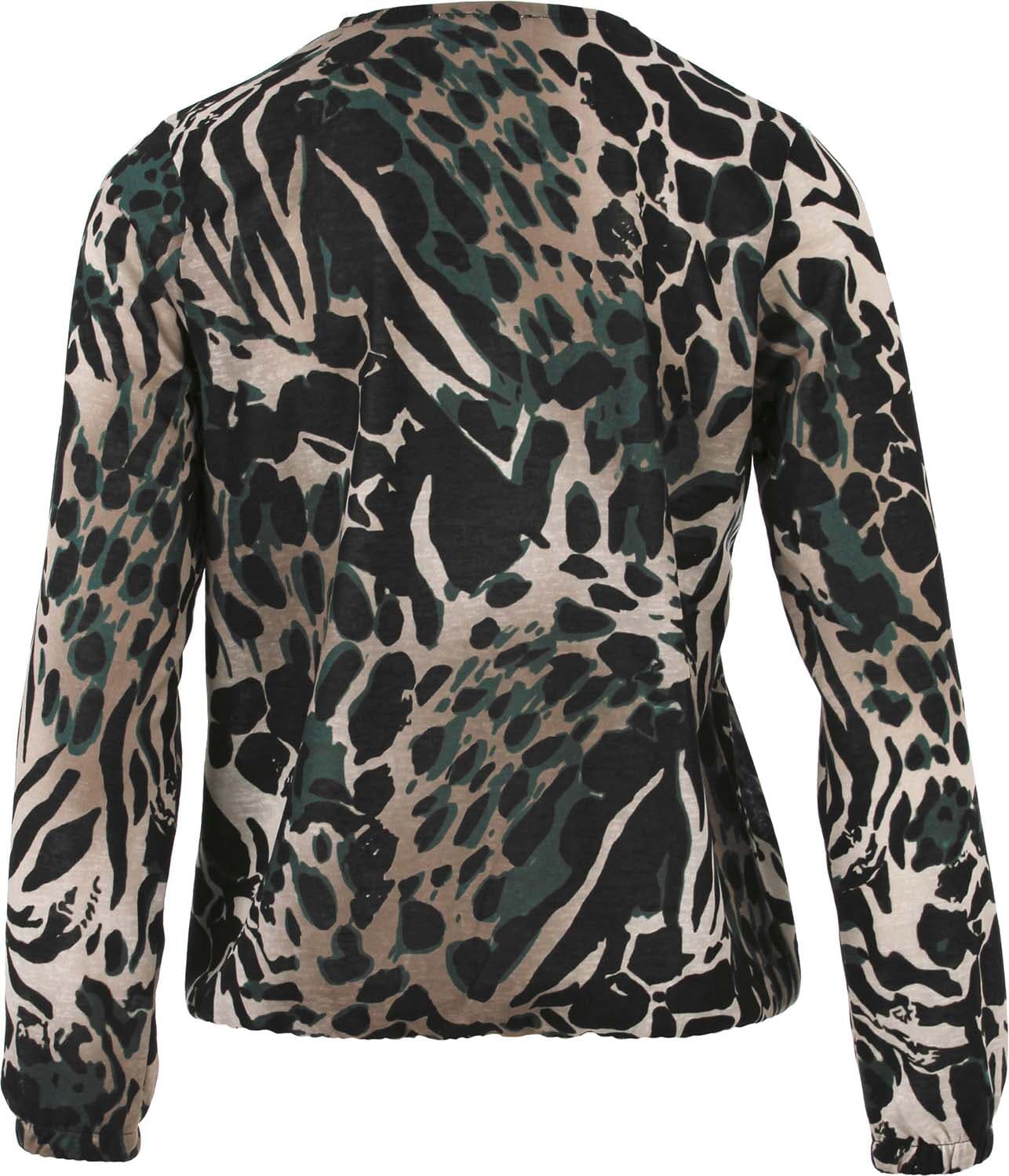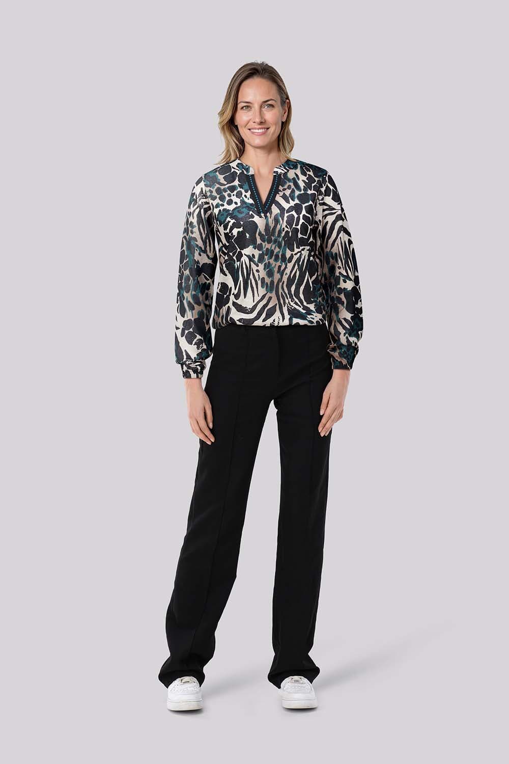 De top van Enjoy is een stijlvolle dames top met lange mouw, perfect voor een casual look. Deze top heeft een speels dierenprintontwerp met subtiele kleuren die makkelijk te combineren zijn. De comfortabele stof en ontspannen pasvorm maken het een veelzijdige keuze.