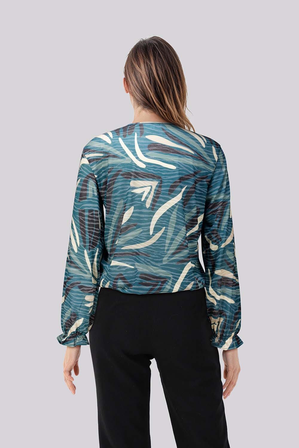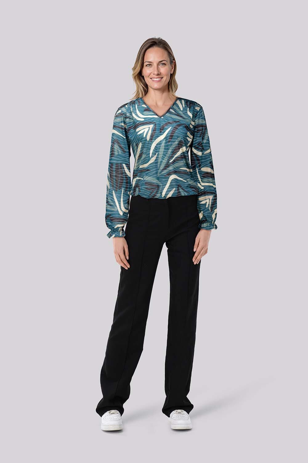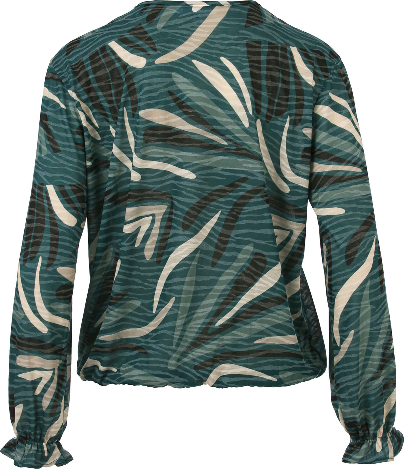 De Enjoy top met camouflagepatroon en V-hals biedt een casual en stijlvolle uitstraling. De lange mouwen met elastische manchetten zorgen voor comfort, terwijl de losse pasvorm veelzijdigheid biedt. Deze dames top lange mouw is ideaal voor elke casual gelegenheid.