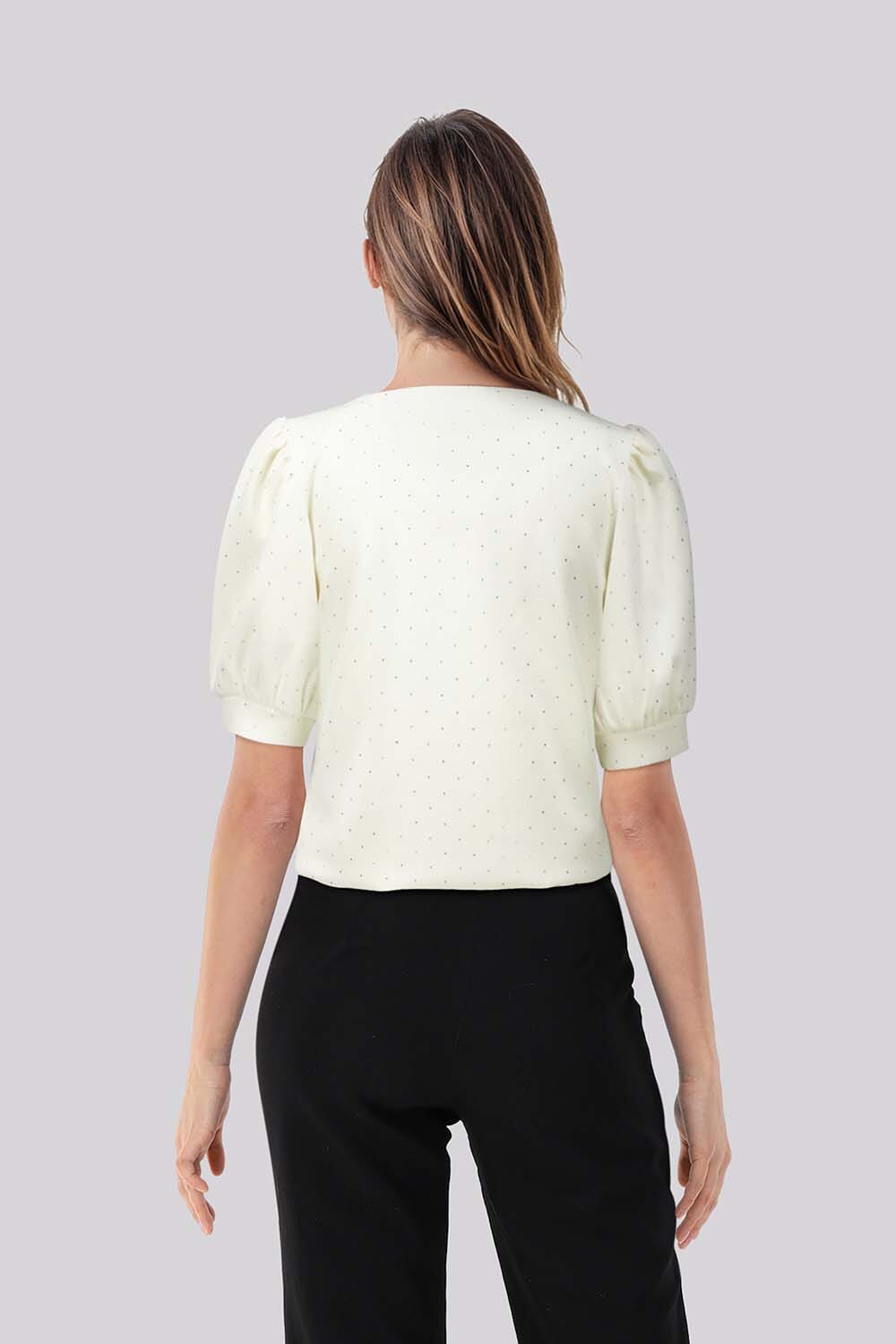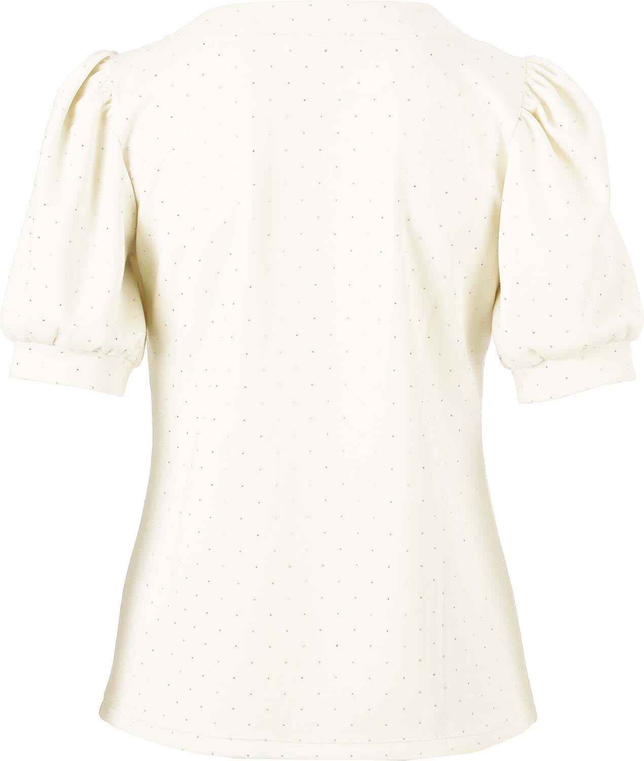 De Top met Strass Steentjes van Enjoy biedt een stijlvolle, casual uitstraling met pofmouwen en een ronde hals. Deze effen dames top korte mouw heeft een regular fit en is ideaal voor elke gelegenheid. Subtiele stippenpatroon voegt een speelse touch toe.