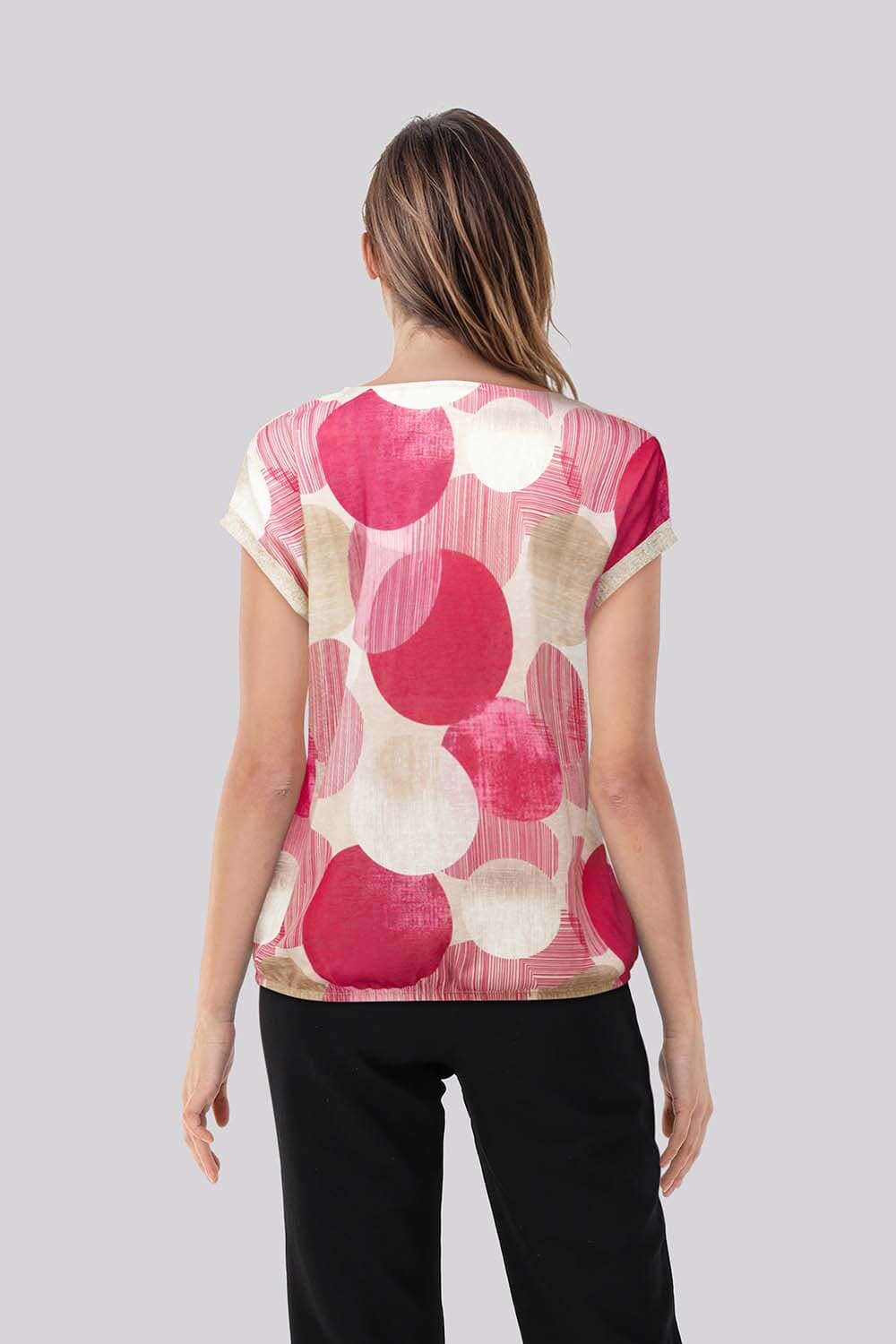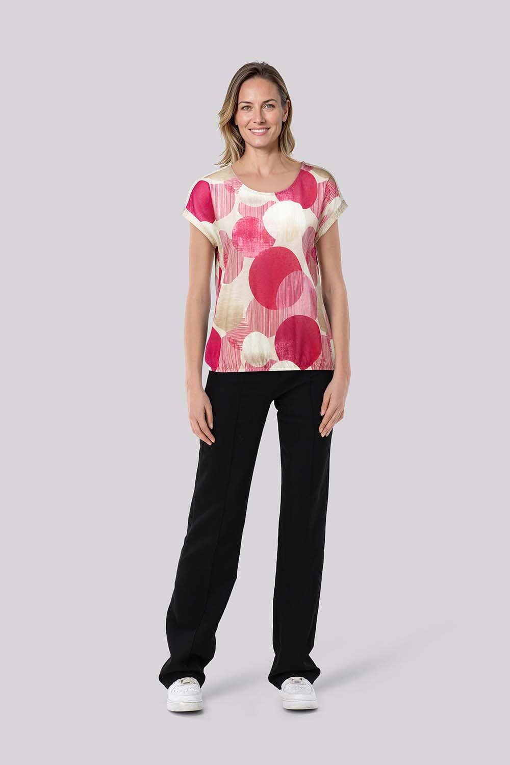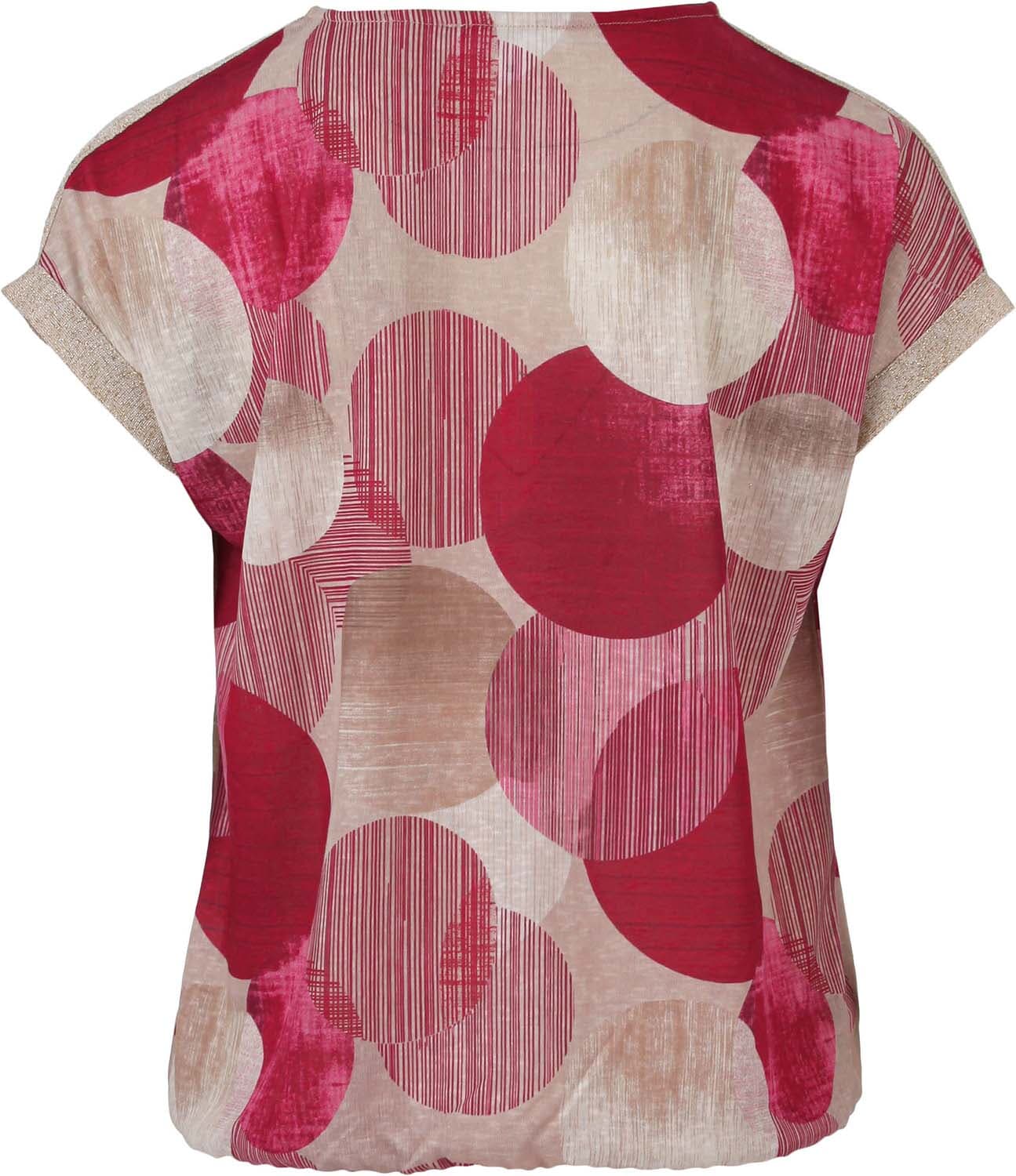 Top korte mouw Top van Enjoy heeft een ronde hals, regular pasvorm en korte mouwen met omslag. De all-over, grafische print met grote cirkels en streepaccenten geeft variatie. Draagt licht en soepel. Combineer met een effen broek of rok voor een rustig geheel.
