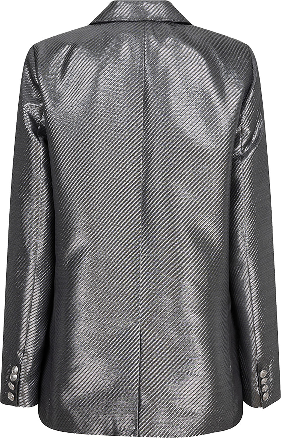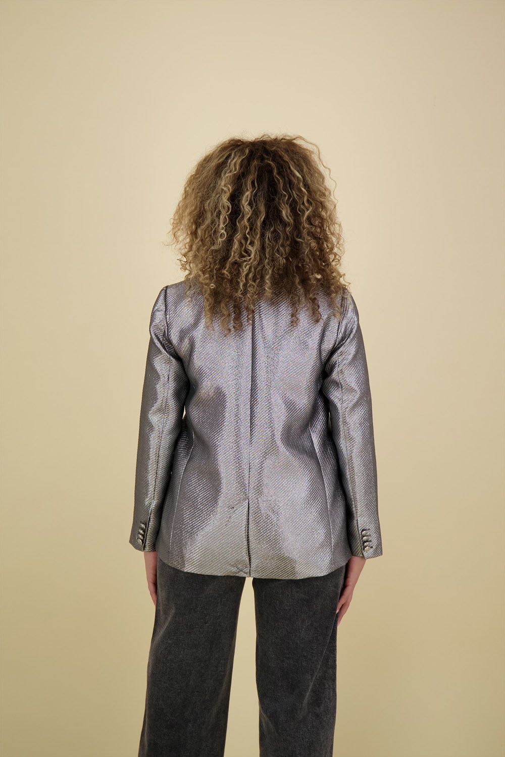 Deze metallic blazer van Esqualo, een verfijnde dames blazer, combineert een grafisch patroon met een reverskraag, lange mouwen en manchetten met knopen. De regular fit en knoopsluiting maken het ideaal voor het najaar. Perfect voor elke stijlvolle garderobe.