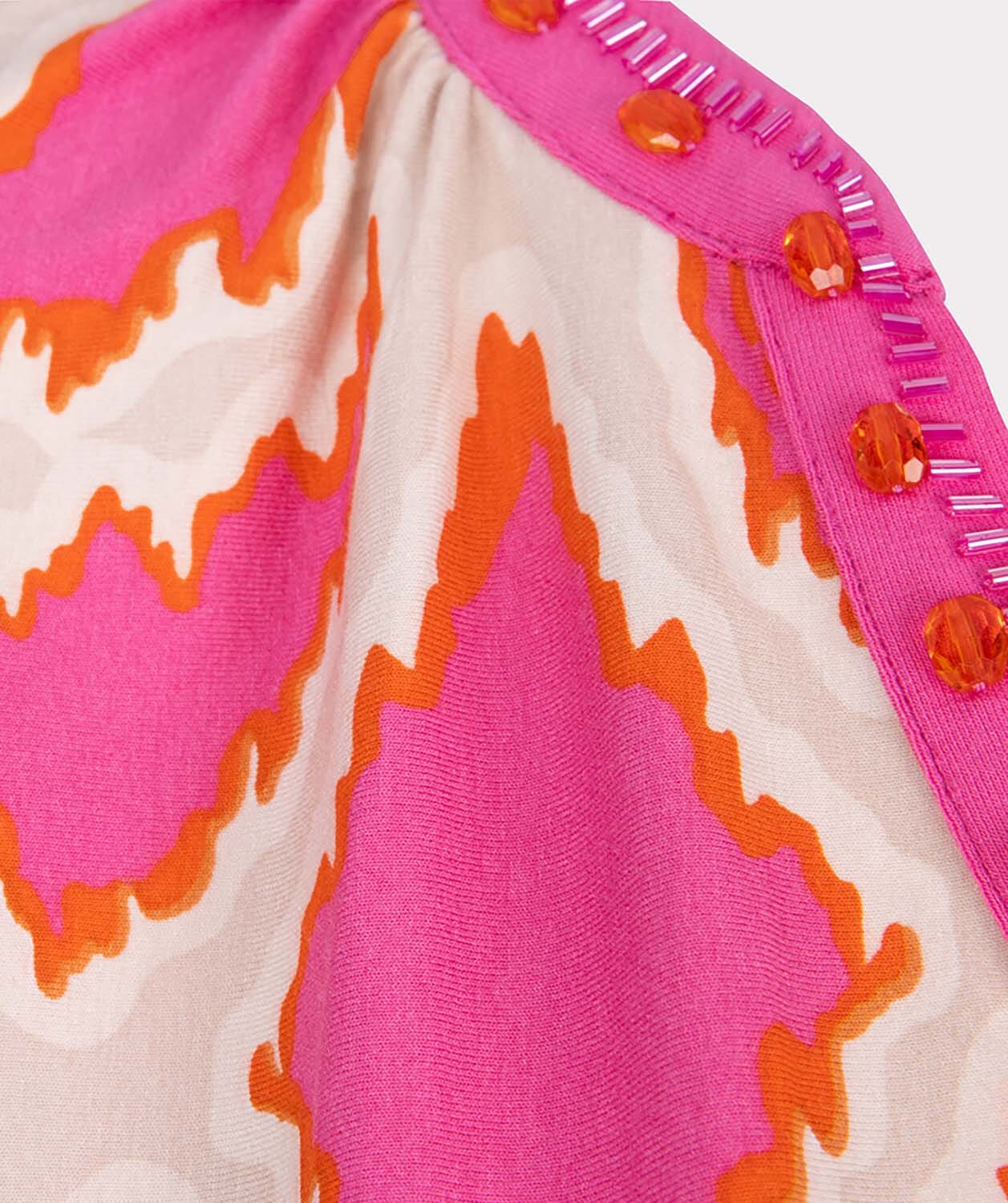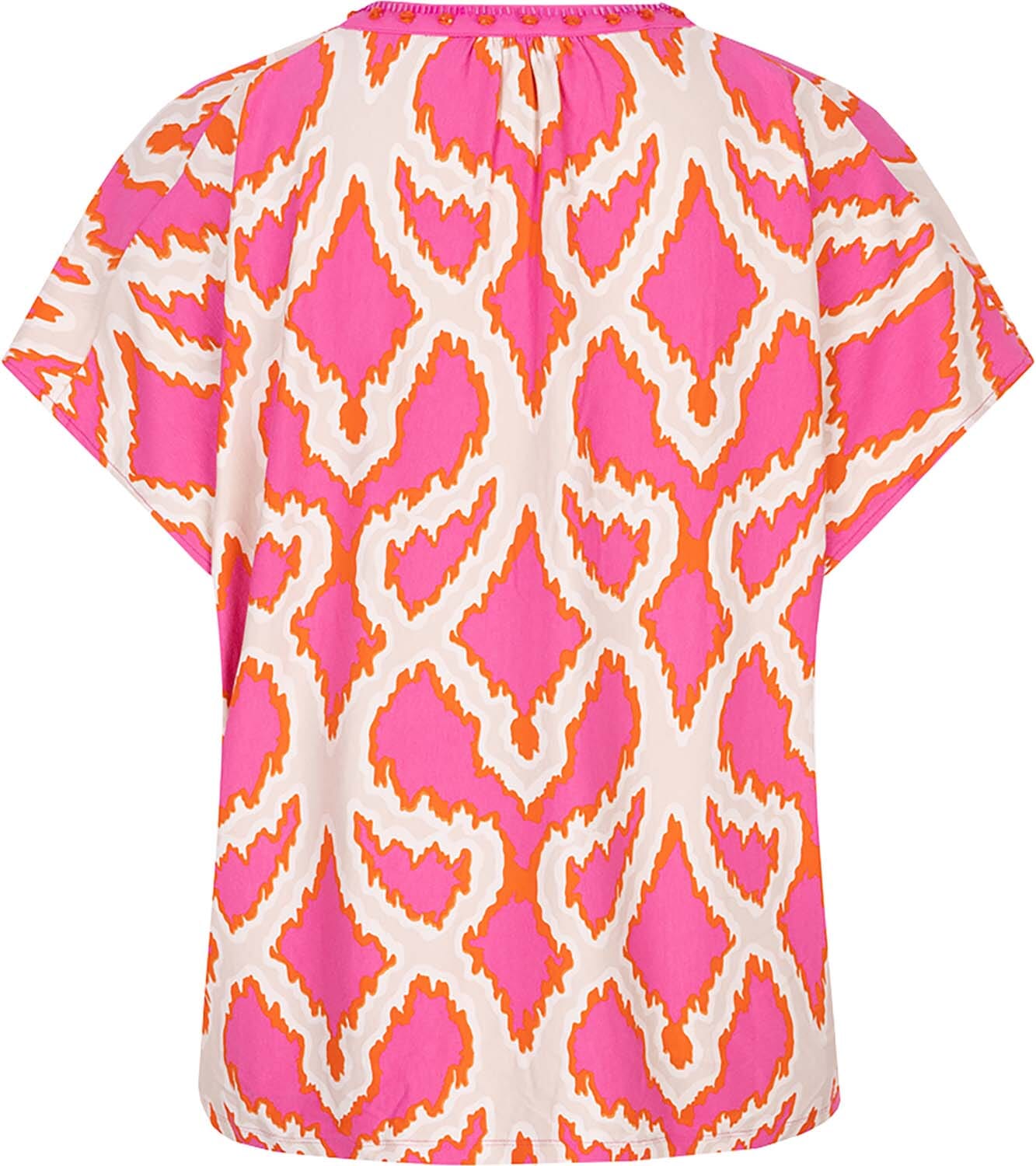 De Top beads Disco Spark van Esqualo is een korte mouw top met een levendig patroon in roze en oranje tinten. De halslijn is versierd met glinsterende kralen, wat een speels en modieus accent toevoegt. Ideaal voor een vrolijke en stijlvolle look.