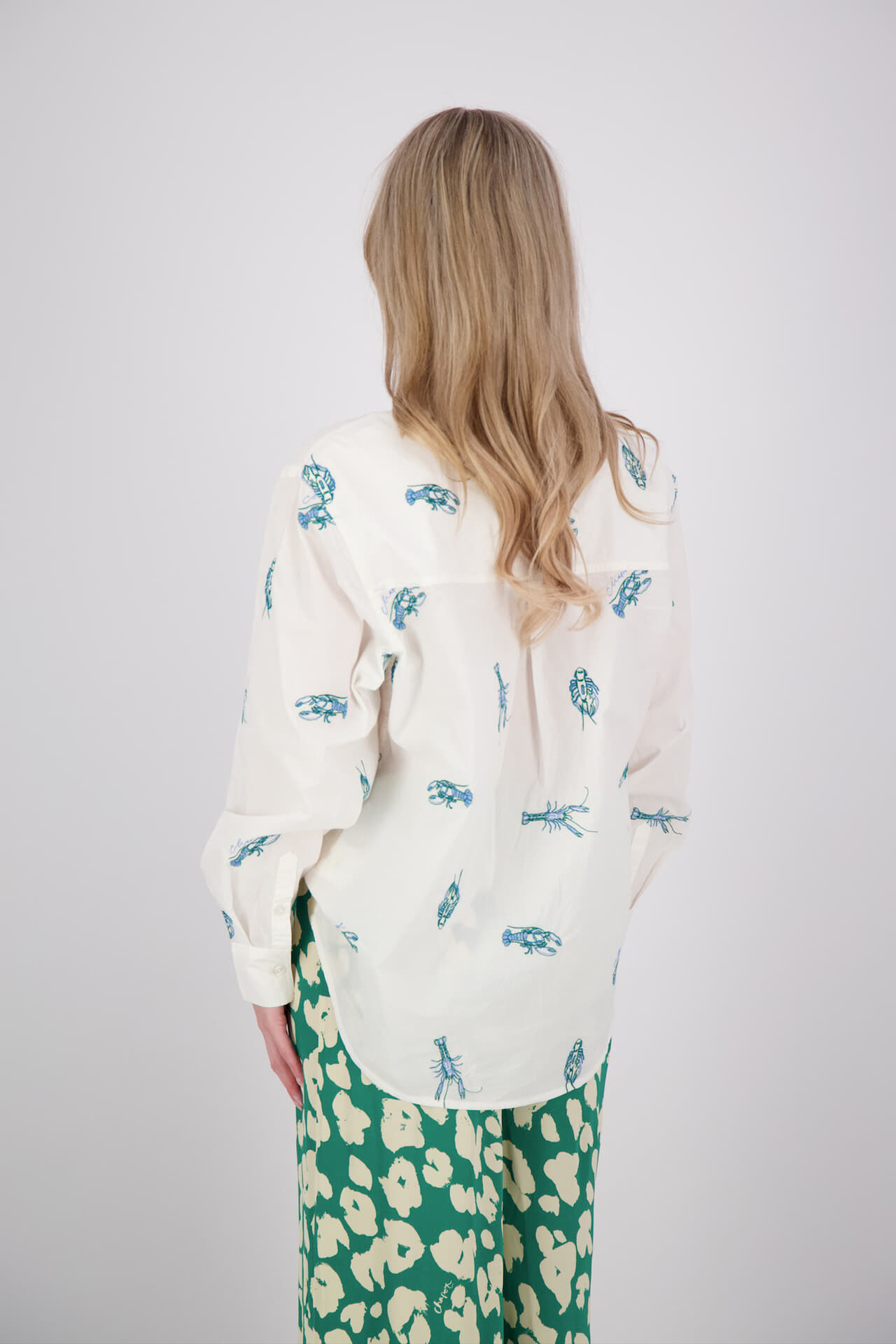 De Blouse Alex Langoustine van Fabienne Chapot is een trendy dames blouse met een unieke dierenprint. Deze casual blouse heeft een button down kraag, zakken op de voorzijde, lange mouwen met manchetten en knopen als sluiting. Perfect voor een stijlvolle en modieuze uitstraling.