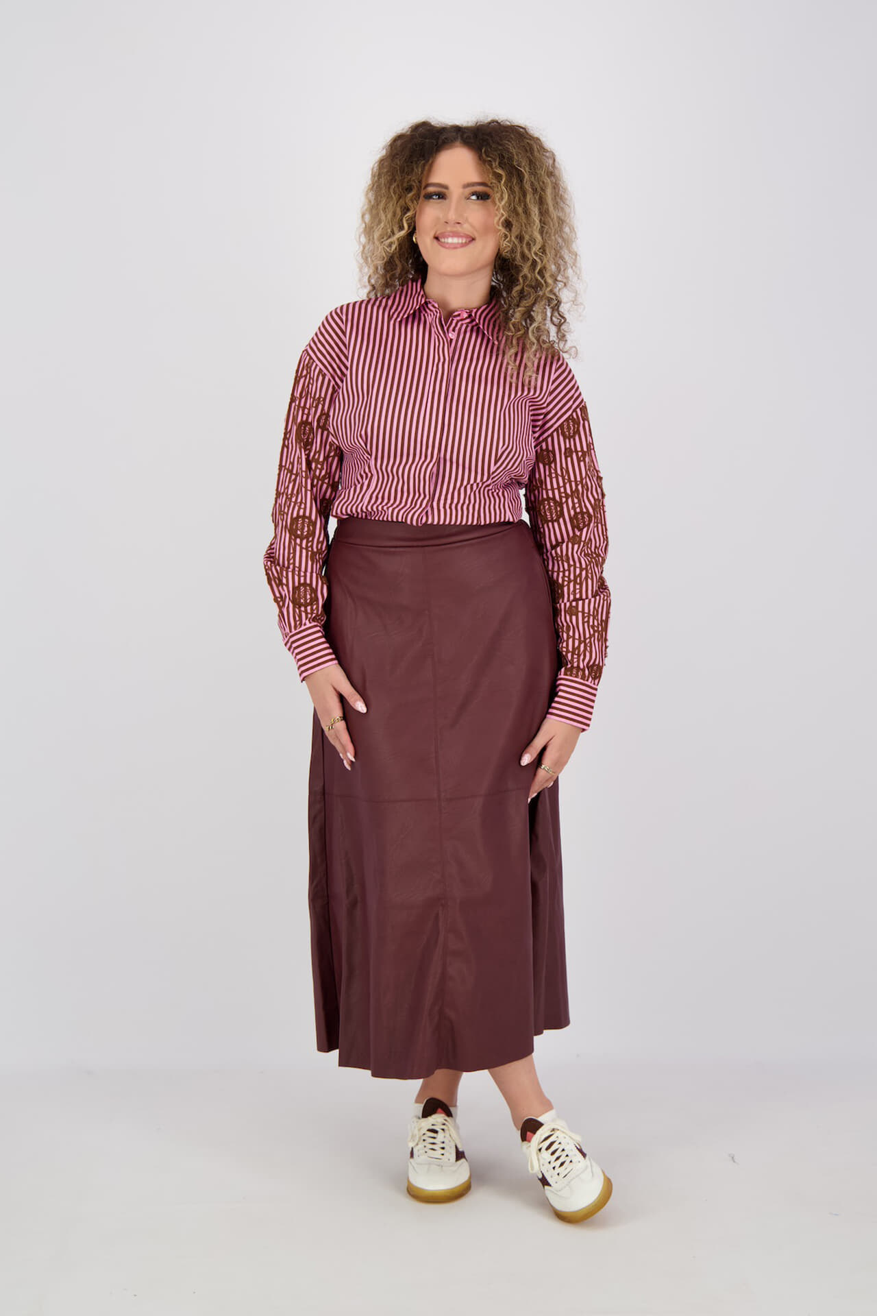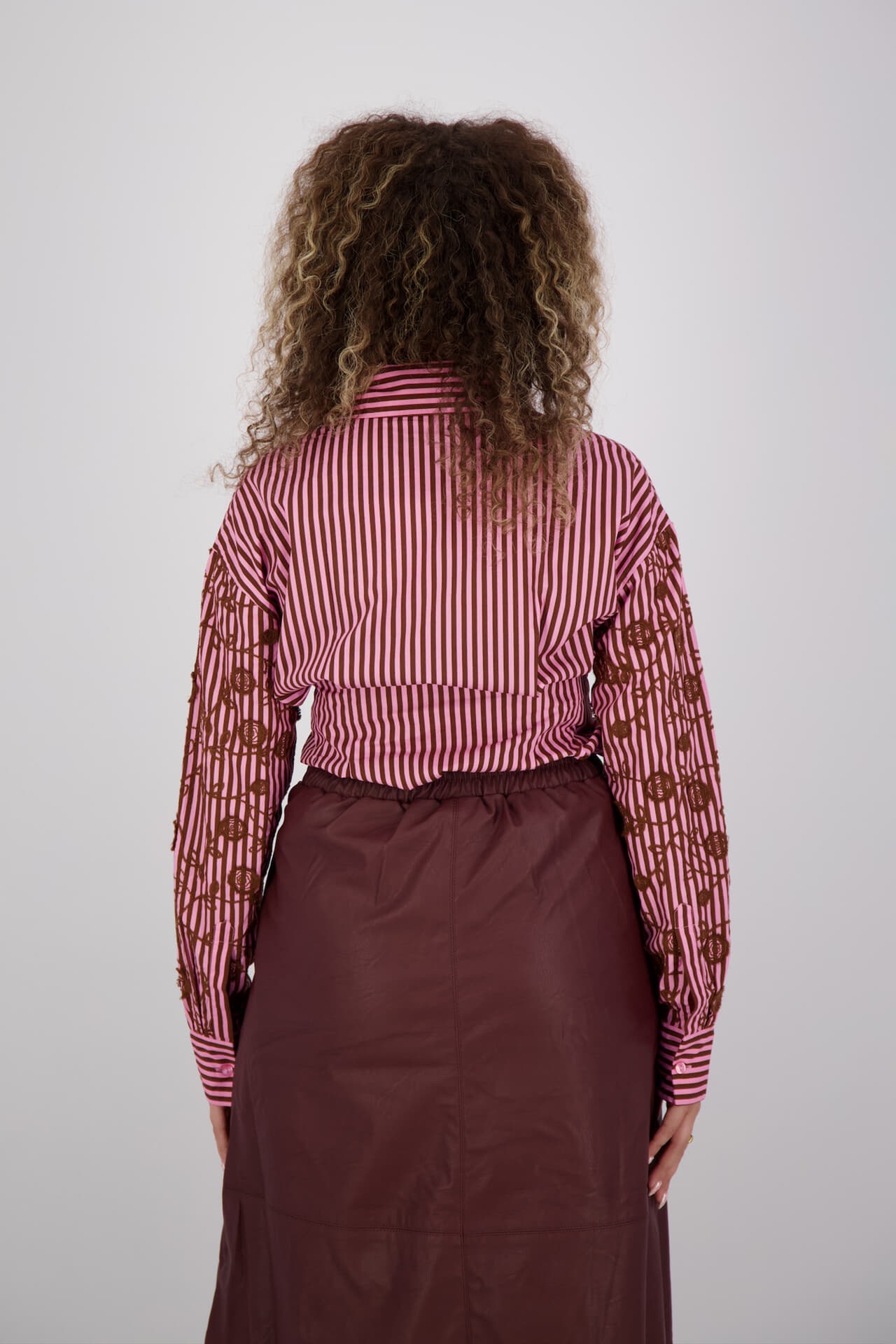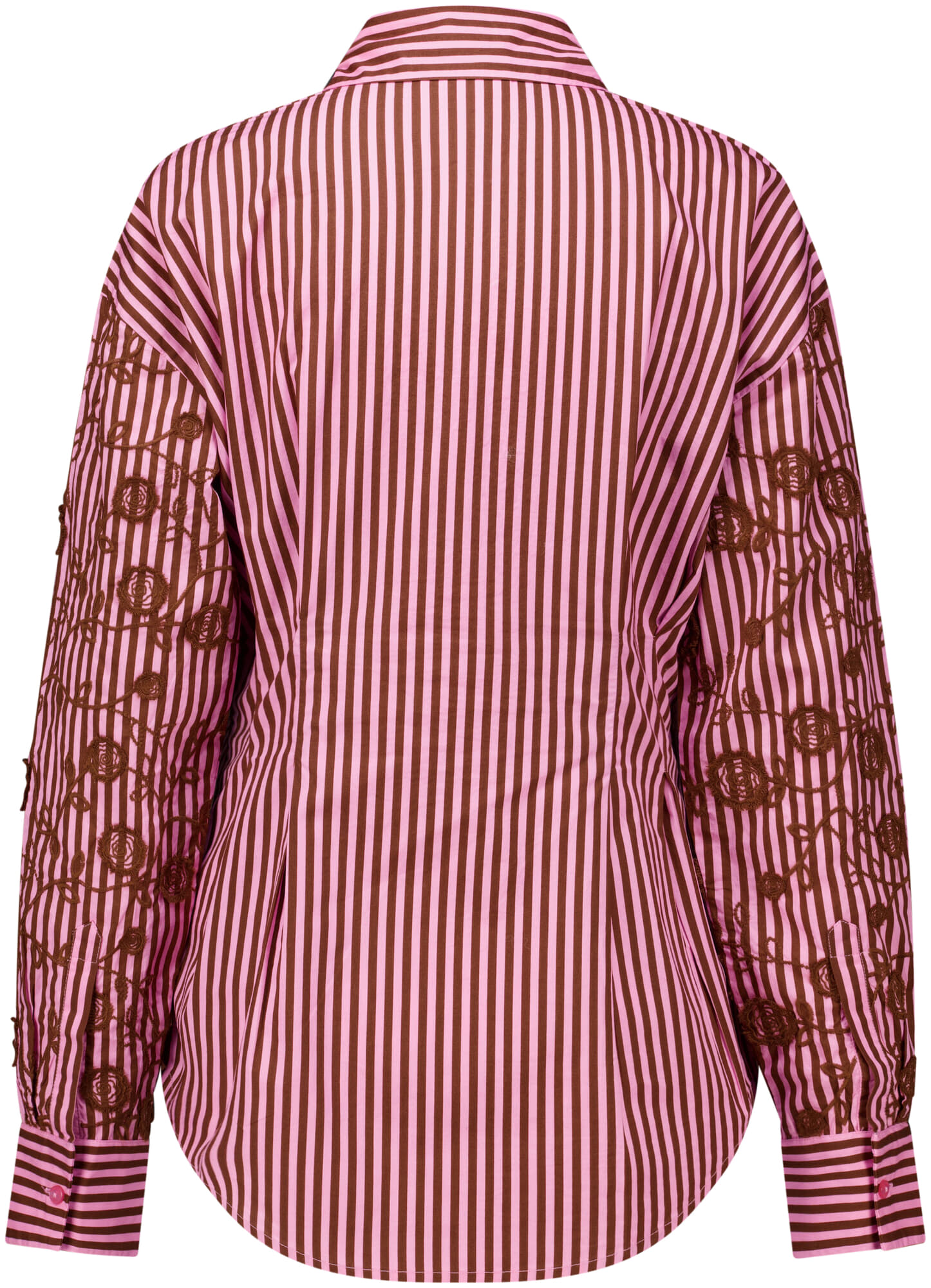 De Blouse Rosey van Fabienne Chapot is een stijlvolle blouse met een getailleerde pasvorm en opvallende strepen. De lange mouwen met knoopmanchetten en het borduurwerk maken deze blouse uniek. De overhemdkraag en knoopsluiting geven een klassieke uitstraling aan deze elegante creatie.
