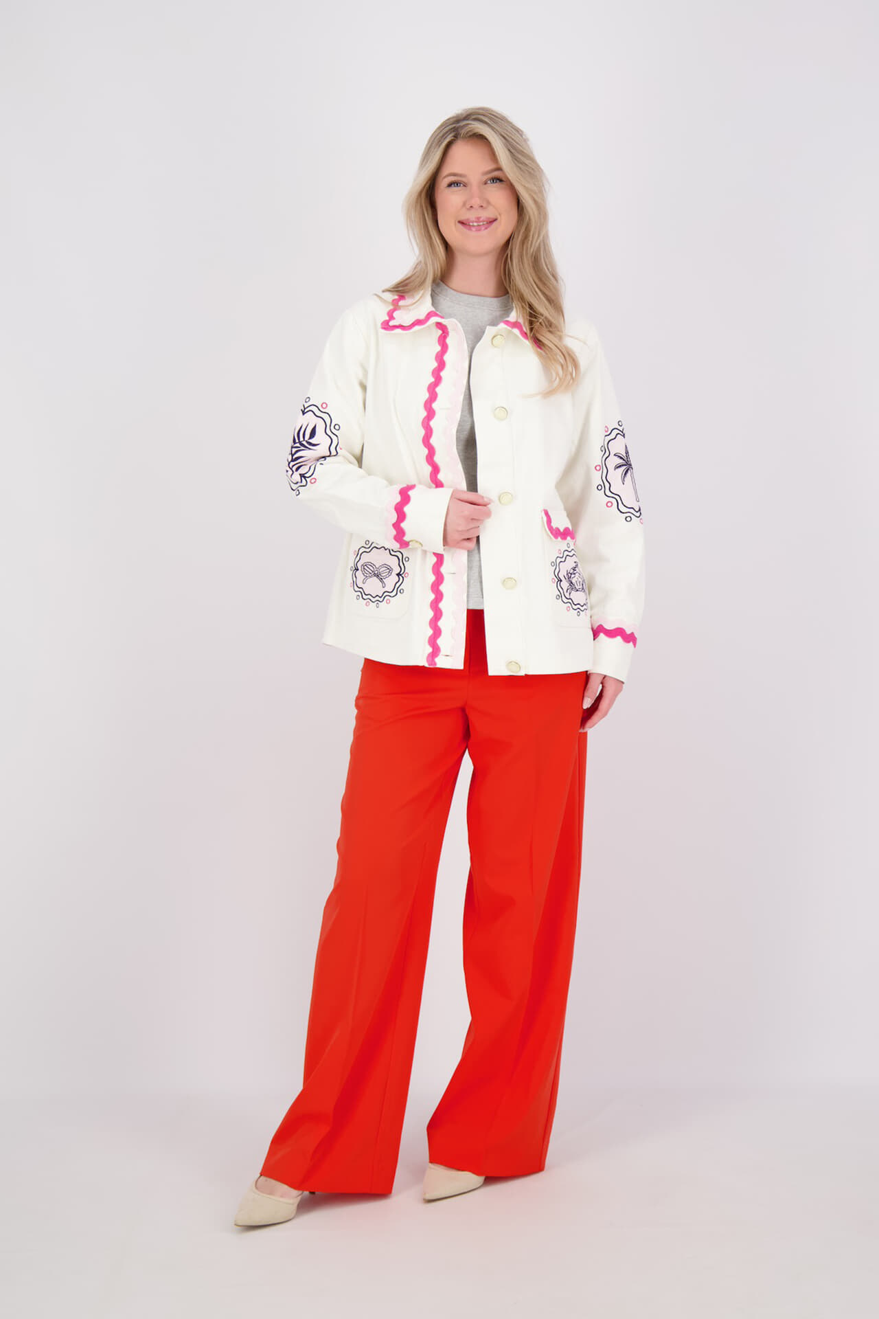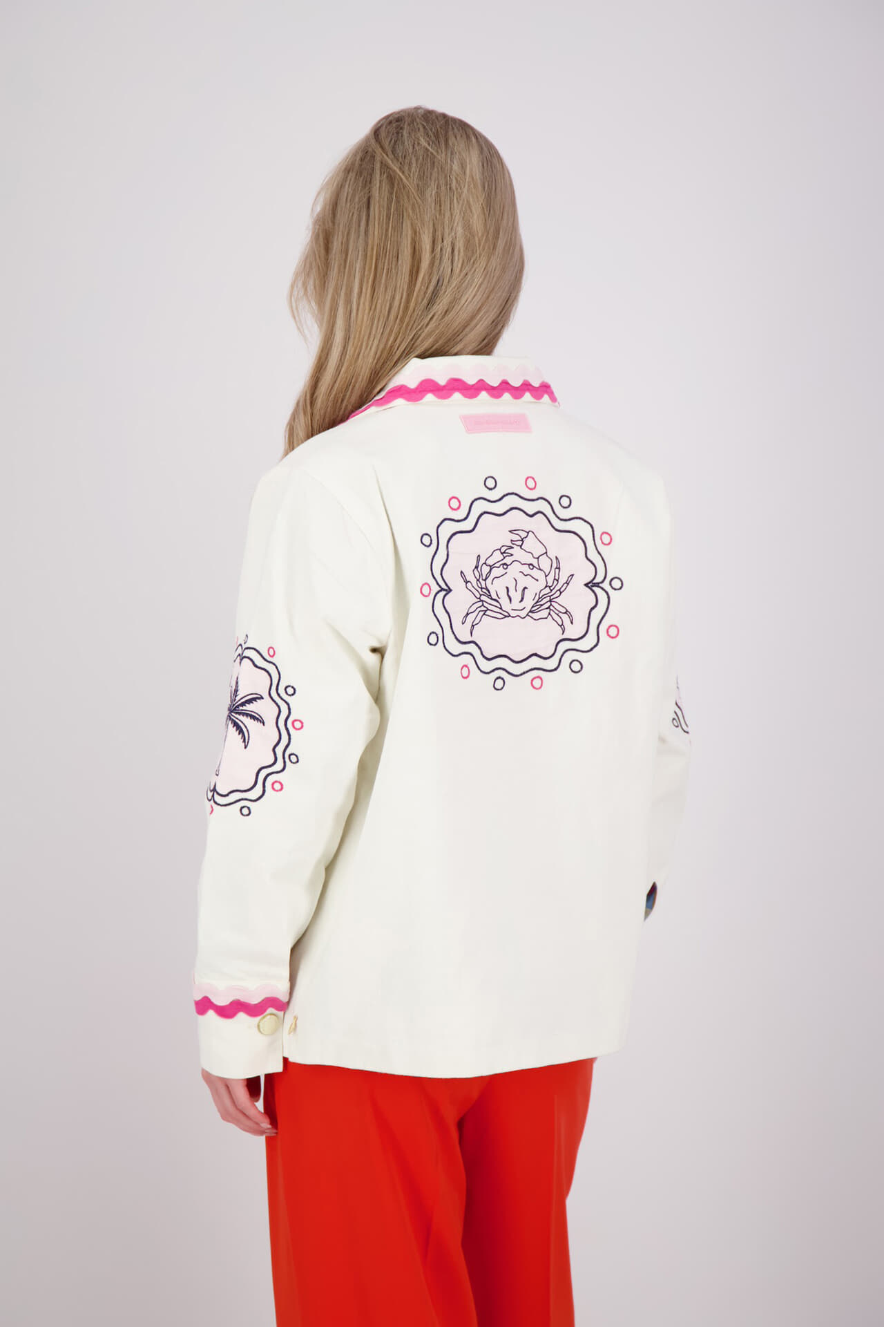 De Jas Melodie Embro van Fabienne Chapot is een stijlvolle jas. Met een opstaande kraag en zakken op de voorzijde biedt deze damesjas praktische elegantie. Het grafische patroon en de lange mouwen geven het een modieuze touch. Ideaal voor een modieuze en comfortabele look.