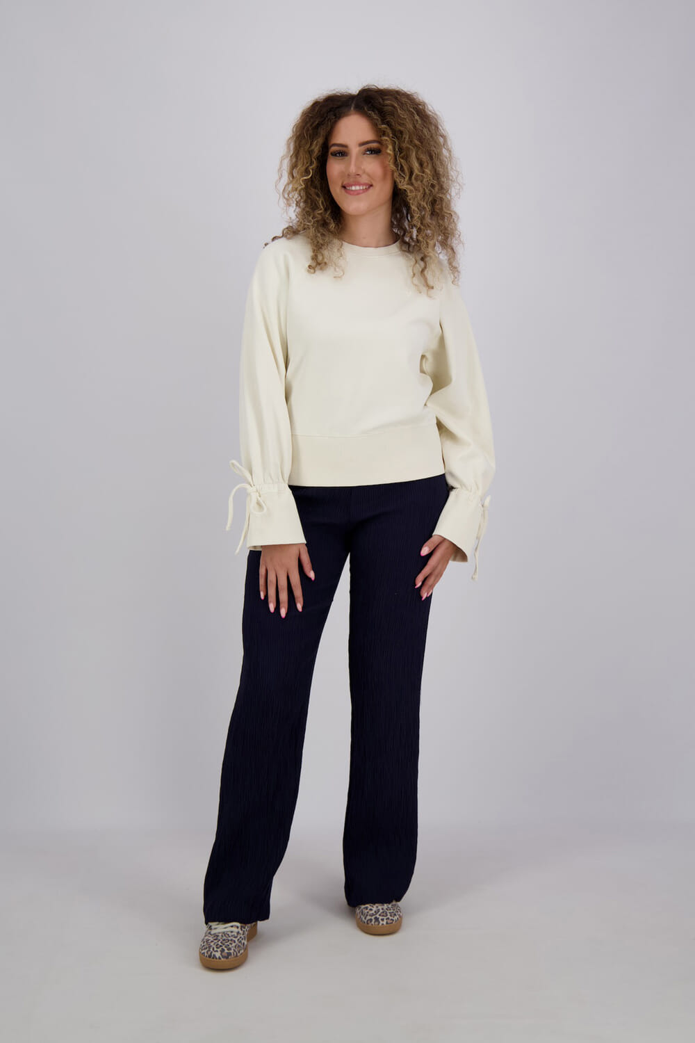 De Sweater Janet van Fabienne Chapot is een stijlvolle damestrui met een ronde halslijn en lange mouwen. Deze effen trui heeft elastische manchetten met speelse strikdetails. Ideaal voor een casual look en biedt een comfortabele, regular fit voor dagelijks gebruik.