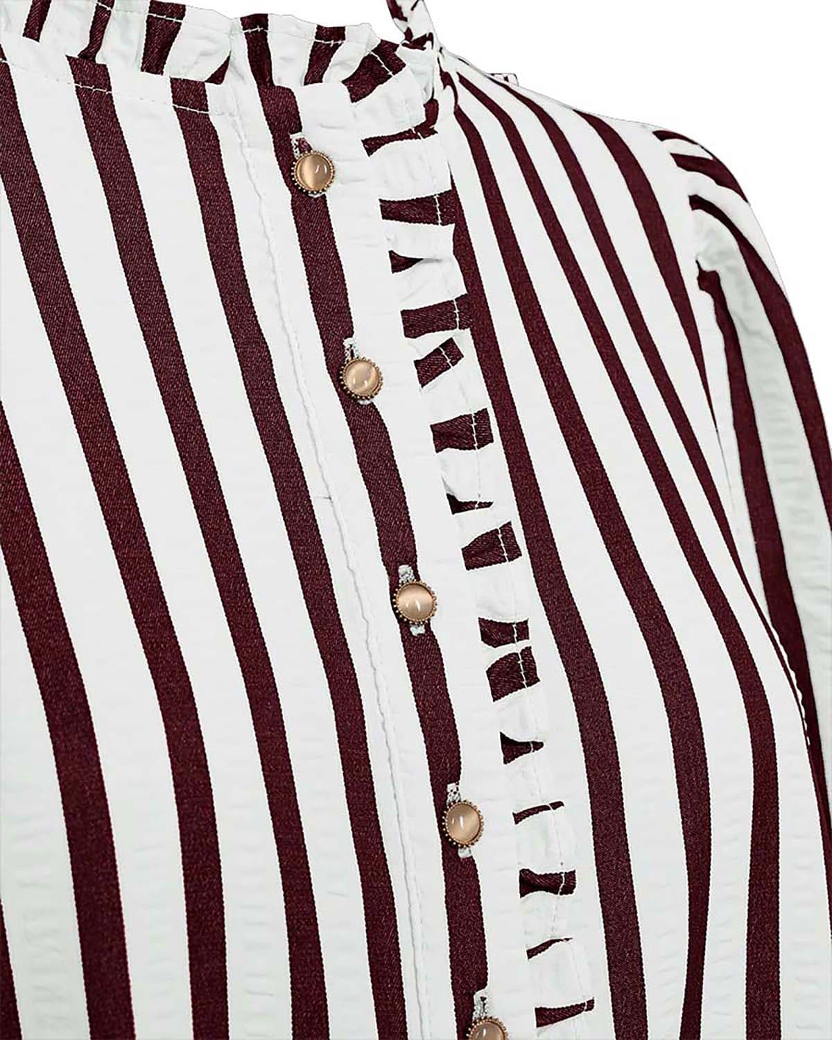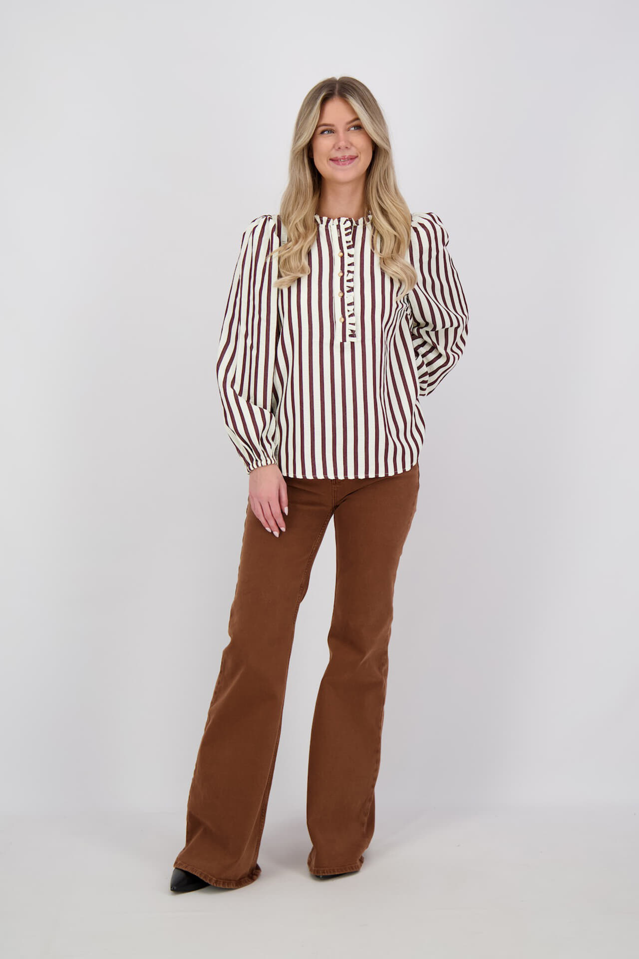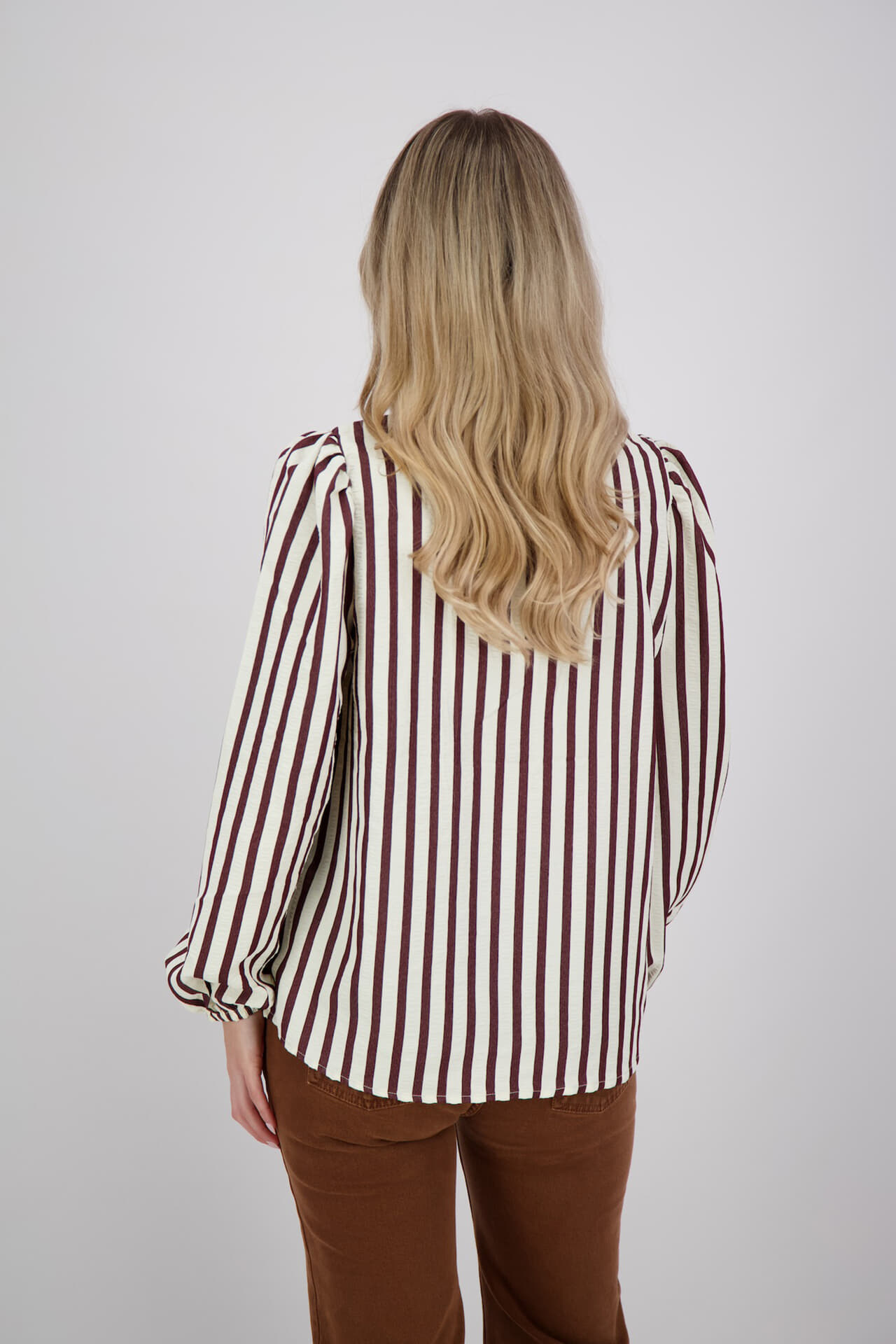 Blouse Noto van Freequent is een stijlvolle dames blouse met een opstaande kraag en lange mouwen met knopen. De casual losse pasvorm en het streepjespatroon maken deze blouse geschikt voor nette gelegenheden. Ontdek de veelzijdigheid en het comfort van dit kledingstuk.
