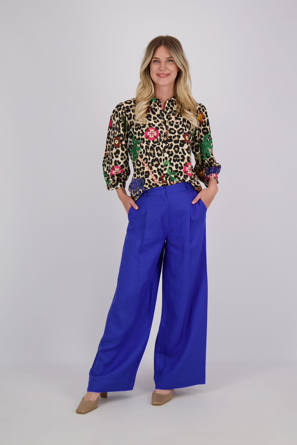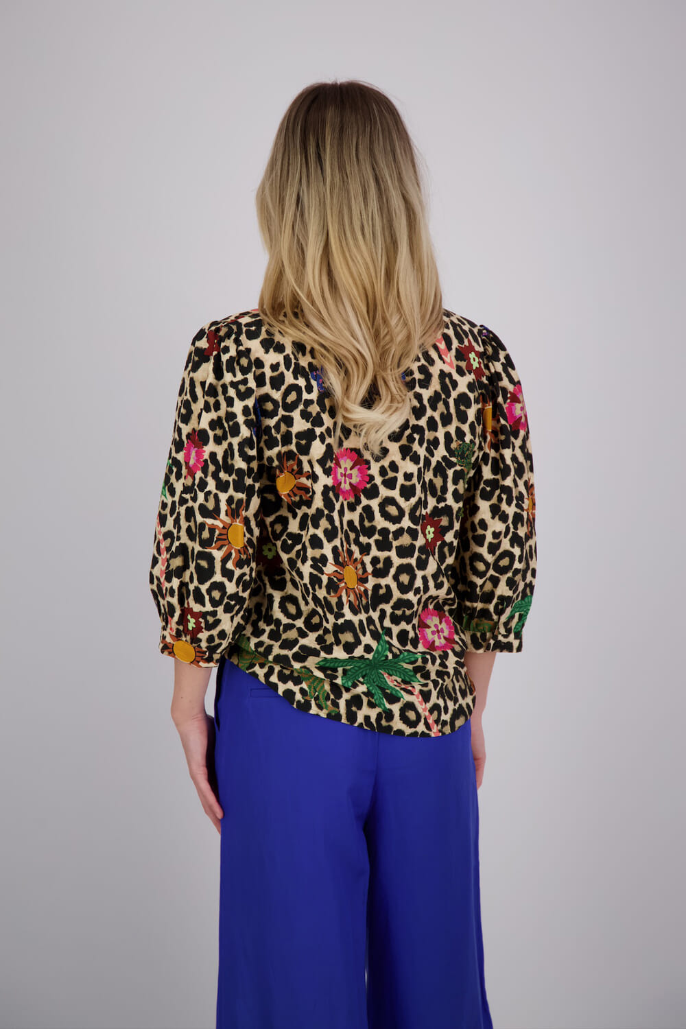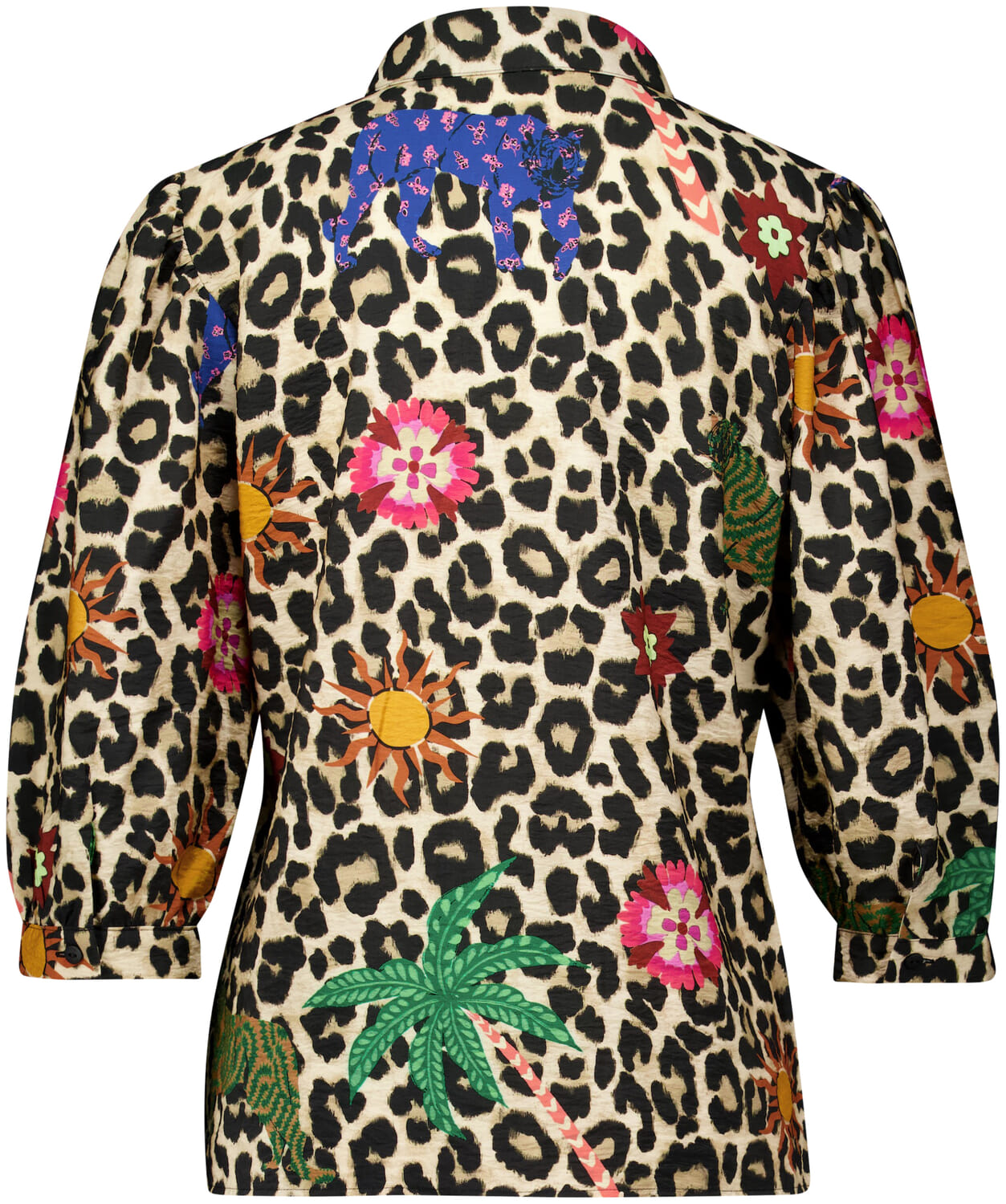 De blouse van Geisha is een dames top korte mouw met een opvallende bohemian stijl. De opstaande kraag en driekwart mouwen geven het een unieke uitstraling, terwijl het panterprint patroon zorgt voor een speelse touch. Perfect voor een modieuze en comfortabele outfit.