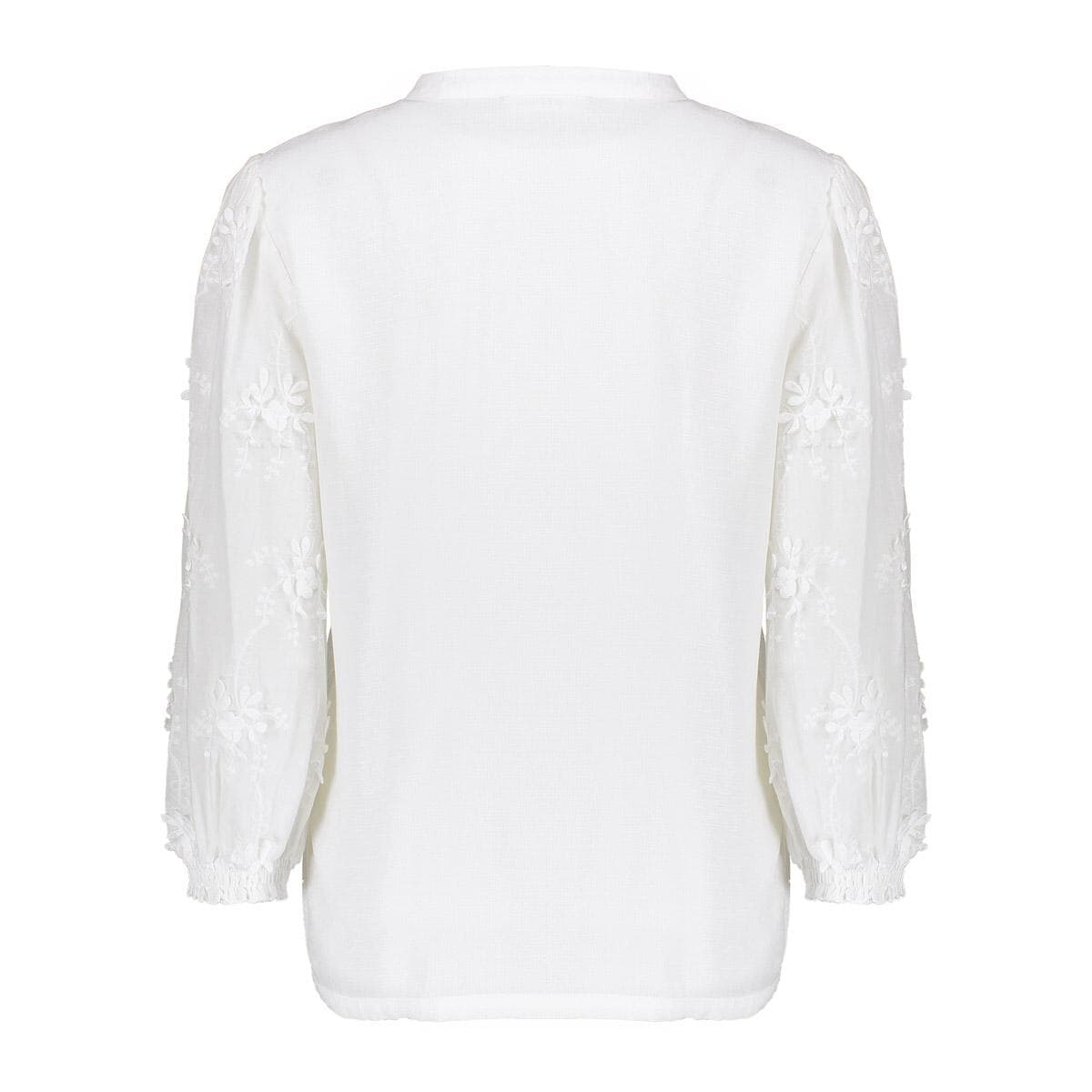 De blouse van Geisha is een vrouwelijke casual blouse met een opstaande kraag, V-hals en knoopsluiting. De 7/8 mouwen zijn voorzien van elastische manchetten en een all-over patroon, perfect voor elke gelegenheid.