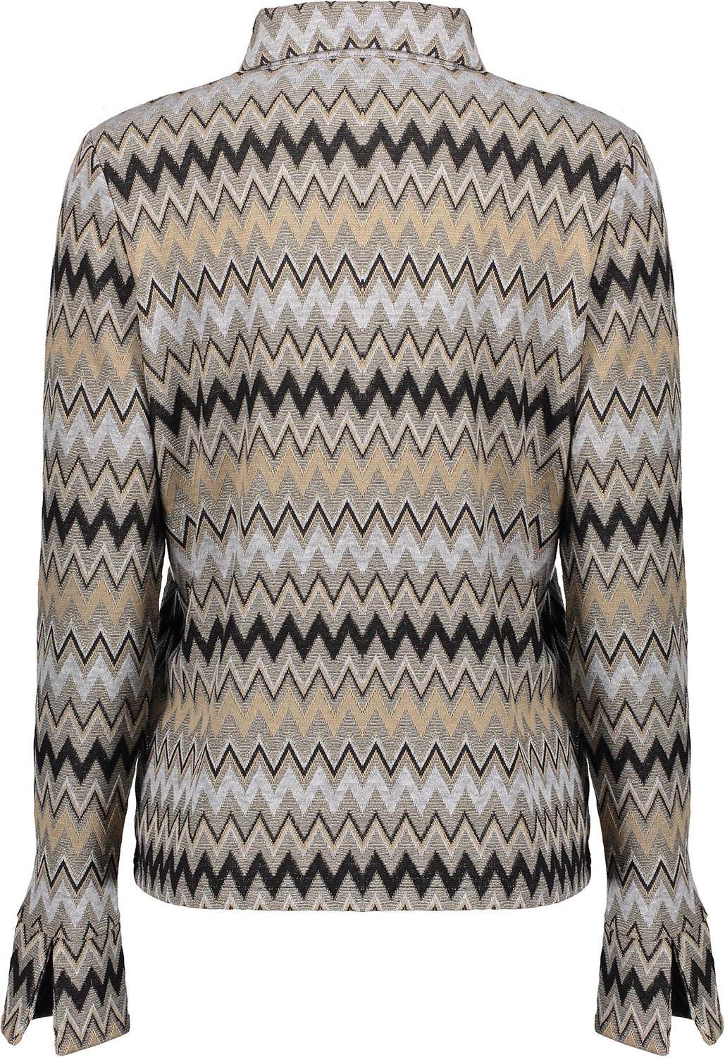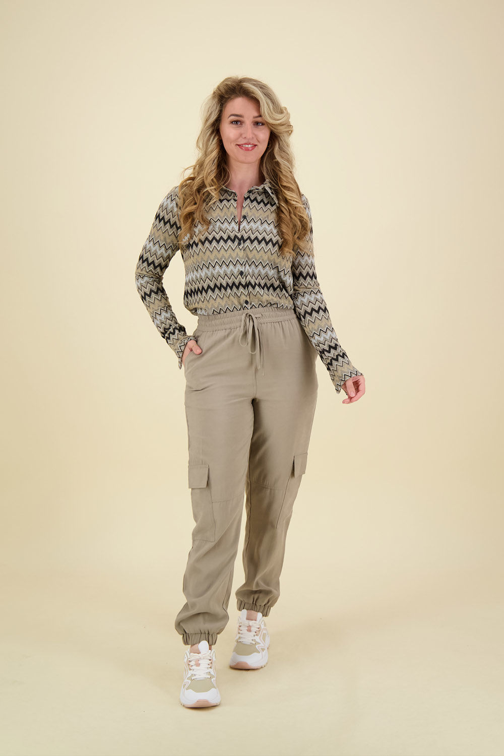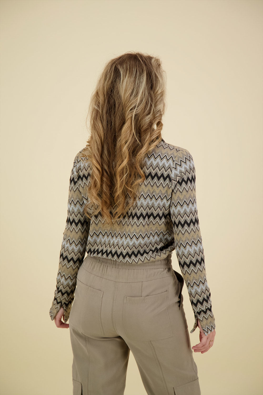 Deze Geisha blouse biedt een chique en moderne uitstraling. De blouse heeft een rechte valling en een klassieke kraag, wat zorgt voor een tijdloze look. De lange mouwen lopen licht uit, wat een elegant effect geeft. Met een volledige doorknoopsluiting is de blouse gemakkelijk te dragen en veelzijdig te stylen. De allover zigzag print, gecombineerd met lurex/glitter details, zorgt voor een sprankelende en opvallende uitstraling. Een perfecte keuze voor zowel casual als feestelijke gelegenheden.