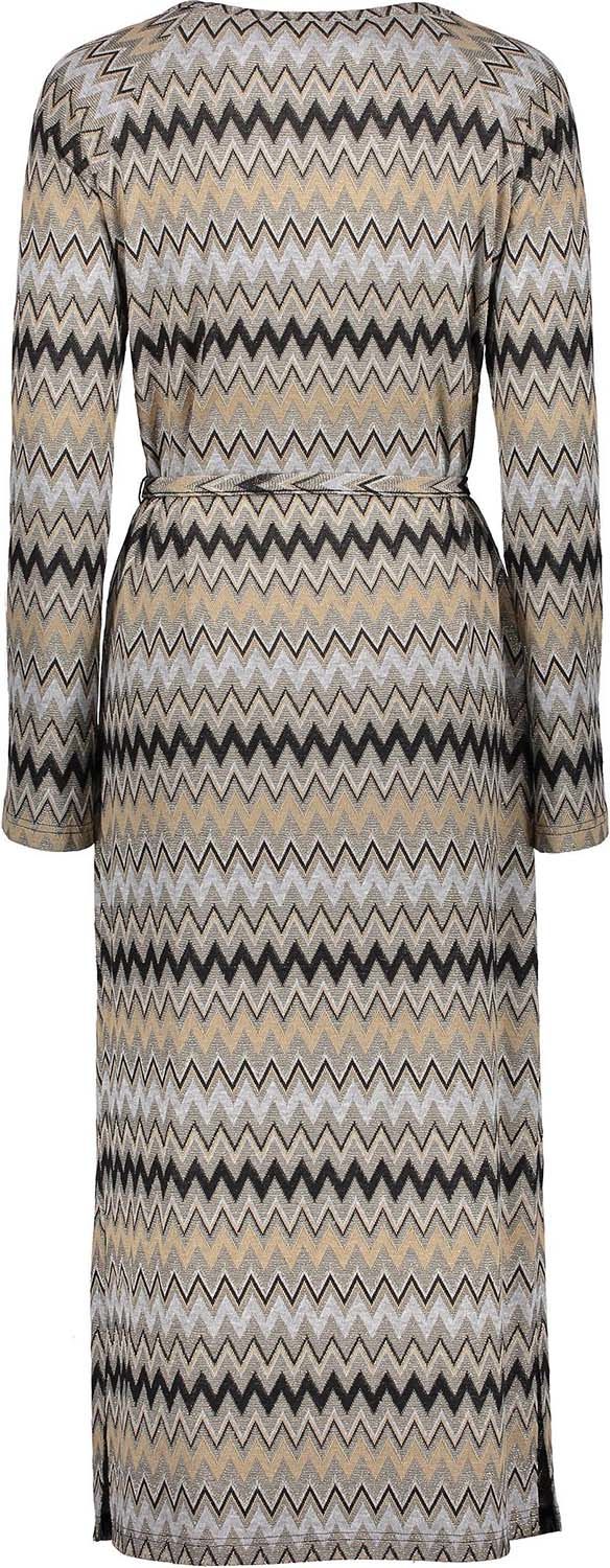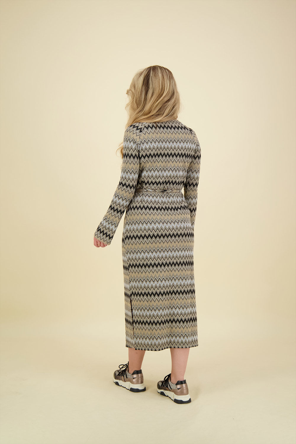 Deze Geisha jurk biedt een elegante en stijlvolle uitstraling. Het item heeft een midi-lengte met een rechte, aangesloten pasvorm en een ronde hals. De lange mouwen en de opvallende zigzag print geven de jurk een unieke look. De selffabric ceintuur accentueert de taille en de splits aan beide zijdes zorgen voor extra bewegingsvrijheid en een speelse touch. Een perfecte keuze voor zowel casual als formele gelegenheden.