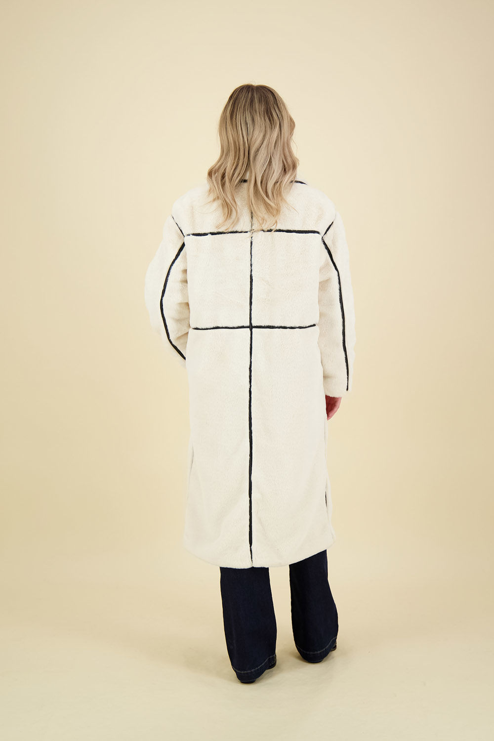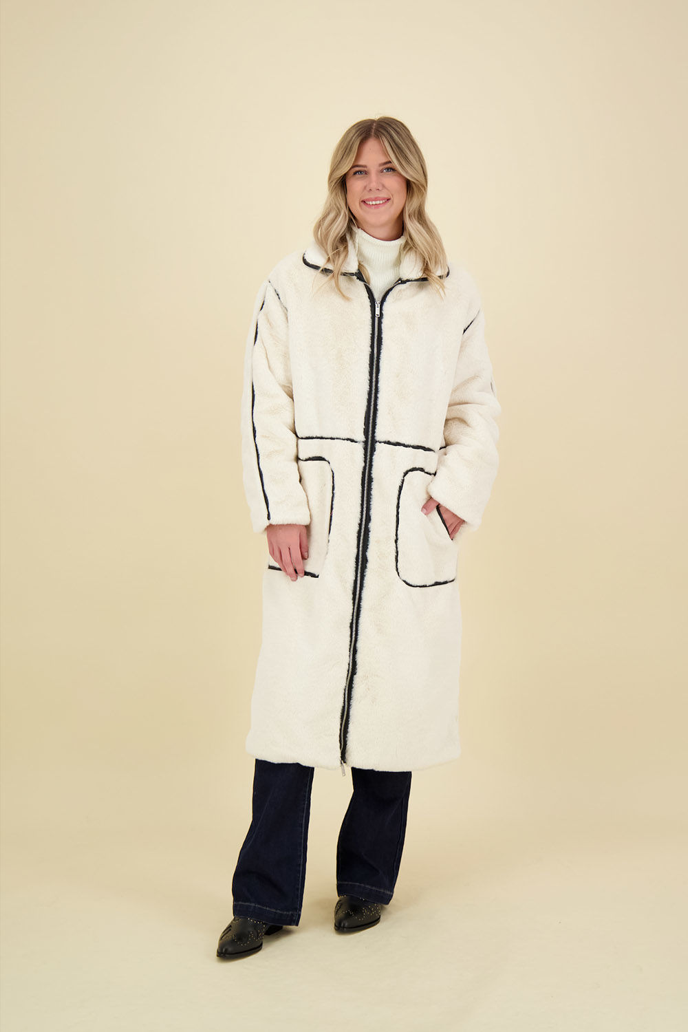Deze Geisha lange fur jas combineert stijl en comfort met een edgy twist. De jas heeft een oversized fit en een klassieke kraag voor een tijdloze uitstraling. Met lange mouwen en een ritssluiting biedt de jas zowel warmte als gemak. De steekzakken zijn praktisch en handig, terwijl de PU-belijning over de gehele jas een stoere touch toevoegt. Gemaakt van zachte fake fur van hoge kwaliteit met een leerlook, is deze jas niet alleen luxueus maar ook diervriendelijk. De jas is volledig gevoerd voor extra comfort, perfect voor de koudere maanden.