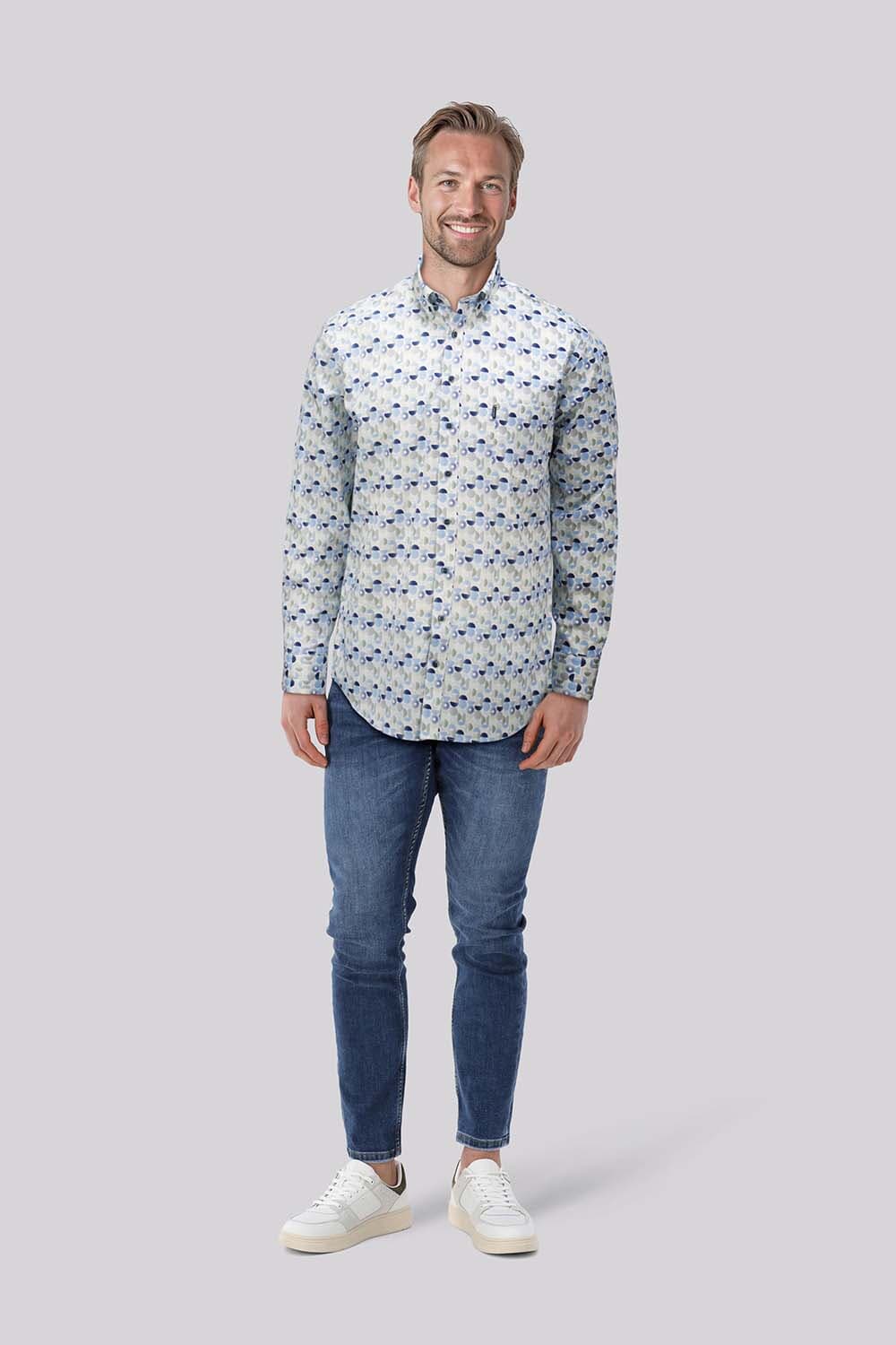 Overhemd Ivy van Giordano is een casual overhemd met grafisch dessin, button-down kraag en lange mouwen. De knoopsluiting, manchetten met knopen en borstzak geven een verzorgde, praktische afwerking. Draag het open over een T-shirt of netjes in een jeans.