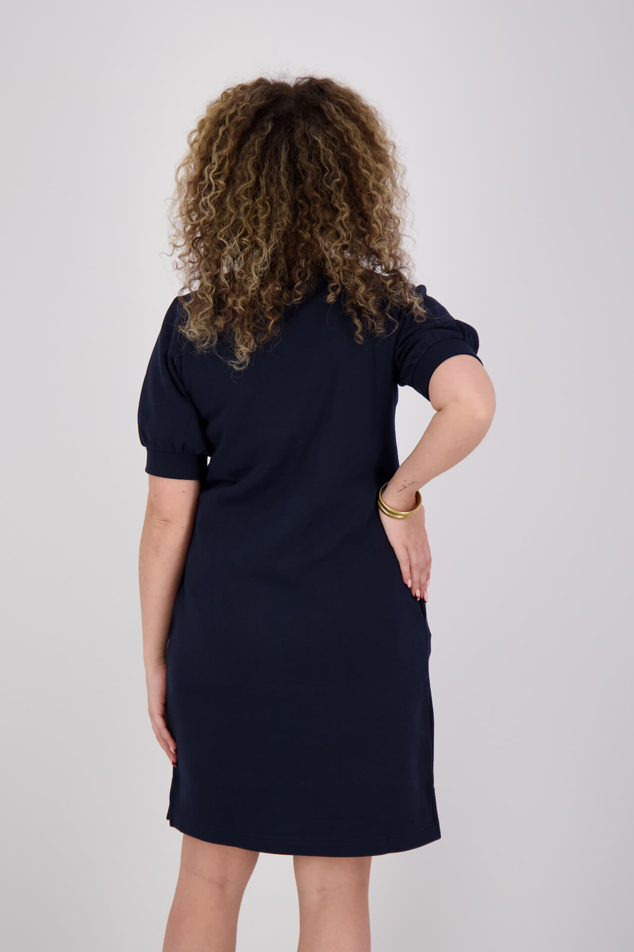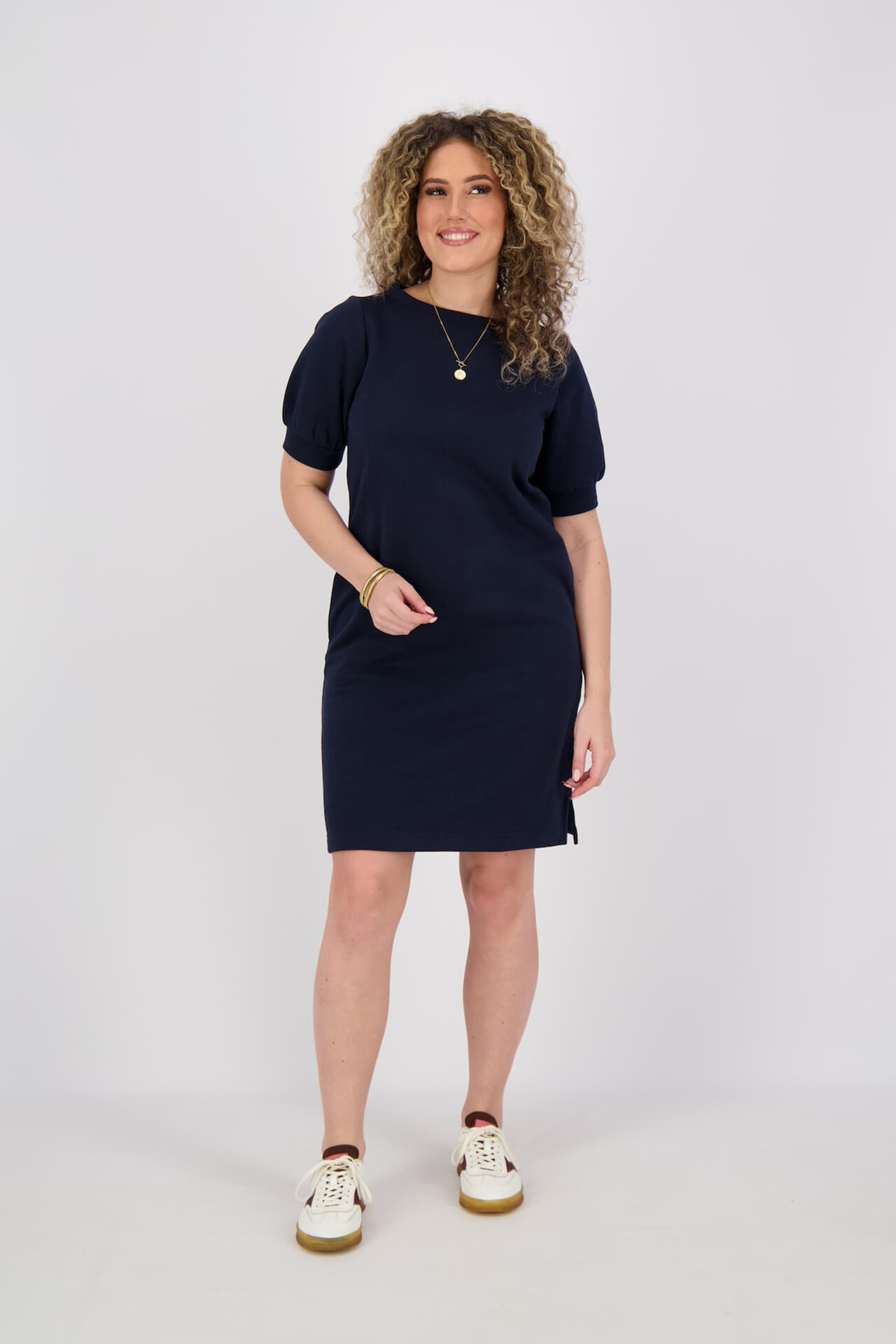 De Leah-jurk van Hv Society is een jurk met korte mouwen die comfortabel en casual te dragen is. De effen, donkerblauwe stof valt soepel en recht, met een ronde hals, korte pofmouwen en een aanschuifsluiting. Een fijne keuze voor een relaxte dag, op het werk of tijdens een etentje.