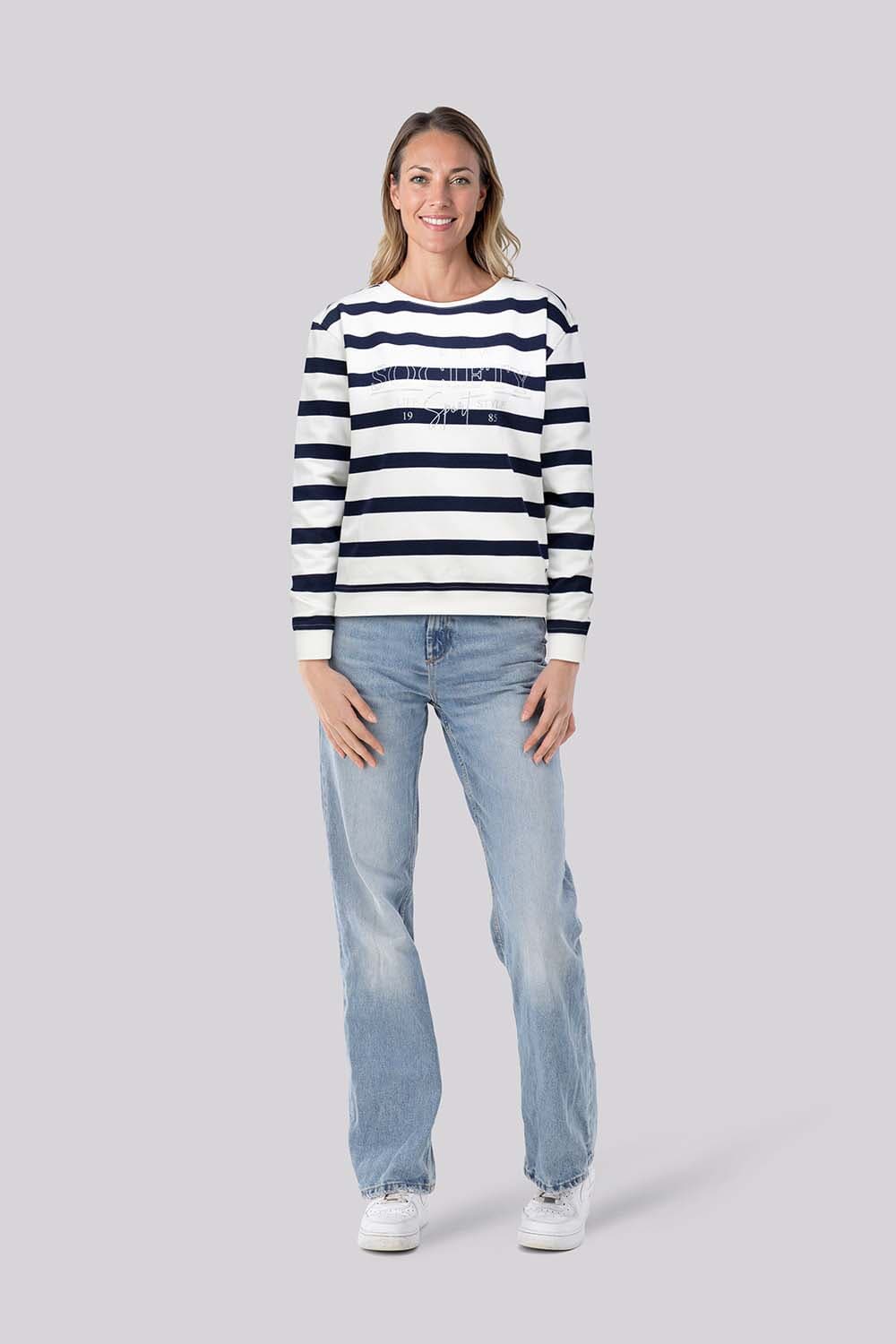 Sweater Katherine van HV Society is een sweater met ronde hals, regular pasvorm en lange mouwen met ribgebreide boorden. Het gestreepte dessin krijgt extra detail door een subtiel logo op de borst. Draagt prettig en combineert makkelijk met een jeans of nette broek.