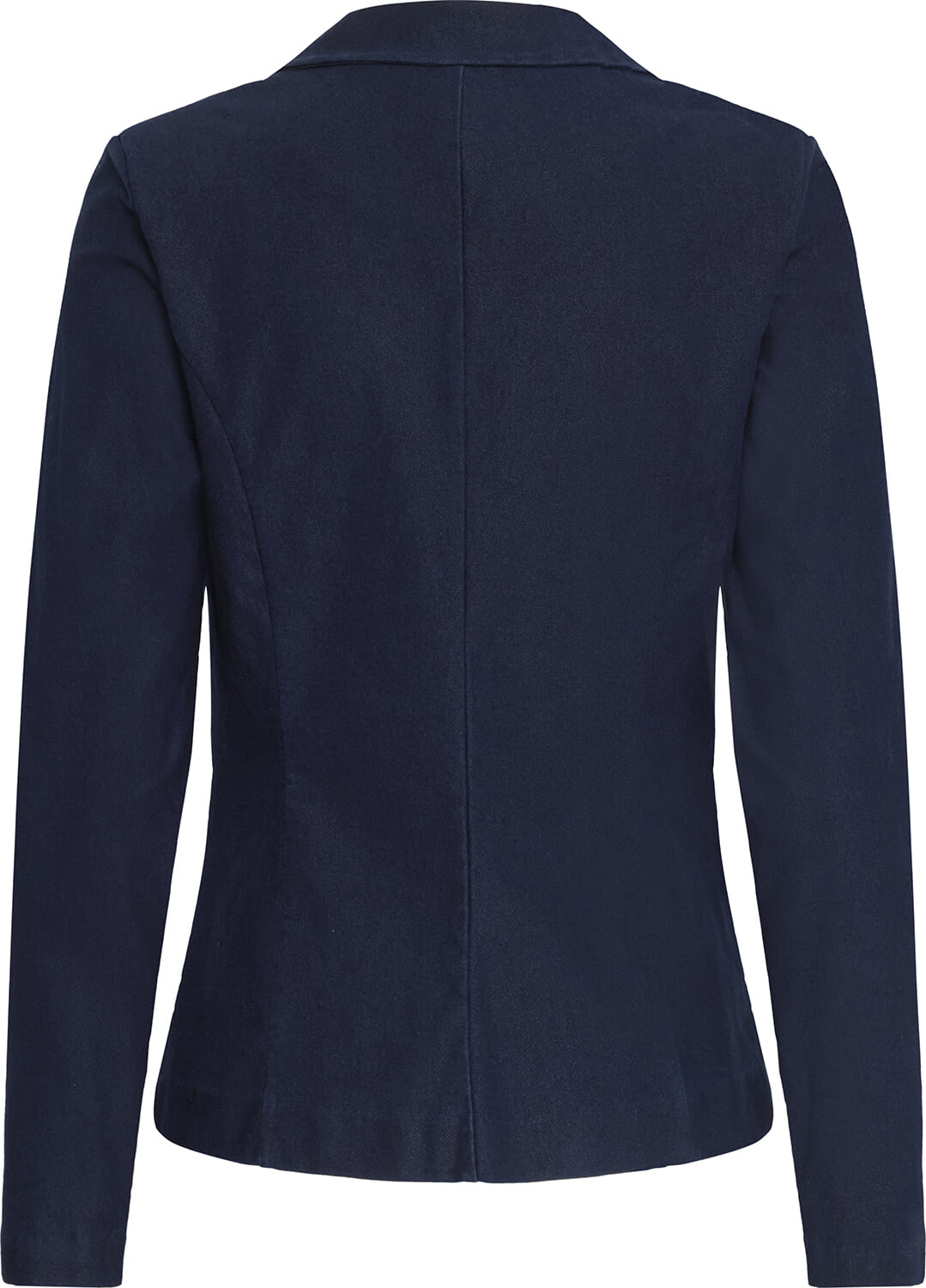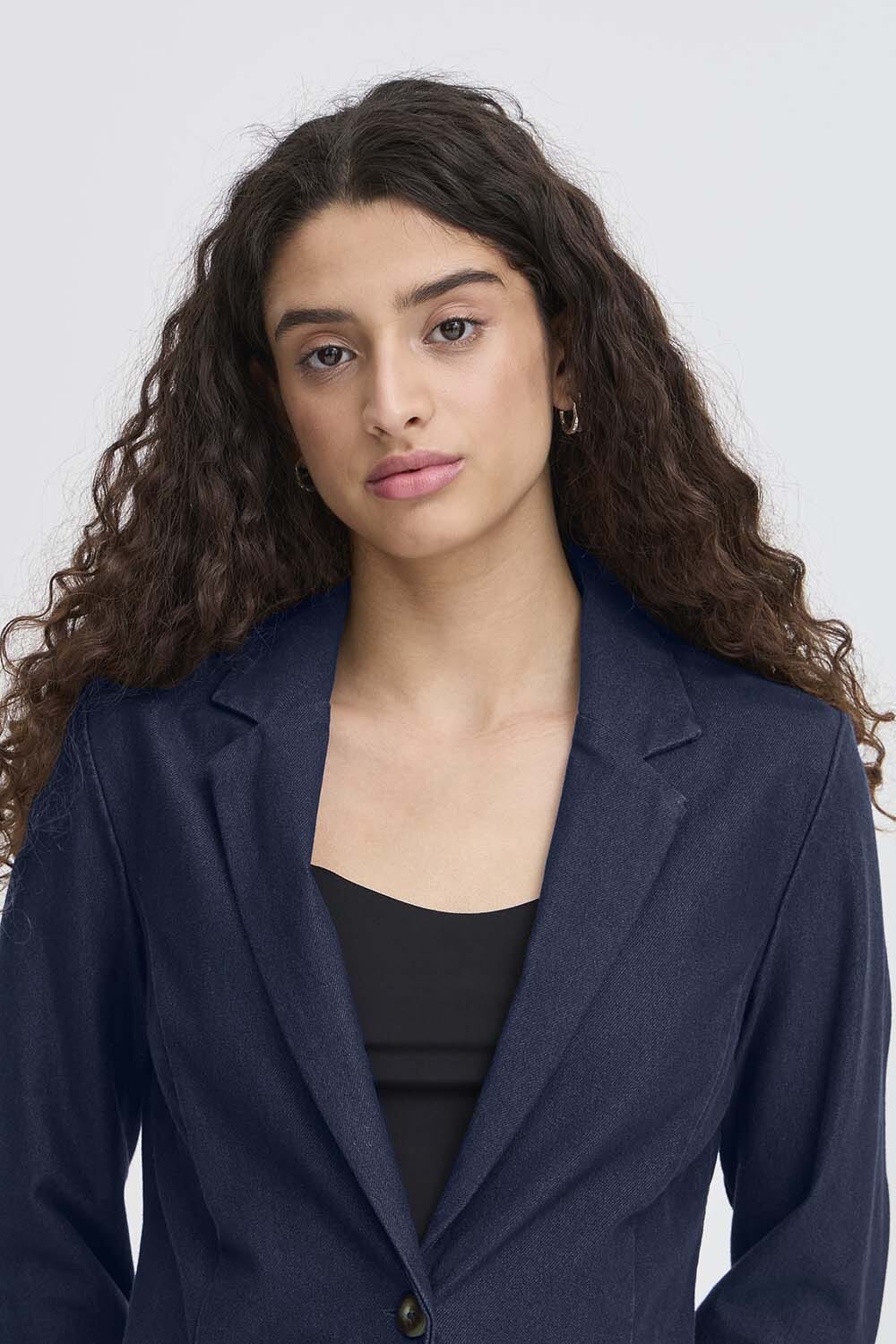 Blazer Kate Denim van Ichi is een elegante blazer met een getailleerde pasvorm en effen patroon. Voorzien van lange mouwen, knoopsluiting en zakken op de voorzijde, ideaal voor zakelijke gelegenheden. Deze tussenjas biedt comfort en stijl in één.