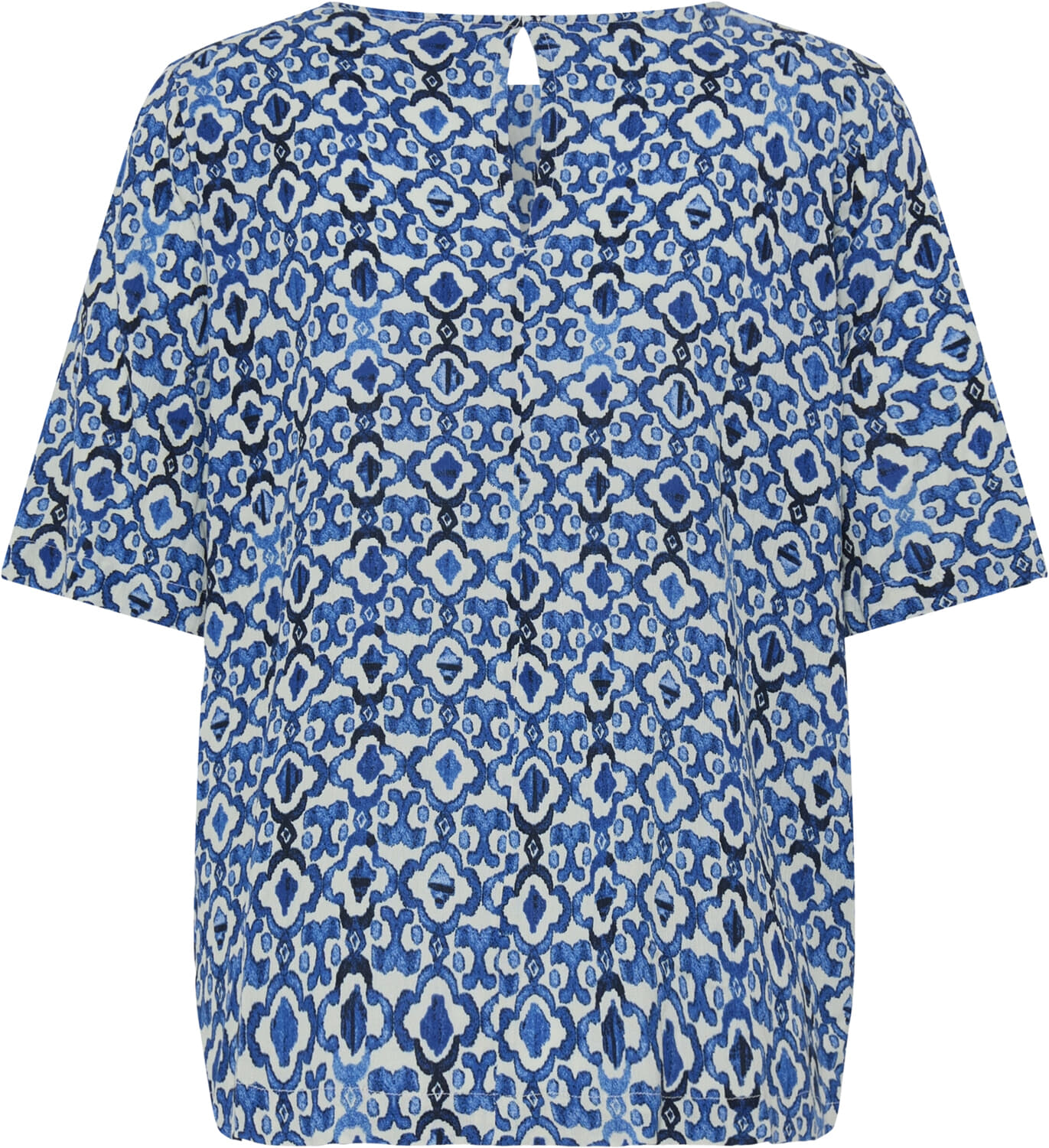 De Blouse Marrakech van Ichi is een stijlvolle dames blouse met een opvallend grafisch patroon. Het kledingstuk heeft een ronde halslijn en een losse, relaxte pasvorm, ideaal voor een casual look. De korte mouwen maken deze blouse perfect voor elke gelegenheid.