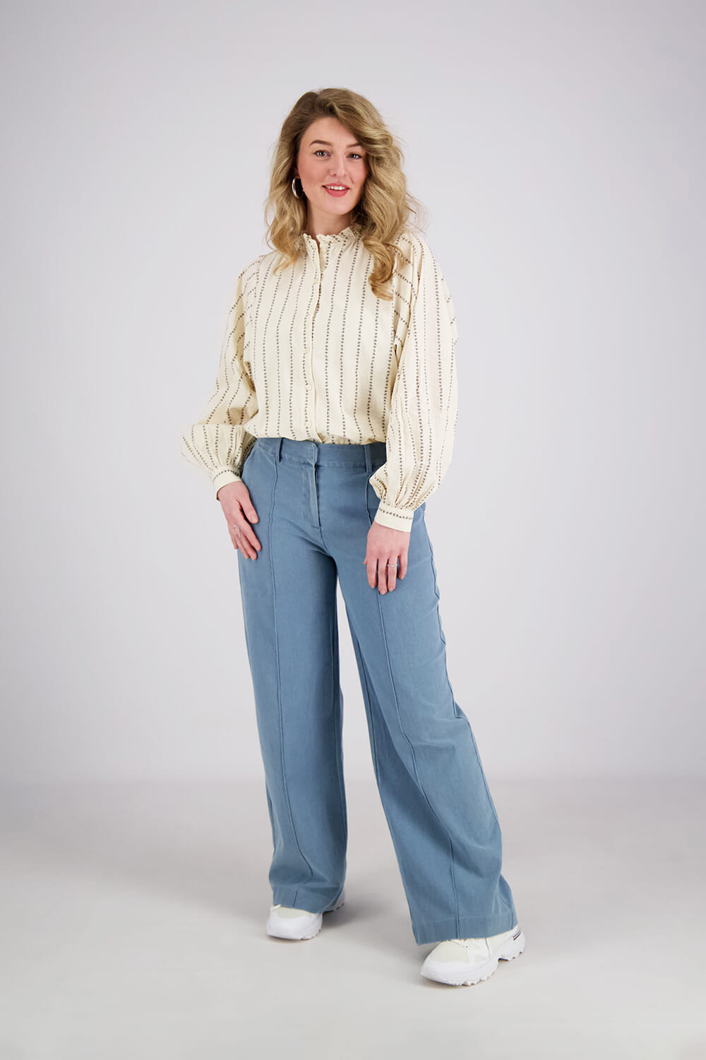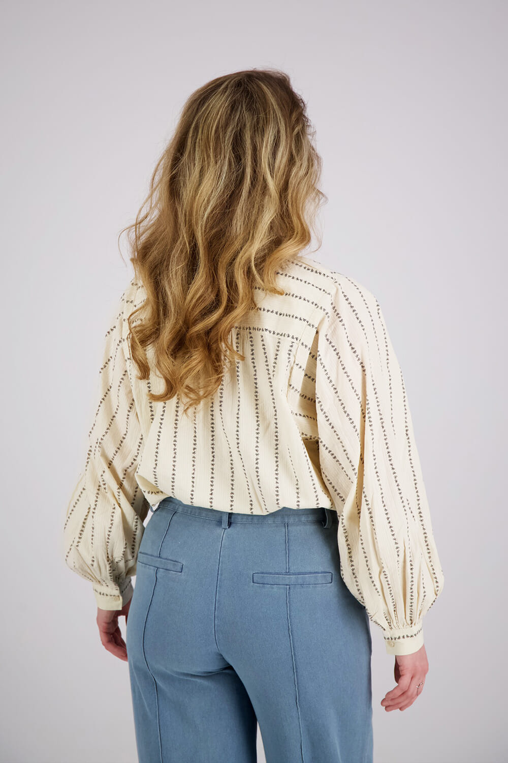 De Blouse Qsima van Ichi is een stijlvolle dames blouse lm met een opstaande kraag en lange mouwen. Deze blouse heeft een streep patroon en is voorzien van knoopsluiting. De manchetten zijn afgewerkt met knopen en de pasvorm is getailleerd voor een elegante uitstraling.