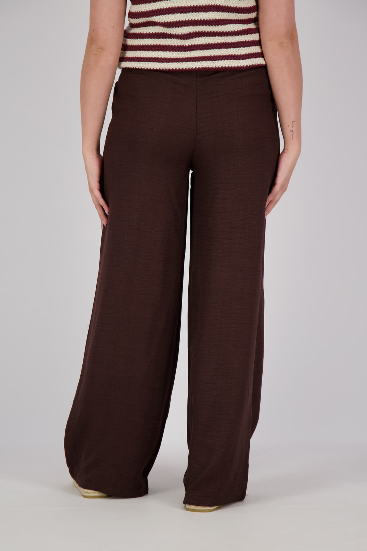 Broek van Ichi, lange broek met wijde pijp en een effen, donkerbruine kleur met subtiele structuur. De elastische taille met koord zit prettig en sluit makkelijk aan. Voorzakken geven ruimte voor kleine essentials. Combineer met een T-shirt en sneakers voor een casual set.