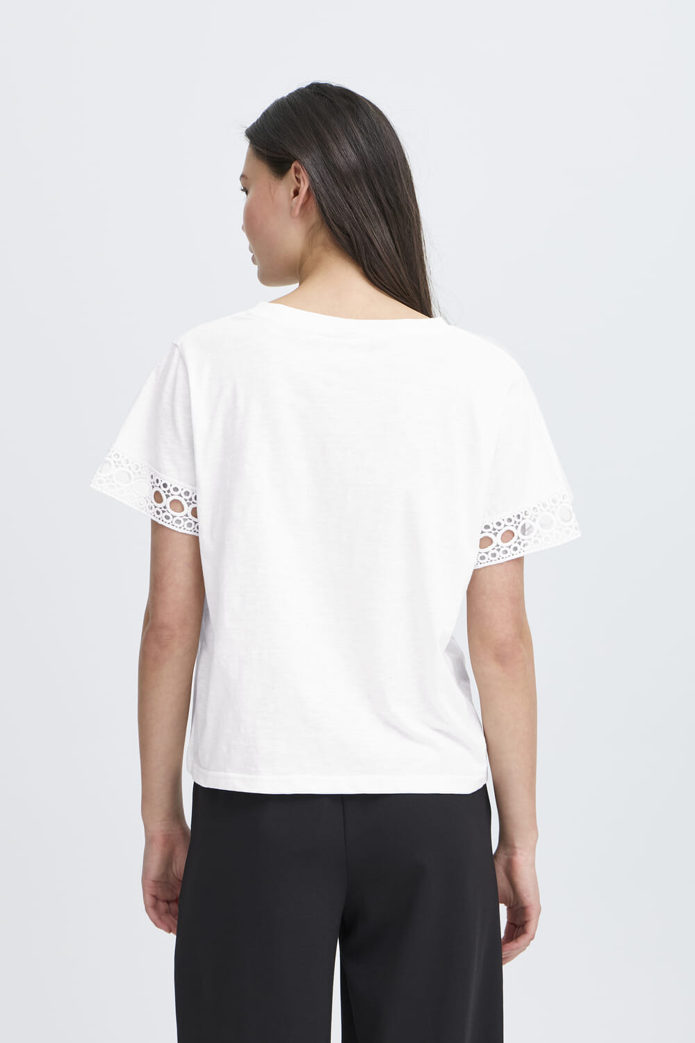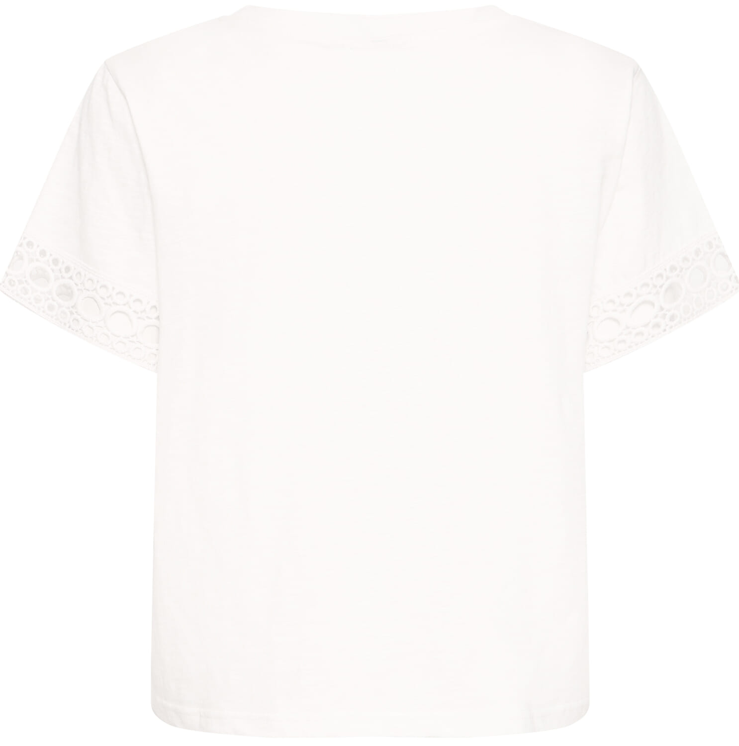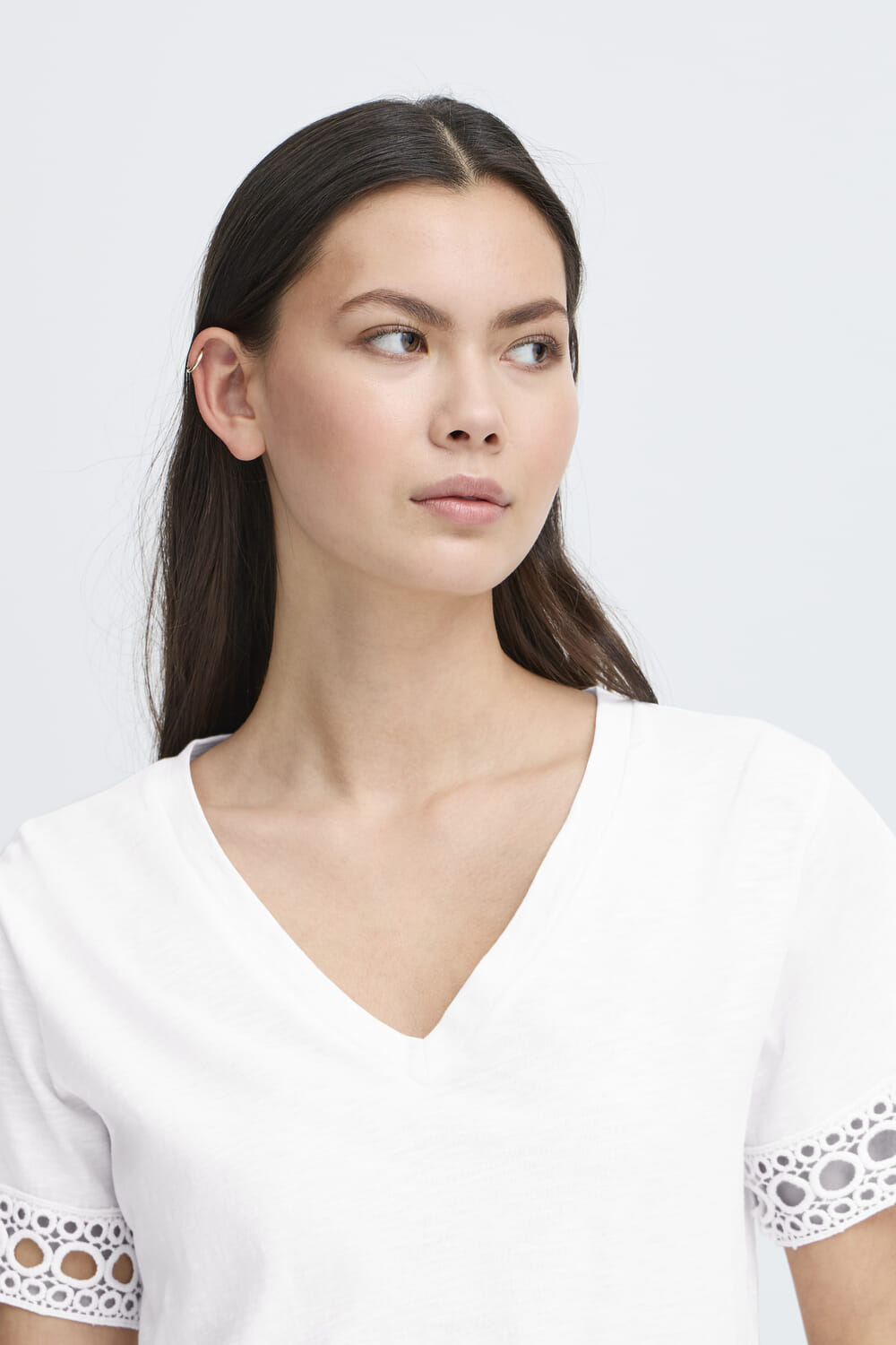 T-shirt Olya van Ichi is een casual dames T-shirt met een verfijnde uitstraling. Het heeft een elegante V-hals en korte mouwen met broderie anglaise details aan de manchetten. Dit effen shirt is ideaal voor casual gelegenheden en biedt een stijlvolle, comfortabele pasvorm.