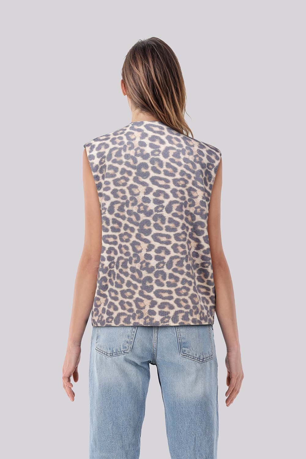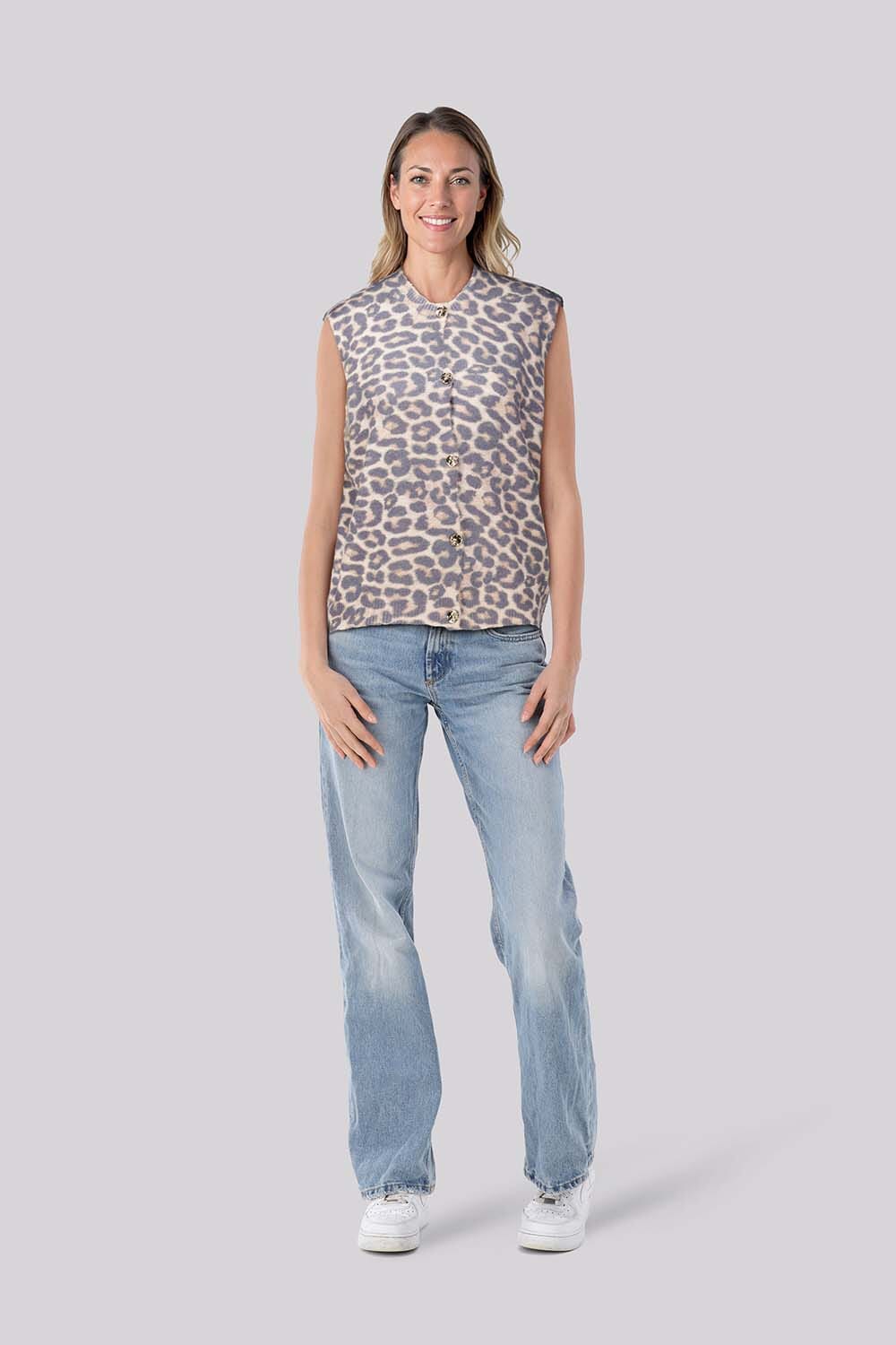 Gilet Fayen van In Shape is een casual vest met een opvallende panterprint. Dit stijlvolle item heeft een opstaande kraag, ronde halslijn en een losse pasvorm. De gilet sluit met knopen en is mouwloos, perfect voor een ontspannen, modieuze uitstraling.