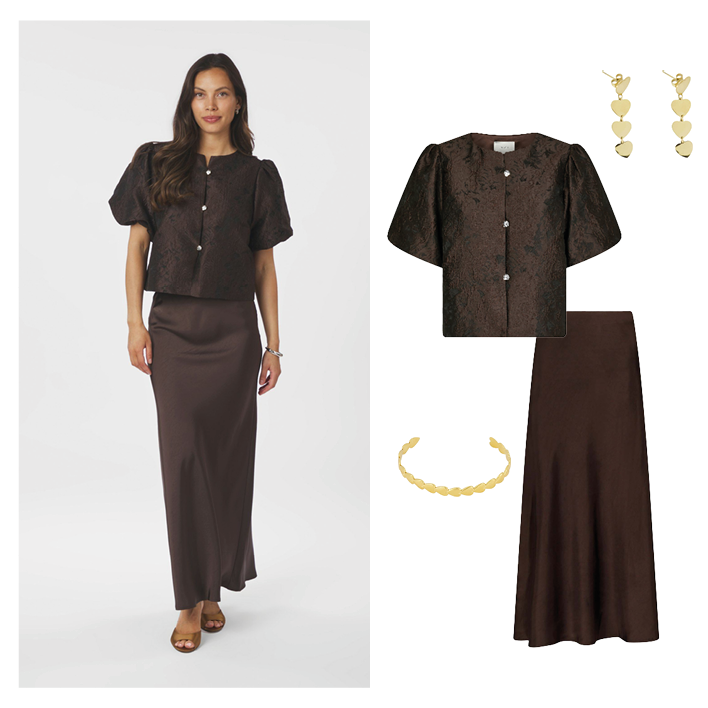 Deze Neo Noir feestoutfit in warme chocoladebruin is een ideale keuze voor wie houdt van luxe fabrics en verfijnde details. De Neo Noir jacquard top met kristalachtige knopen vormt een stijlvol duo met de Neo Noir satijnen maxi rok. De rijke tinten en feestelijke structuren passen volledig bij de kledingtrends voor december 2025.