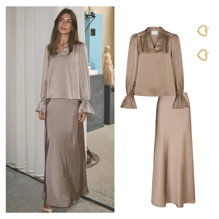 Deze look ademt Scandinavische elegantie, waar Neo Noir zo om bekend staat. De Neo Noir satijnen blouse met fijne glansdetails en de maxi rok met subtiele sparkles vormen samen een romantische en vrouwelijke feestlook die prachtig aansluit bij de feestdagen 2025 trends.