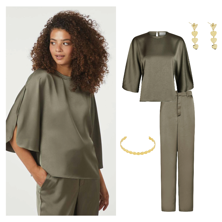 “Less is more”, maar dan met maximale luxe. Deze Neo Noir satijnen set bestaand uit een soepel vallende blouse gecombineerd met de bijbehorende pantalon in olijfgroen straalt rust en klasse uit, precies wat past bij de populaire quiet luxury trend voor 2025. De glanzende stof vangt prachtig het licht en geeft een decadente, maar stijlvolle feestlook.