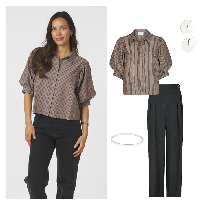 Ontdek een van de meest stijlvolle Neo Noir outfits voor de feestdagen 2025: een combinatie van een gestreepte Neo Noir blouse en een tailored pantalon. Deze look is ideaal voor dames die in december chique en comfortabel willen verschijnen. Perfect voor een kerstdiner op kantoor, zakelijke borrel of feestelijk familie-evenement.