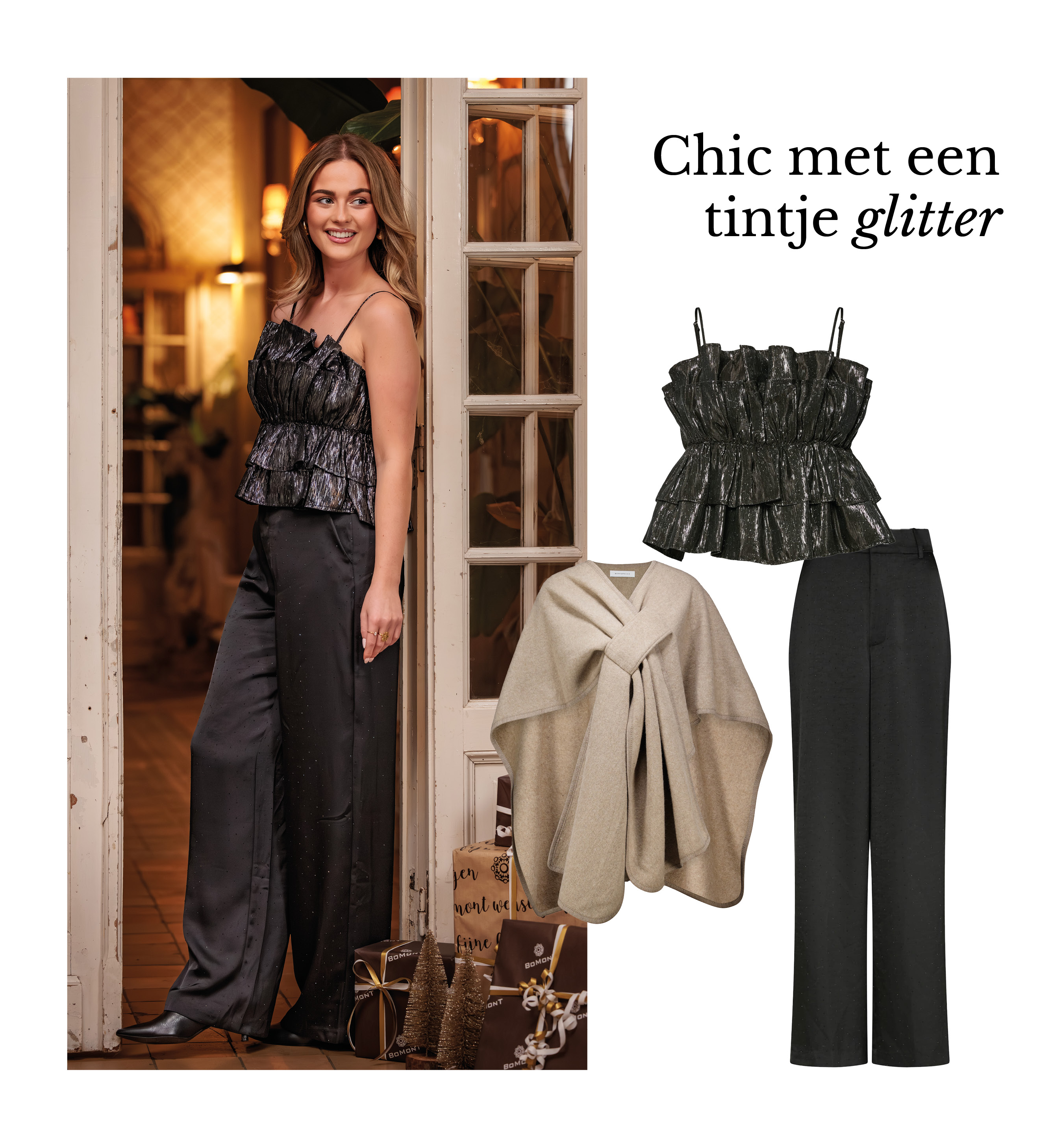 Om de look compleet te maken, is de cape van Rino & Pelle een ideale toevoeging. Overdag draag je ’m nonchalant voor een warme, cosy laag, en ’s avonds gooi je ’m makkelijk om je schouders wanneer de temperatuur daalt. Functioneel én stijlvol, zonder af te doen aan het chique karakter van de outfit.